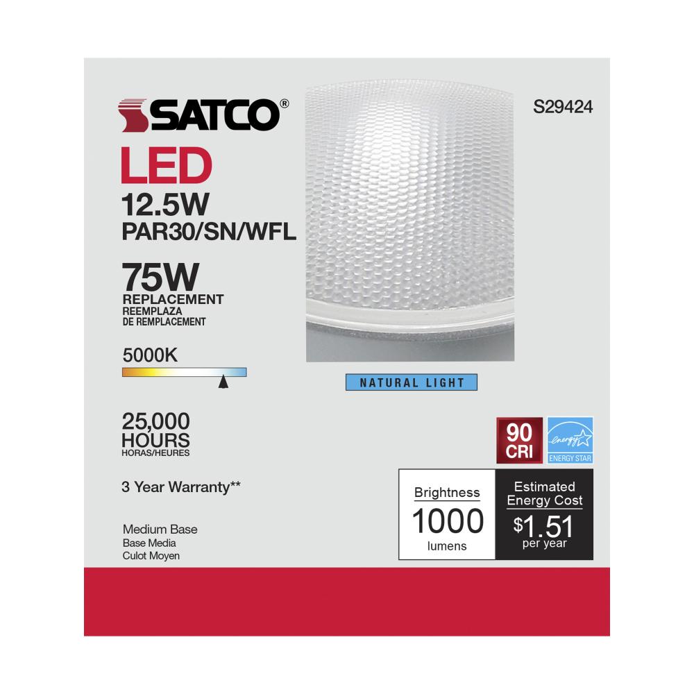 Satco's S29424 LED 12.5-watt, PAR30SN lamp maintains the familiar look of the Halogen PAR and Gen1 LED lamps they replace; but at 90 CRI and a higher lumens per watt ratio, it delivers superior light and improved efficiency. Designed for use in track,