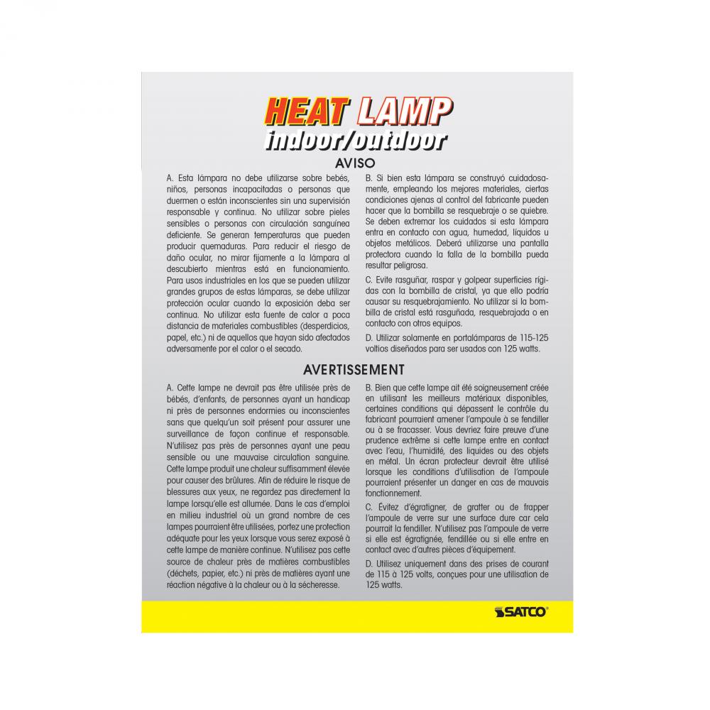 SATCO NUVO's S4759 incandescent heat lamp offers a reliable and versatile 125-watt heating solution, delivering focused warmth for various applications. Designed with a standard E26 medium base and operating at 120 volts, it emits a comforting glow ide