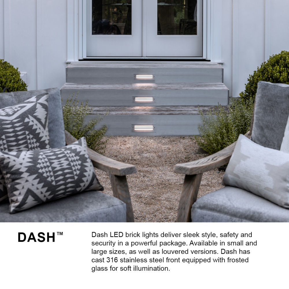 Dash LED brick and step lights deliver sleek style, safety, and security in a powerful package. Available in small and large sizes, as well as flat and louvered versions, Dash features a cast 316 stainless steel front equipped with frosted glass for soft illumination.
