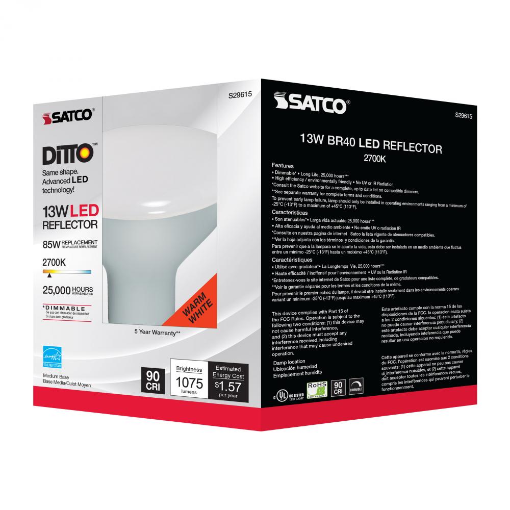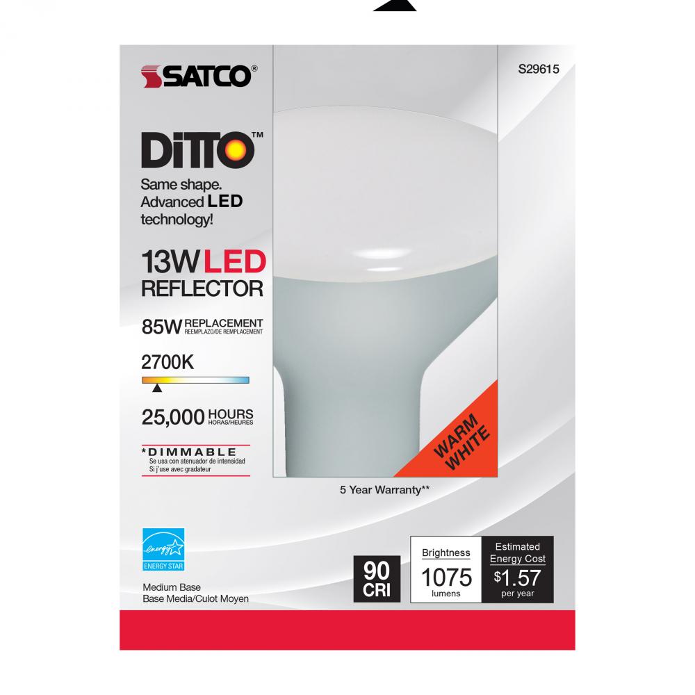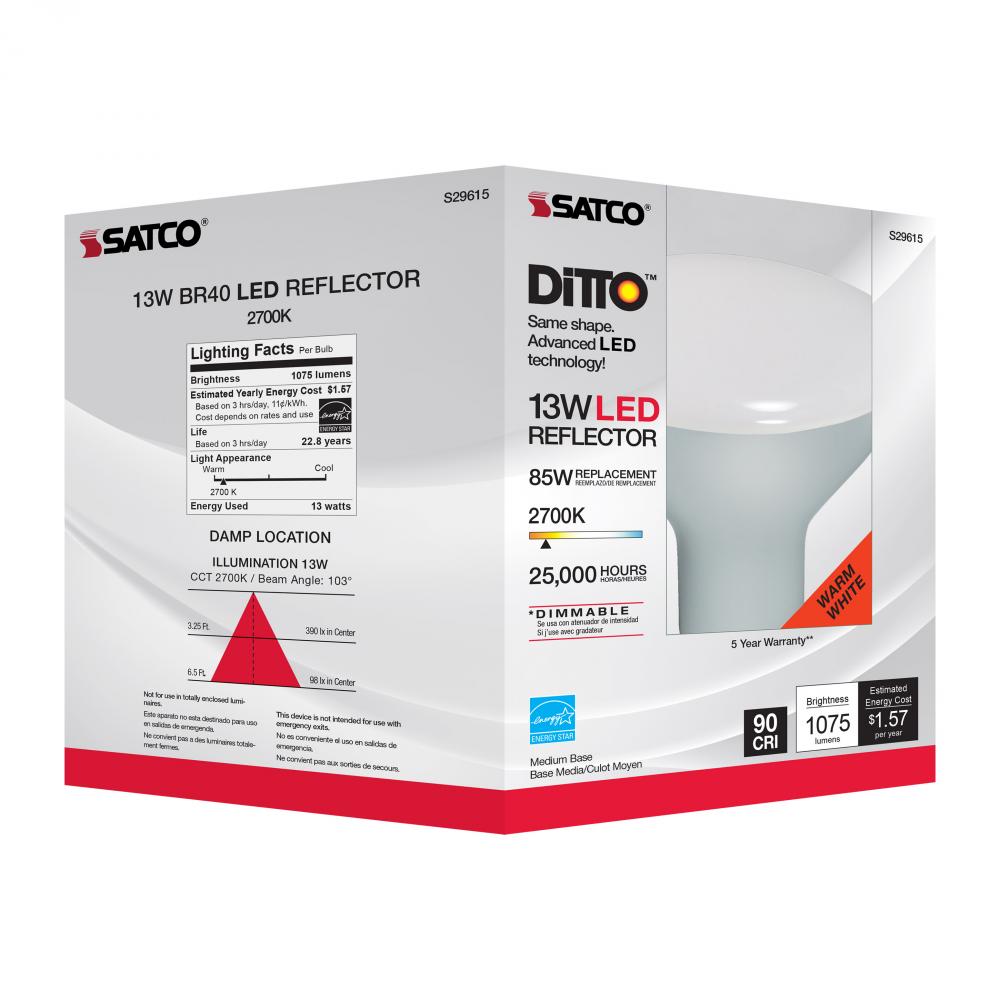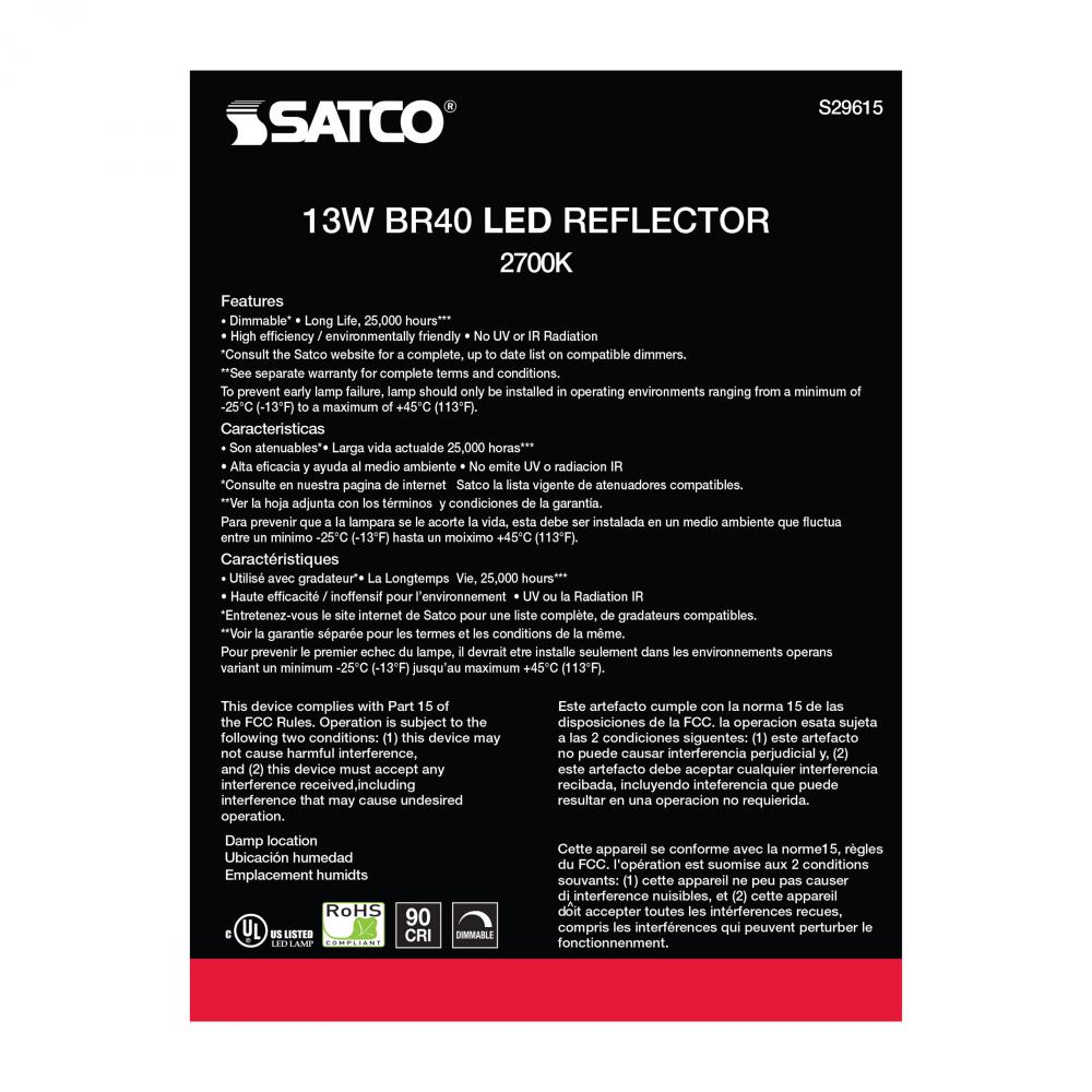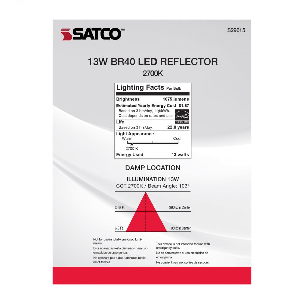 Satco's S29615 13-watt BR40 LED lensed lamp offers warm white light and a 103 degree beam spread. This LED reflector is an energy efficient lighting solution for residential and commercial applications. Dimmable and long lasting, this frost finished bu