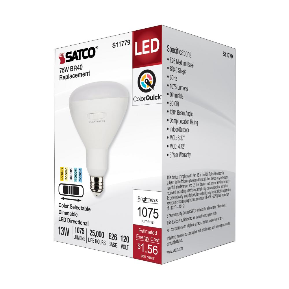 SATCO NUVO's S11779 13-watt LED BR lamp is the perfect lighting solution for a range of indoor spaces. CCT selectable, choose from 2700/3000/3500/4000/5000K color temperatures at installation to create the perfect ambiance for any room. With an impress