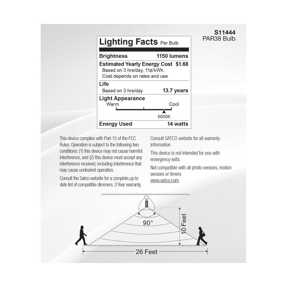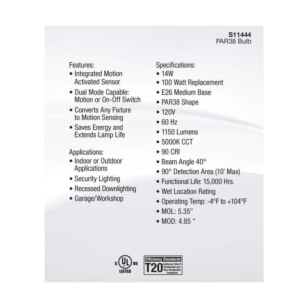 Illuminate your surroundings with SATCO NUVO's advanced S11444 PIR 14-watt, PAR38 LED screw-base lamp featuring an integrated motion sensor. With this lamp, you can easily turn any space into a motion-activated light source without requiring additional