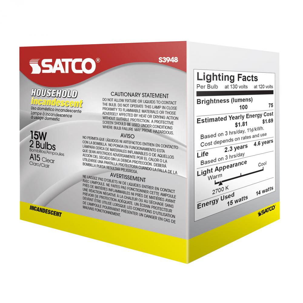 15 Watt A15 Incandescent; Clear; 2500 Average rated hours; 100 Lumens; Medium base; 130 Volt; 2/Pack