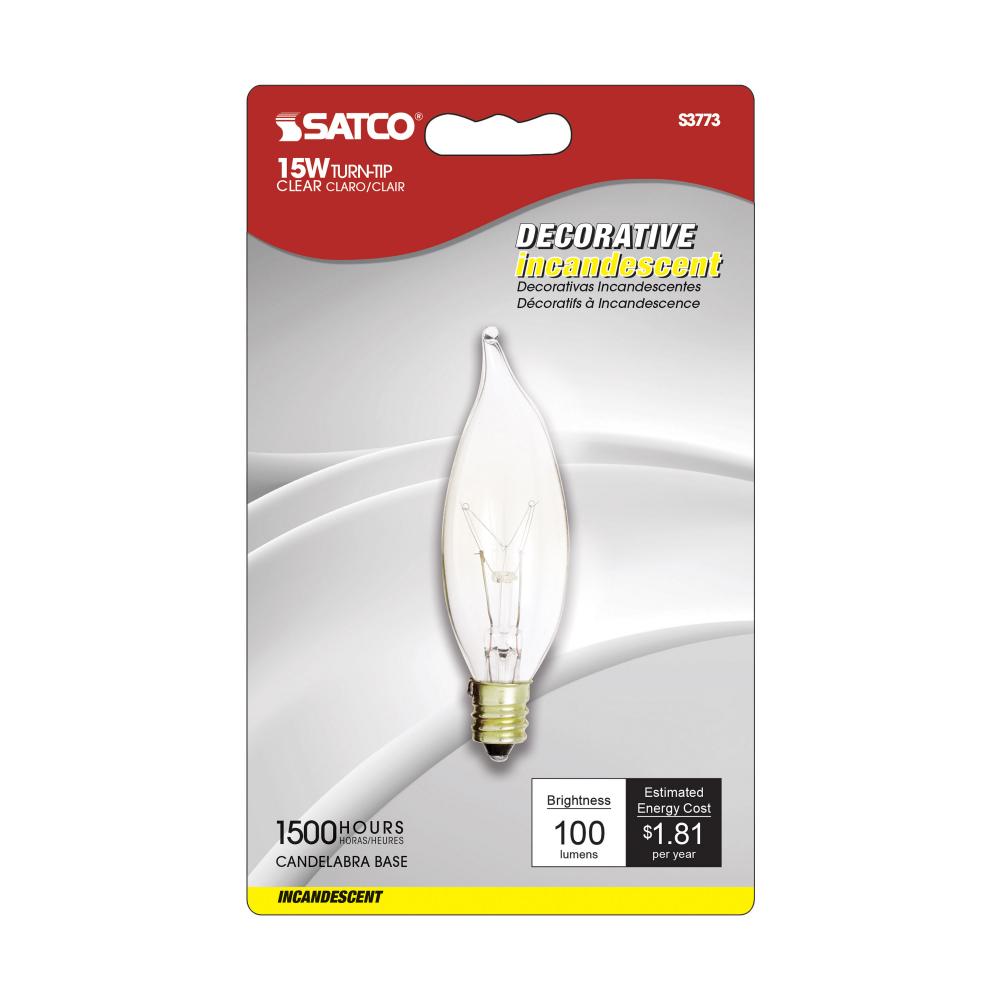 15 Watt CA8 Incandescent; Clear; 1500 Average rated hours; 100 Lumens; Candelabra base; 120 Volt;