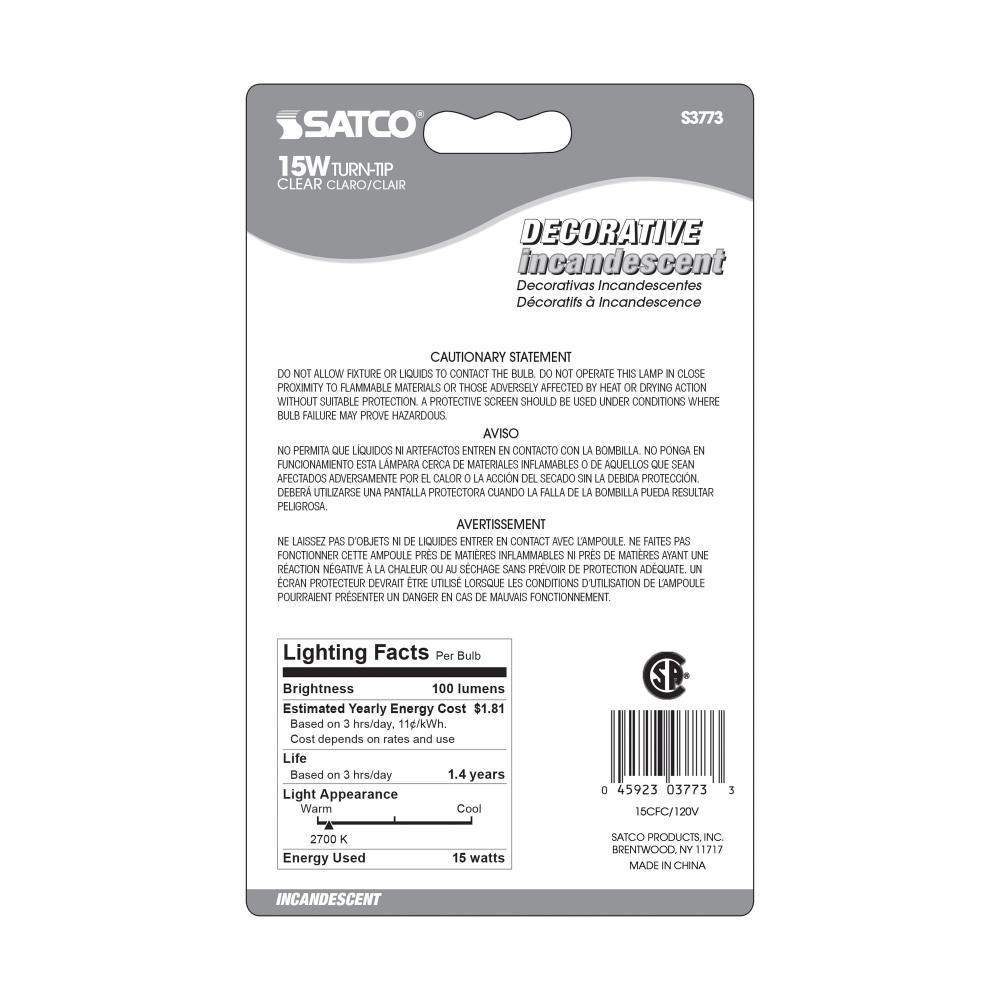 15 Watt CA8 Incandescent; Clear; 1500 Average rated hours; 100 Lumens; Candelabra base; 120 Volt; 2-Card