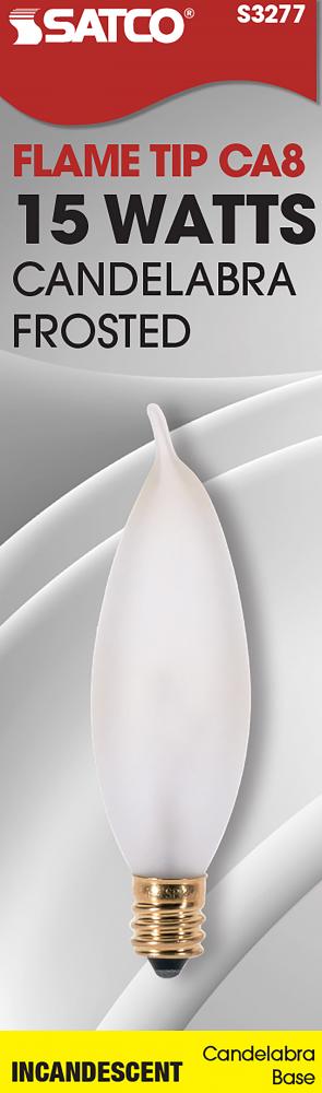 15 Watt CA8 Incandescent; Frost; 1500 Average rated hours; 95 Lumens; Candelabra base; 120 Volt