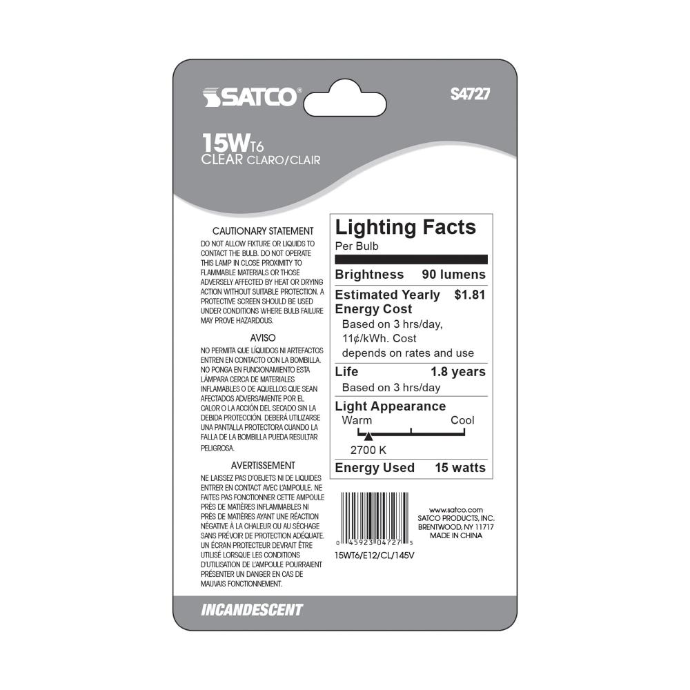 15 Watt T6 Incandescent; Clear; 2000 Average rated hours; 90 Lumens; Candelabra base; 145 Volt; Carded