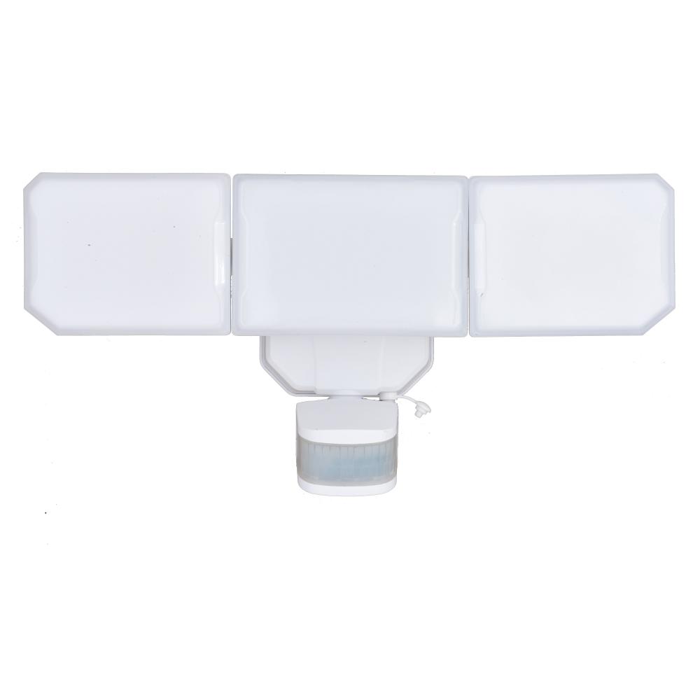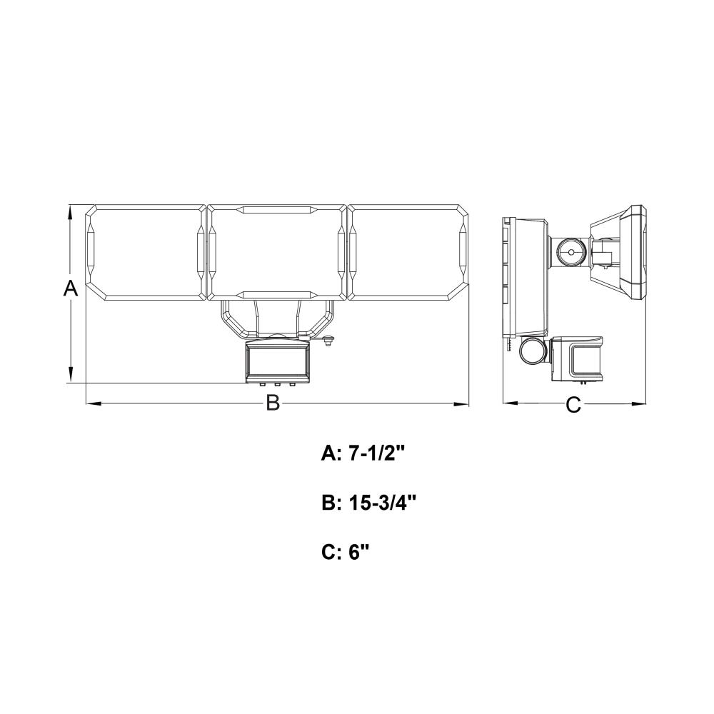 This 3-light integrated LED solar outdoor motion sensor security light provides dual-level lighting: ambient 2700K low-level lighting overnight and 5000K full brightness high level when motion is detected. The light heads and sensor are fully adjustable and automatically deliver 2500 lumens to illuminate your home’s exterior with warm ambient light at dusk, then instantly brighten when motion is detected. The included solar panel is equipped with a 16 foot connecting wire to allow for positioning in maximum sunlight for solar power or optional battery backup power with 3 x 1.5V C-Type Alkaline batteries (not included) keeps your lights powered no matter the weather. Customize your lighting options with 2 modes of operation plus adjustable motion sensor sensitivity. Suitable for wall or eave mounting with a wide 240 degree detection area and up to 50 feet. This Dualux security flood light expands the functionality, safety, and security of your home’s outdoor spaces with bright, reliable light when and where it’s needed.