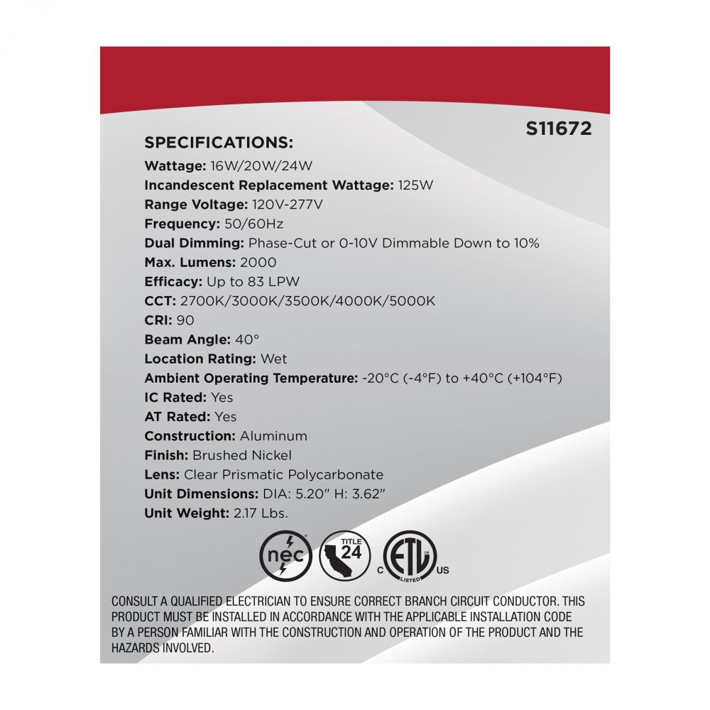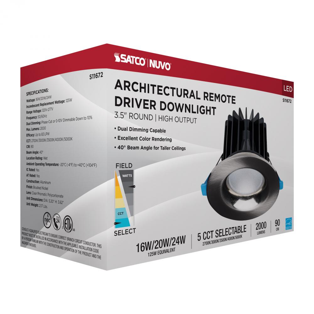 16/20/24 Watt LED Remote Driver Downlight; 27K/30K/35K/40K/50K CCT; Field Selectable; Round; Brushed Nickel Finish; Dual Dimming; 120-277 Volt