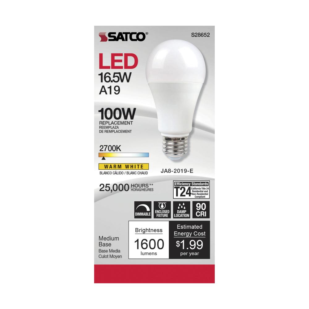 Satco's S28652 16.5-watt, A19 LED lamp is a sleek lighting solution for residential or commercial applications. Illuminate living rooms, dining rooms, hallways, and office spaces with this elegant white bulb. Dimmable and versatile, this lamp delivers