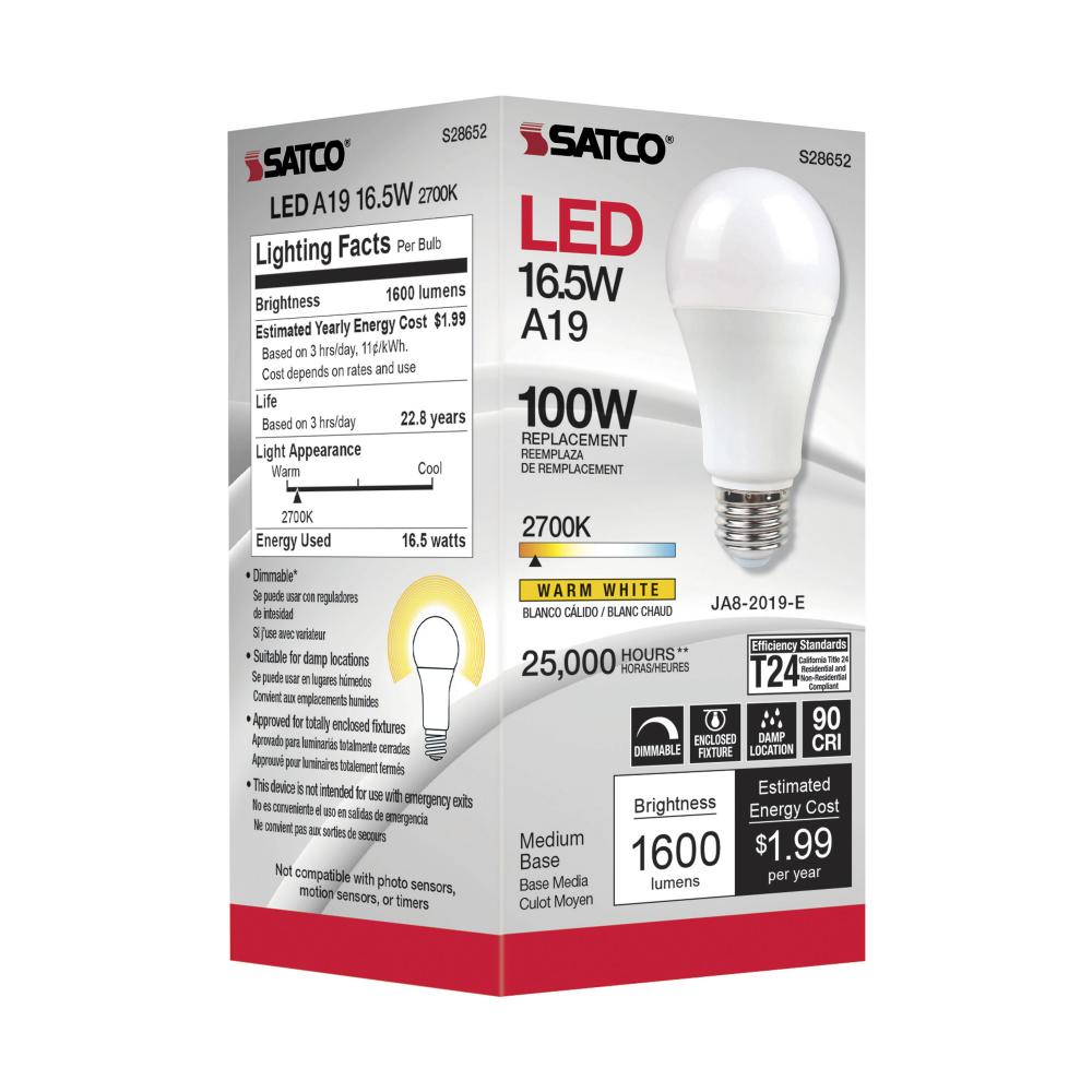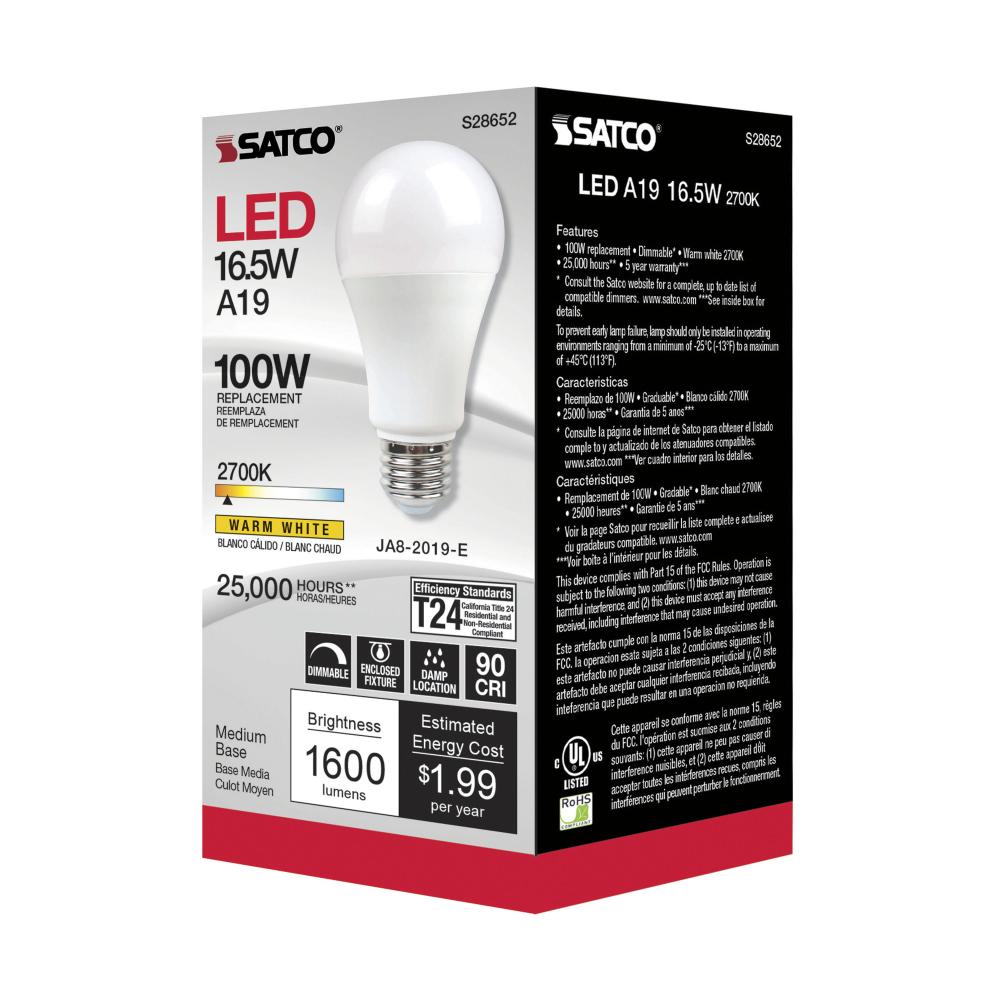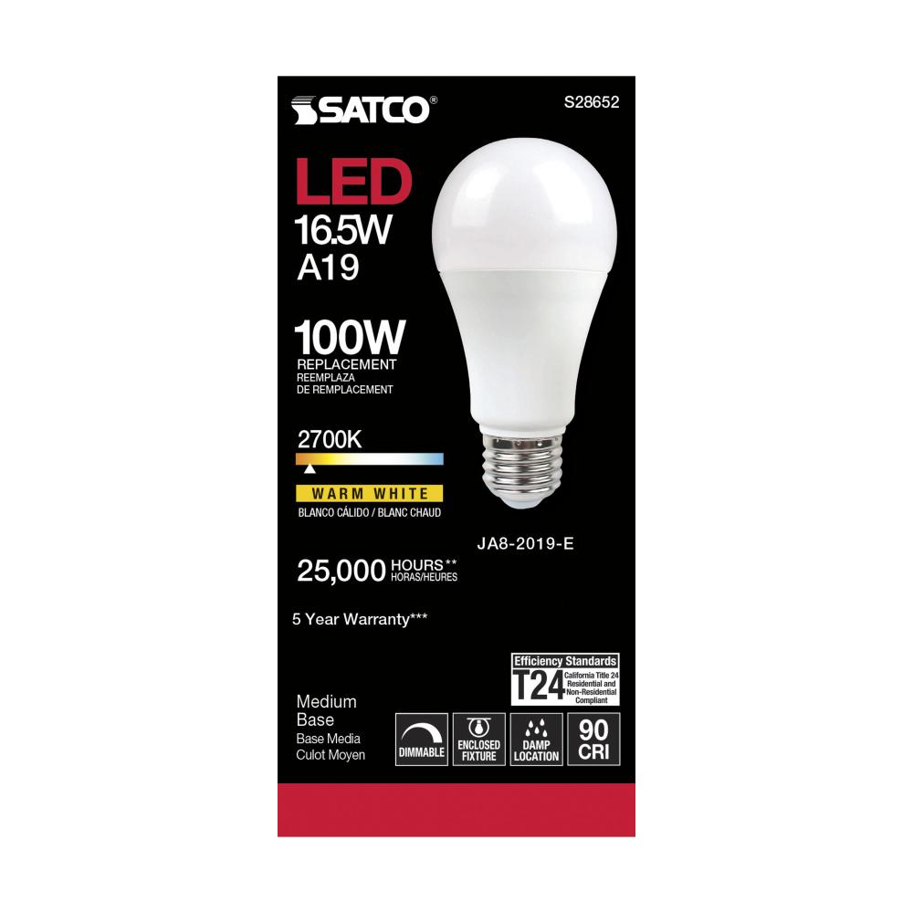 Satco's 16.5-watt, A19 LED lamp is a sleek lighting solution for residential or commercial applications. Illuminate living rooms, dining rooms, hallways, and office spaces with this elegant white bulb. Dimmable and versatile, this lamp delivers 25,000