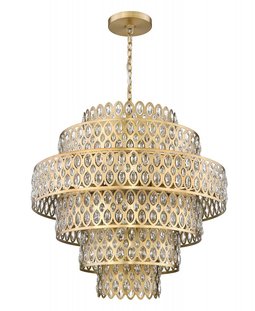 Briming with treasured glamour and elegance, this Dealey collection 17-light pendant delivers an impressive six-tiered design that glitters over a staircase or in a grand dining room. Each tier features an heirloom brass finish drum complete with oval cutout filled with sparkling crystals that create a magical ambiance that takes surrounding decor to new design heights.
