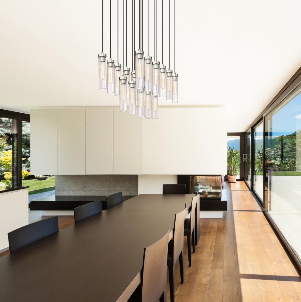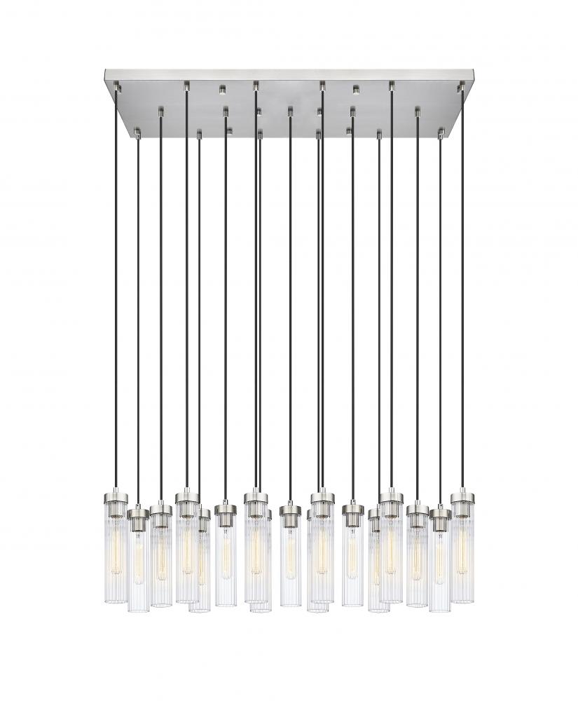 Customize a modern space through the organic artistry of lighting, choosing this 17-light chandelier to highlight an island, bar, or living area. Delicate fluted glass shades arrange in a minimalist silhouette with maximal impact, offering an organic perspective. Cool brushed nickel finish metal comes to life in a sleek canopy when bulbs are illuminated, creating a reflective effect.