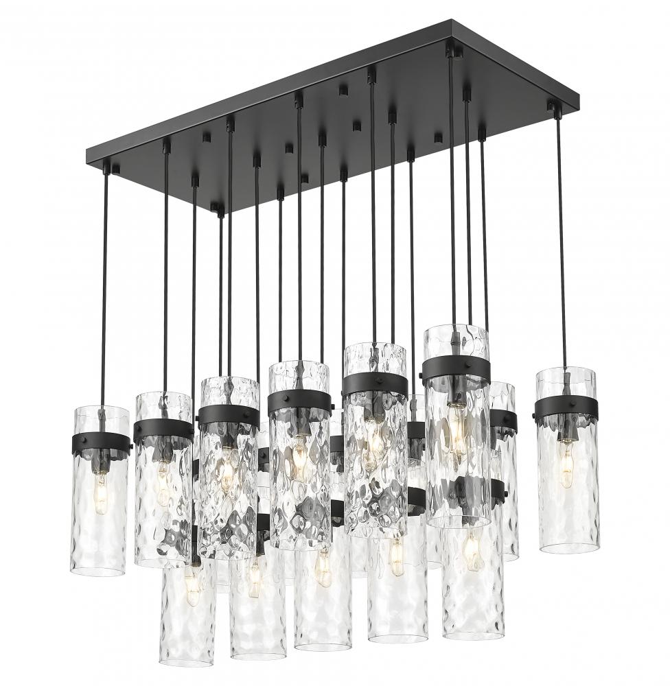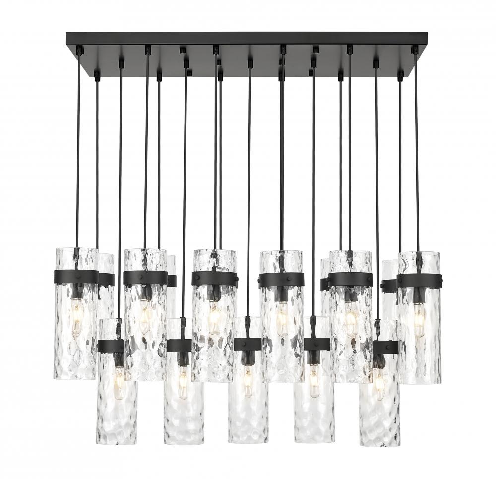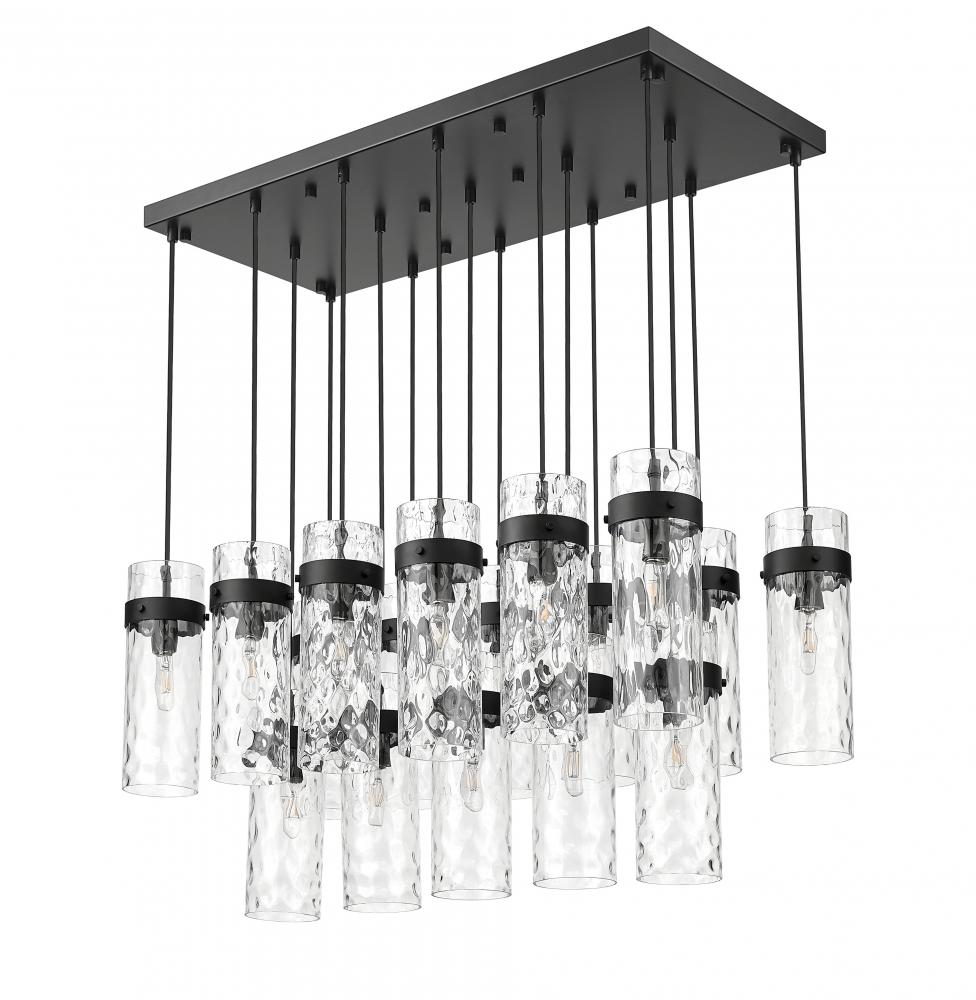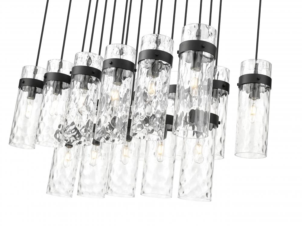 Enhance a linear living space with the clean, refined presentation of this modern 17-light chandelier. Perfect for a dining table or grand entry, it boasts a matte black finish over its canopy and individual collars, which complement cylindrical shades. Shades are expertly crafted in rippling, clear water glass, casting inviting illumination over your sophisticated space.