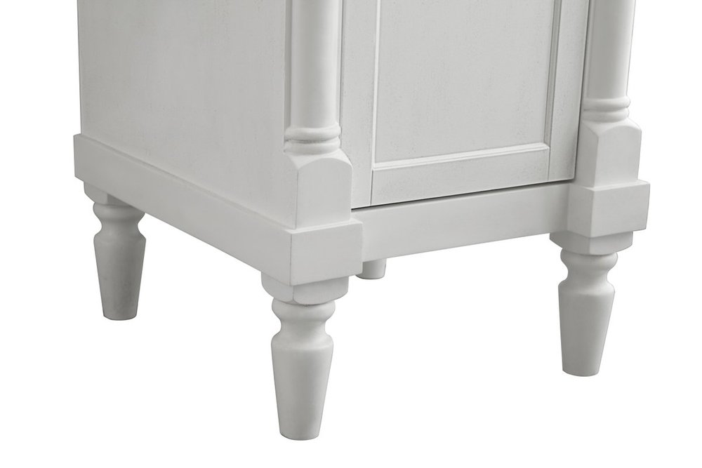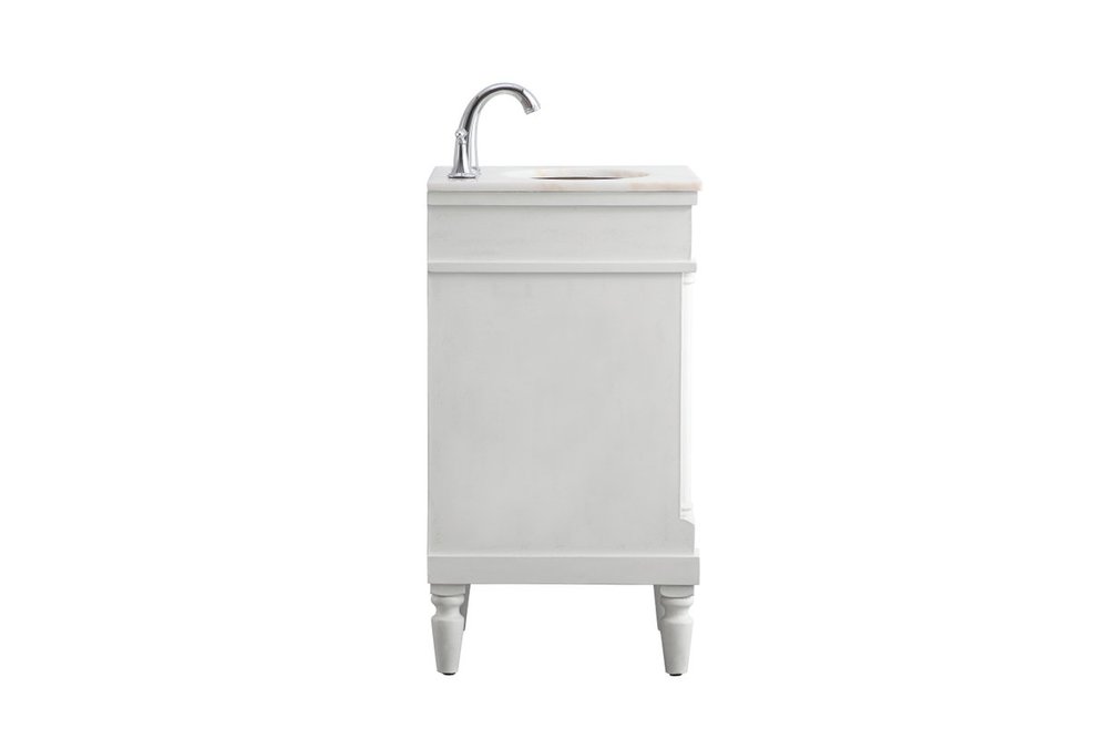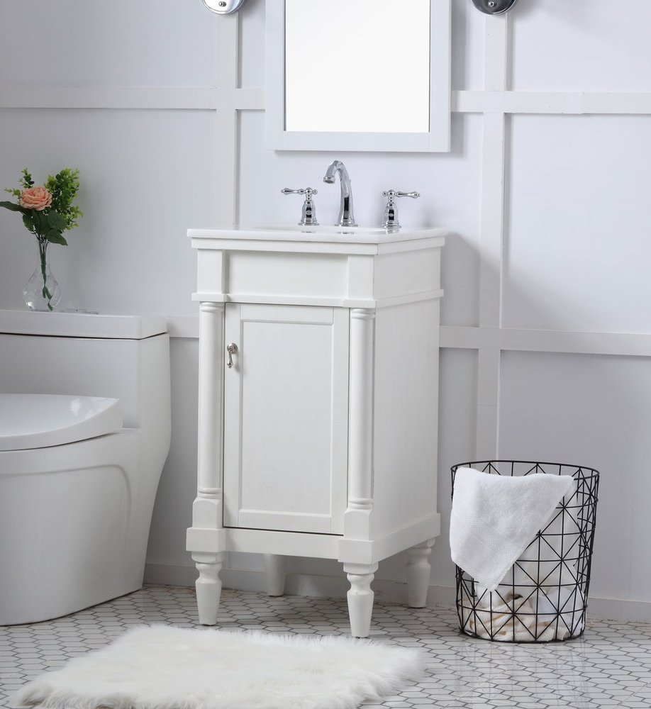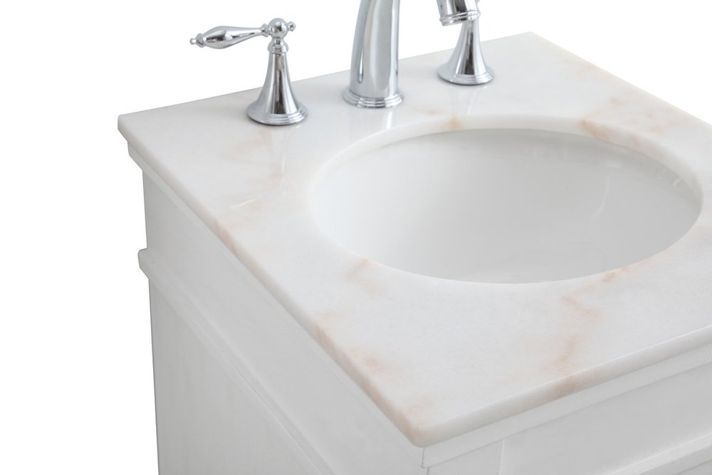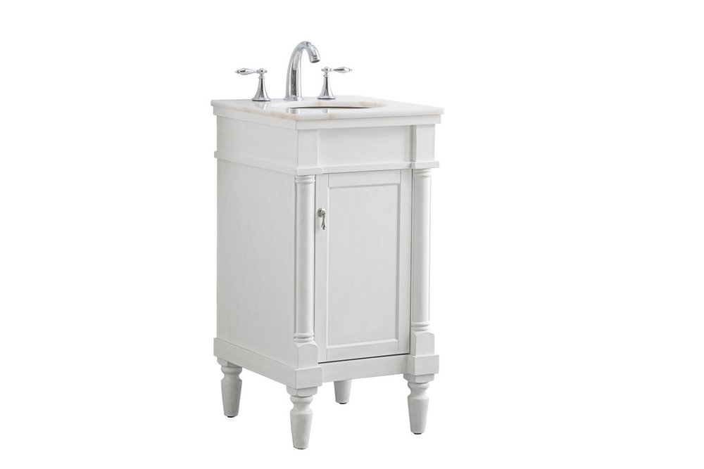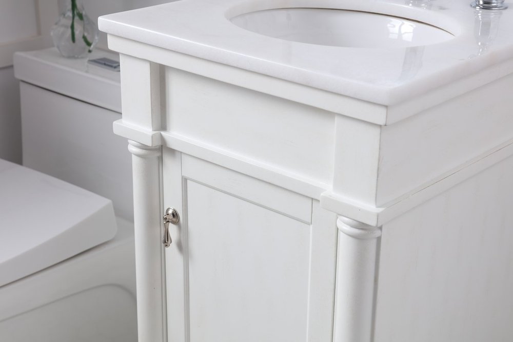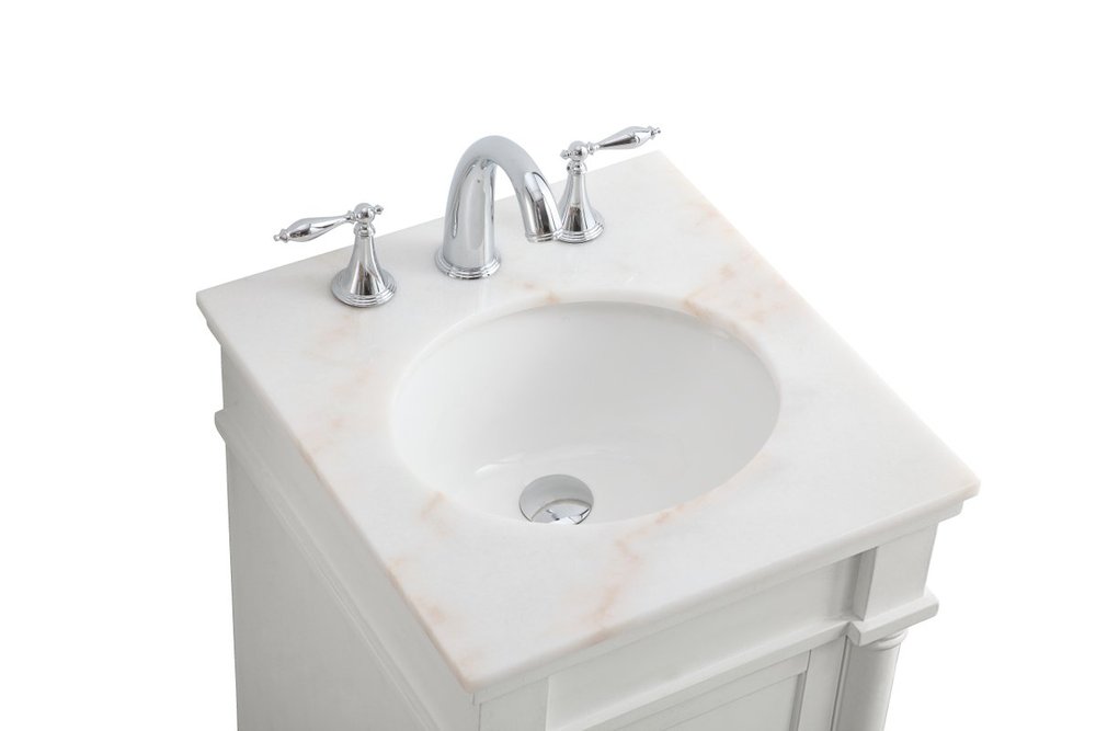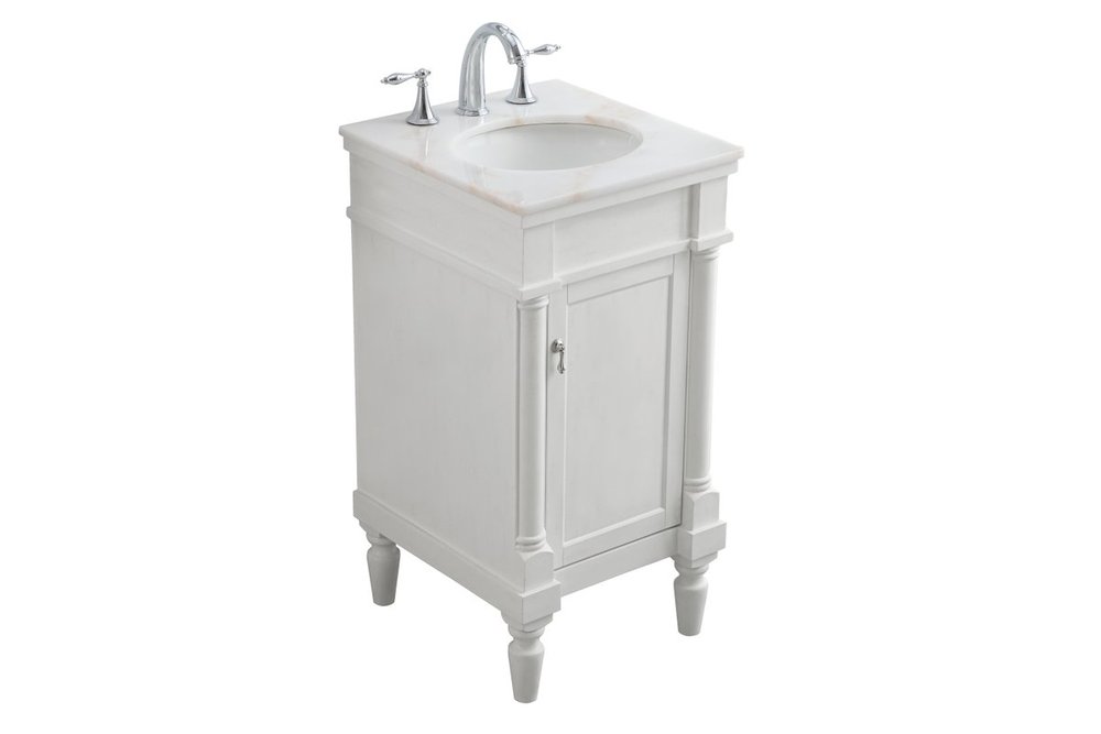 This traditionally styled, yet fashionably designed vanity can add distinction and grace to your home or office bathroom. Beautifully combining a lustrous white marble countertop with an oval white porcelain under mount sink, and a hand painted antique white Single-door cabinet with a shelf inside, brushed steel door pulls, standing on turned, tapering legs. You’ll enjoy its charming allure for many years to come. Measurements: W18" x D19” x H35”
