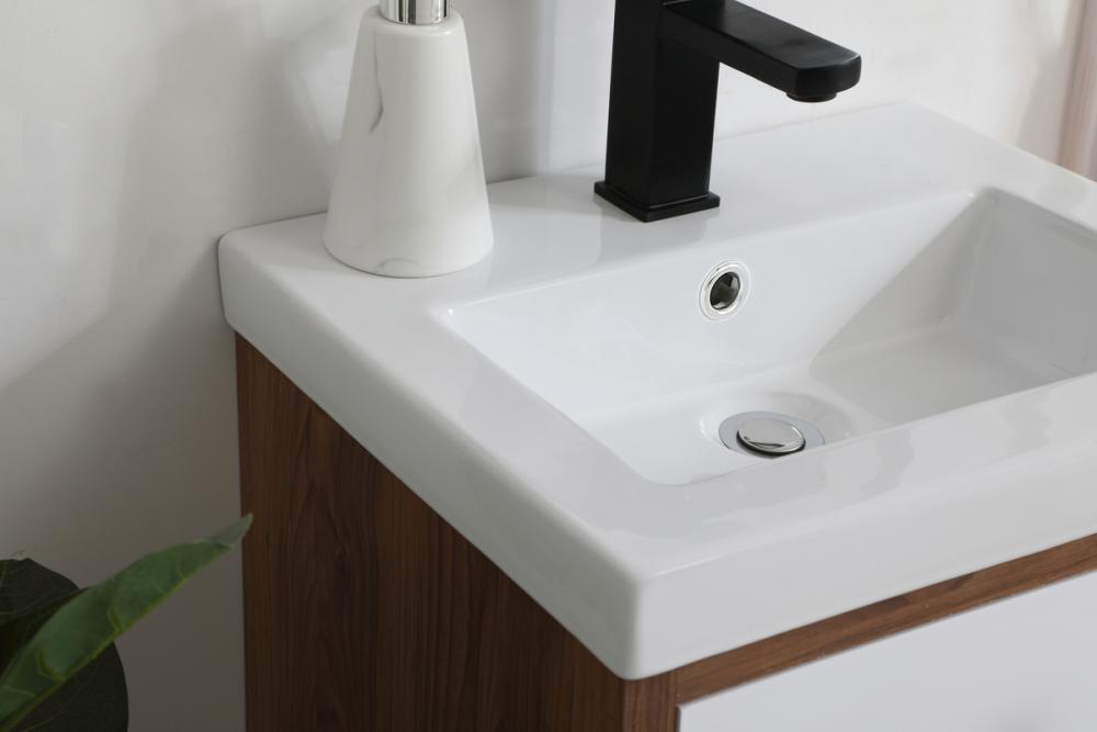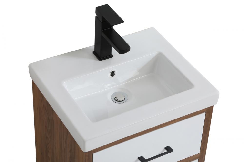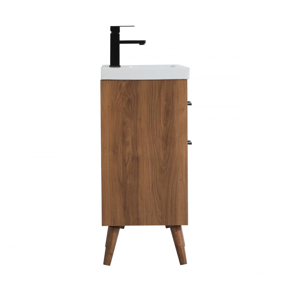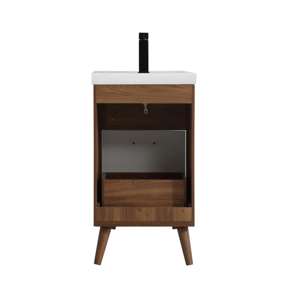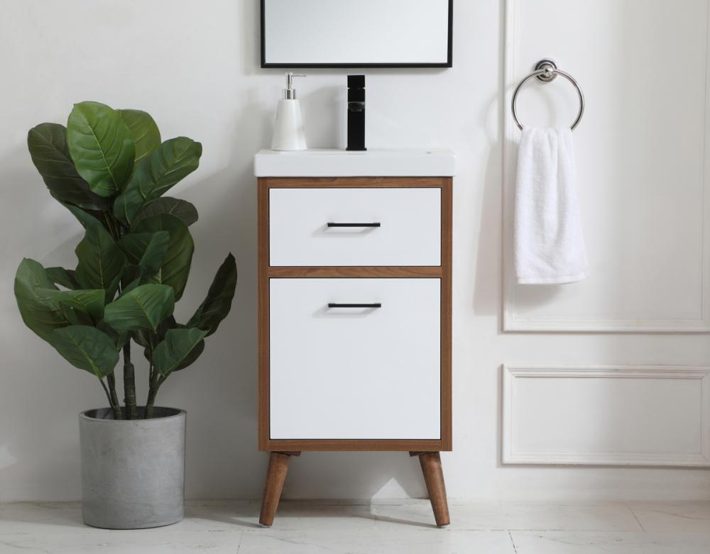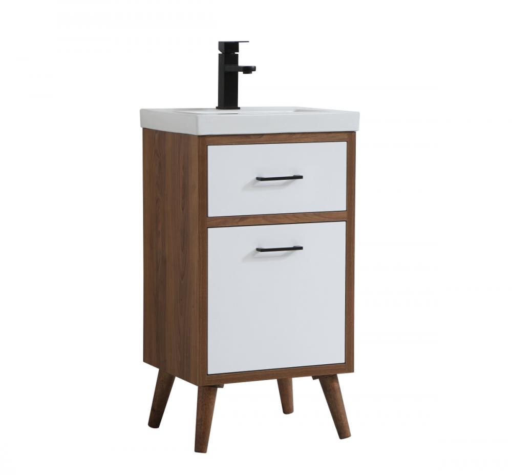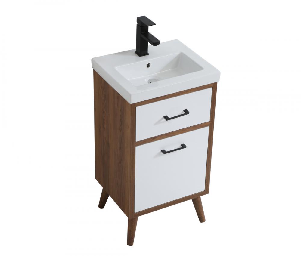 Delve into a world of minimalistic fashion and contemporary styling with this midcentury modern 18" vanity. The clean lines anchors the design, while the oblique tapered cylinder legs add subtle interest. A black handle adorns the top fake drawer hiding the base of the porcelain sink while another one allows you to pull the bottom drawer out, letting you store your bathroom necessities and toiletries. The compact size makes it the perfect vanity for any bathroom or powder room, regardless of size.