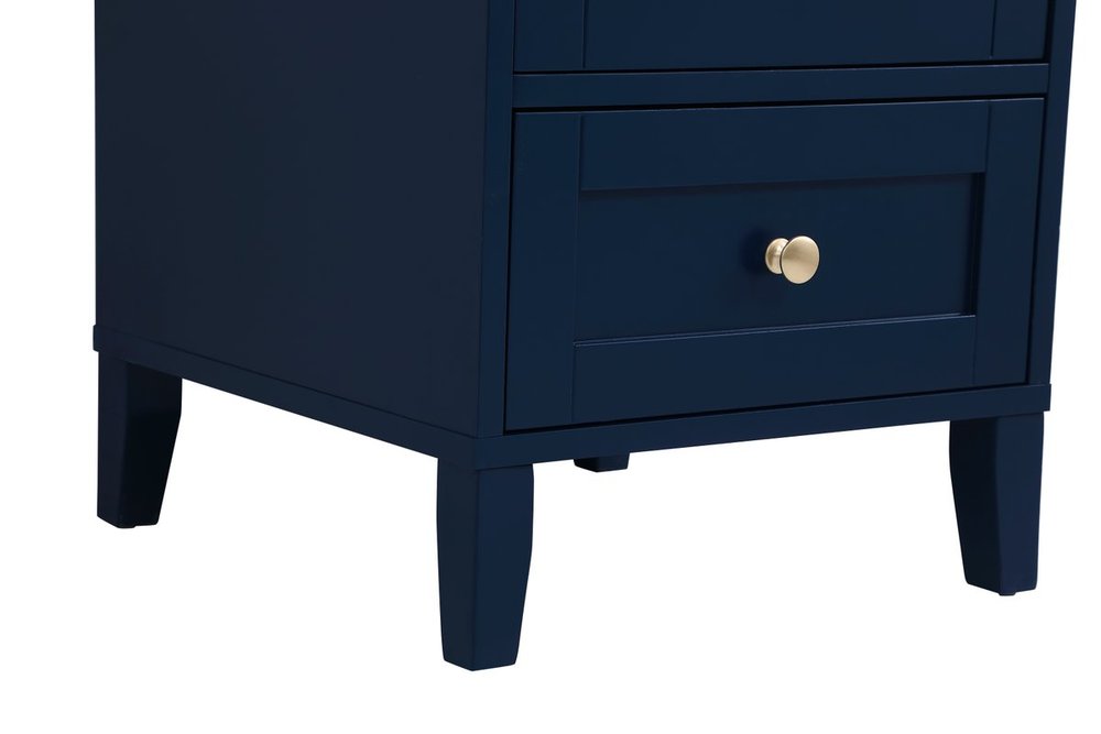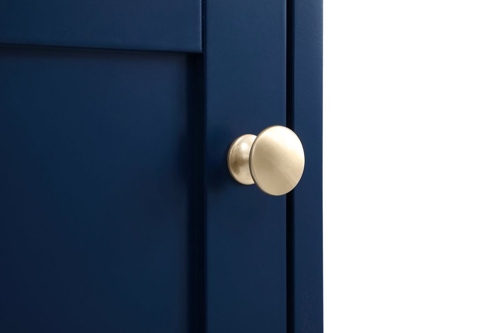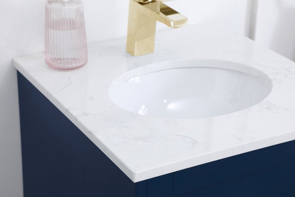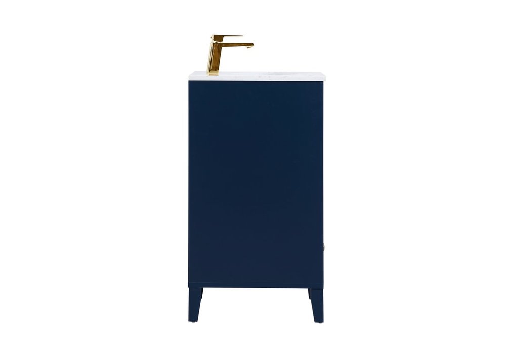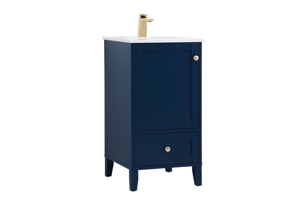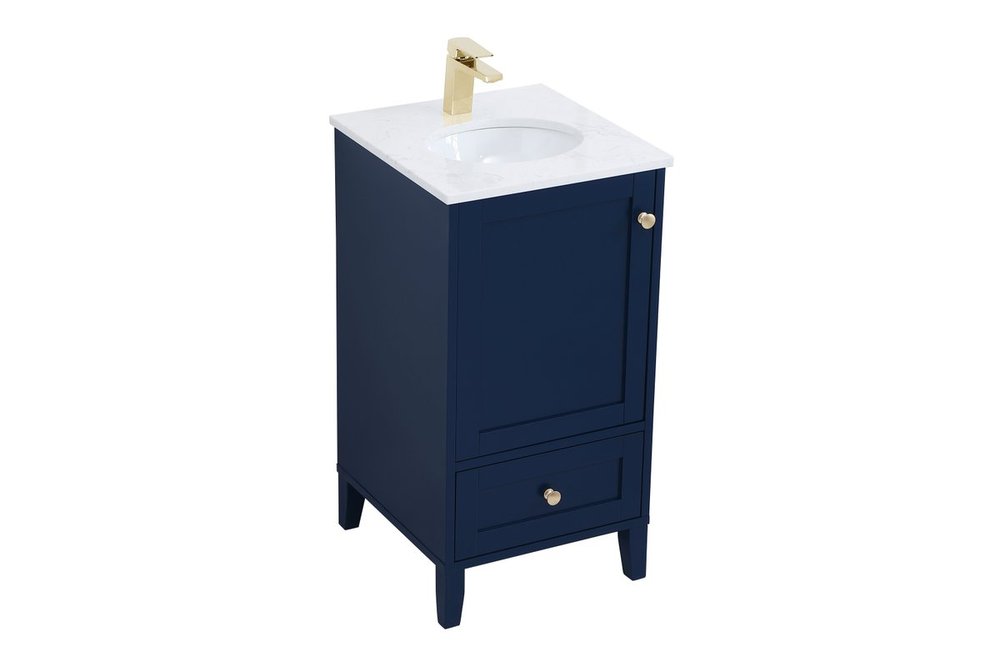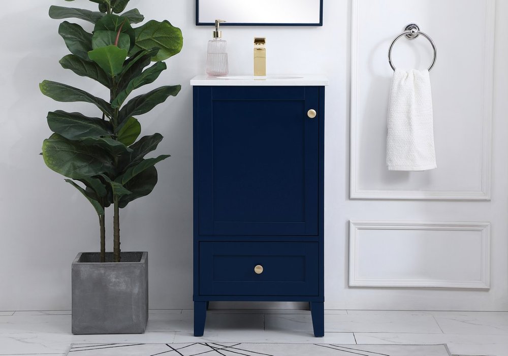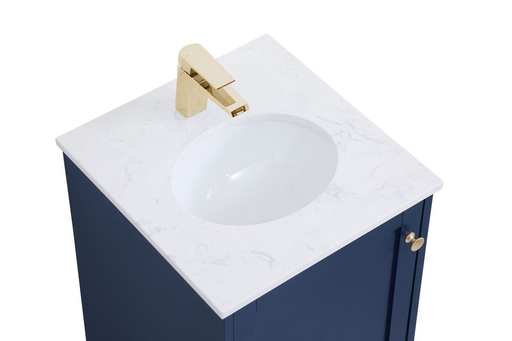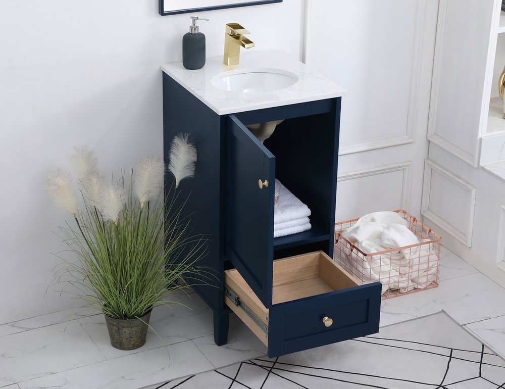 While unassuming, this 18" vanity in a Blue finish sure knows how to redefine luxury. The sleek gold knobs adorn the Single cabinet door and base drawer which allows you to store your bathroom toiletries and necessities. Standing strong on oblique legs and dressed with a Calacatta engineered marble countertop, this vanity will surely create beauty and casual elegance in your bathroom or powder room.