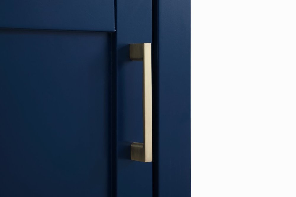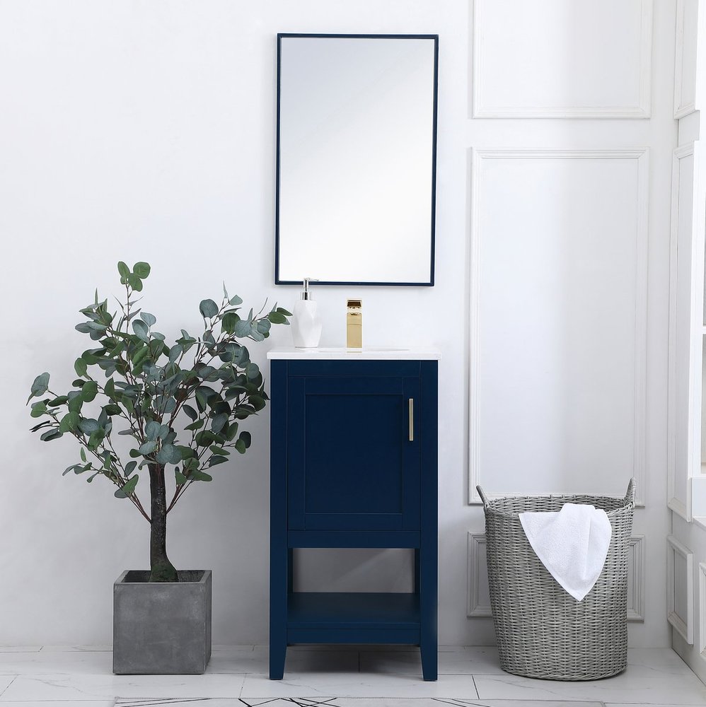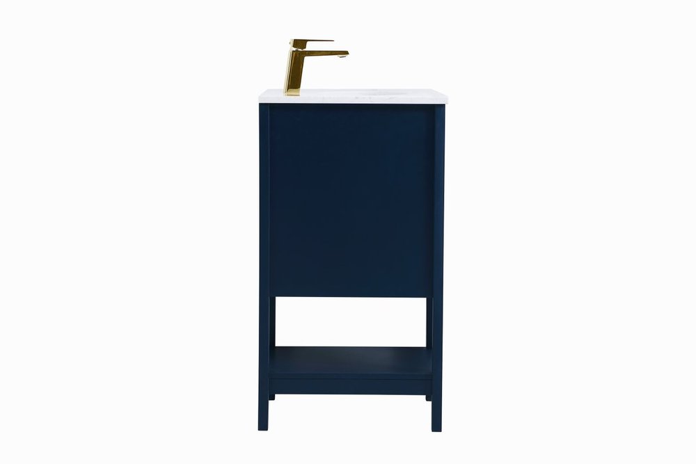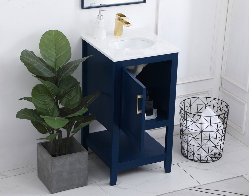 The nonchalant attitude of this 18" traditional Blue finish vanity will have you wanting more. The slender gold handle bar open the cabinet door to reveal an ample storage space to put away and store bathroom essentials, and the open space below allows for you to place clean towels on the rack. Topped with a Calacatta engineered marble countertop, you and your guests will enjoy this easy going vanity.
