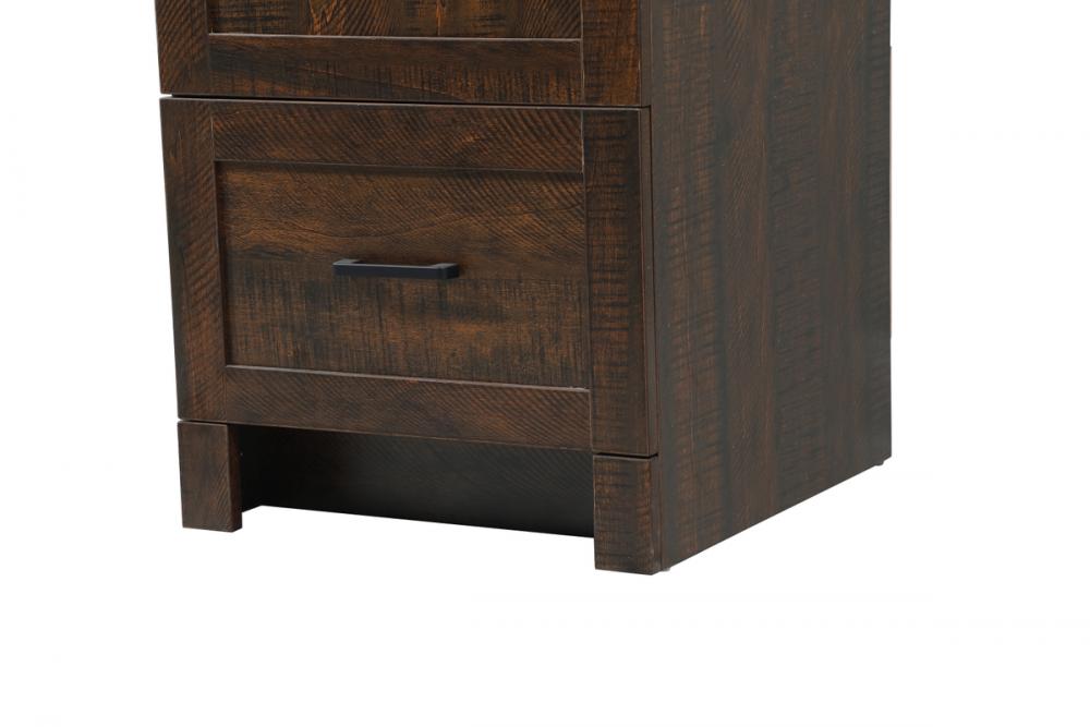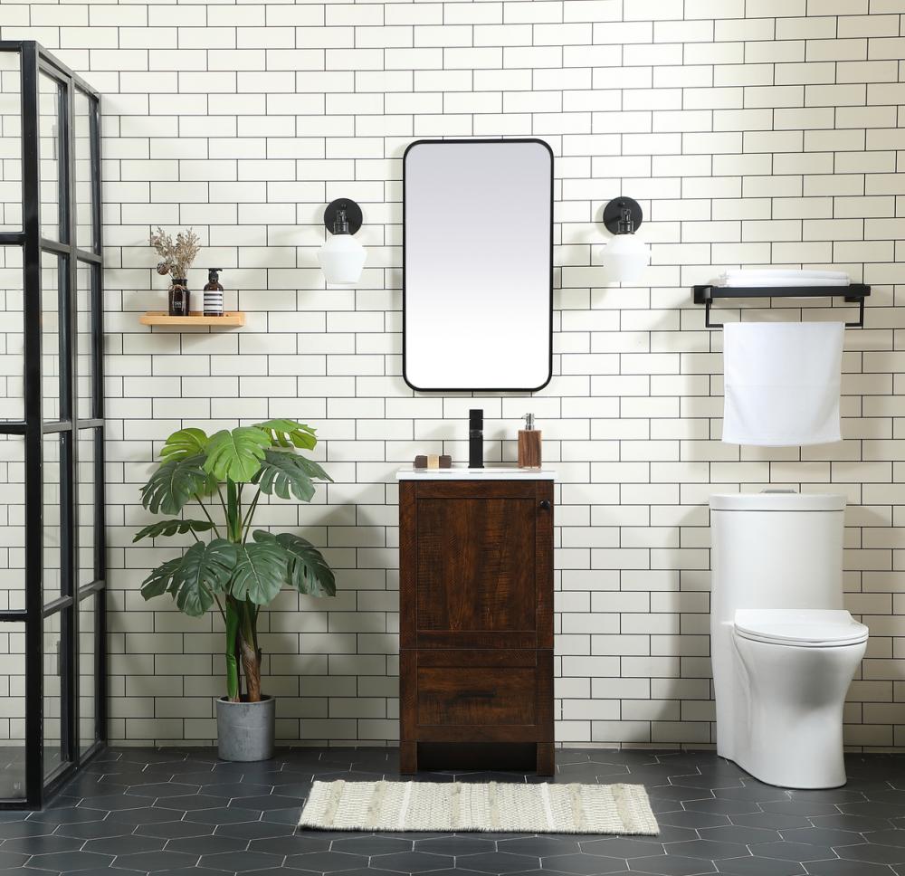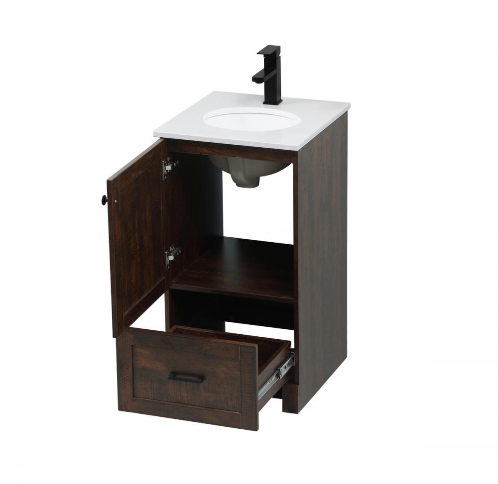 Delve into a world of minimalistic fashion and contemporary styling with this farmhouse 18" vanity. The clean faux lines anchors the weathered design. Black handle adorns the door hiding the base of the integrated porcelain sink while the bottom drawer allows you to store your bathroom necessities and toiletries. The compact size makes it the perfect vanity for any bathroom or powder room, regardless of size.
