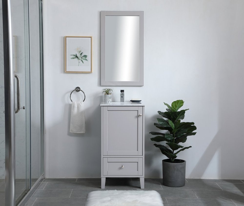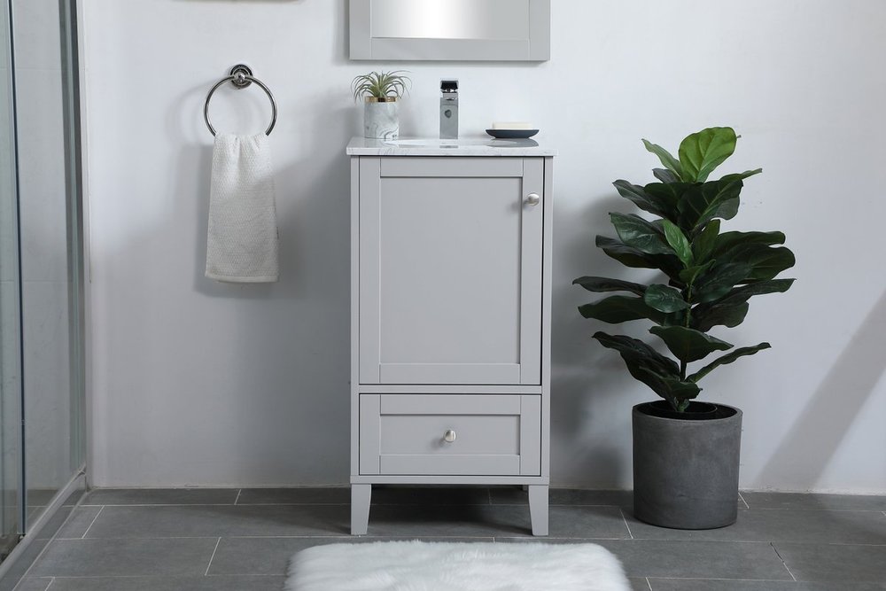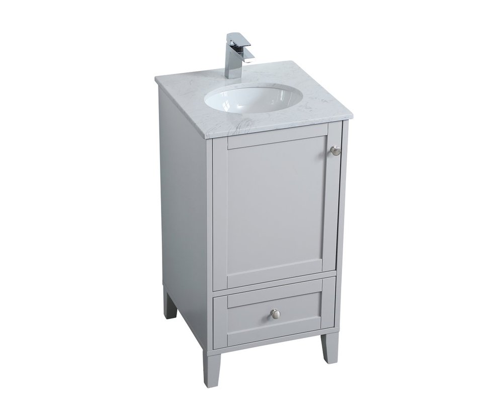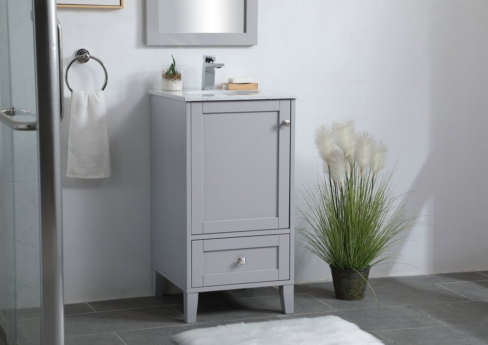 While unassuming, this 18" vanity in a grey finish sure knows how to redefine luxury. The sleek brushed nickel knobs adorn the Single cabinet door and base drawer which allows you to store your bathroom toiletries and necessities. Standing strong on oblique legs and dressed with a Calacatta engineered marble countertop, this vanity will surely create beauty and casual elegance in your bathroom or powder room.