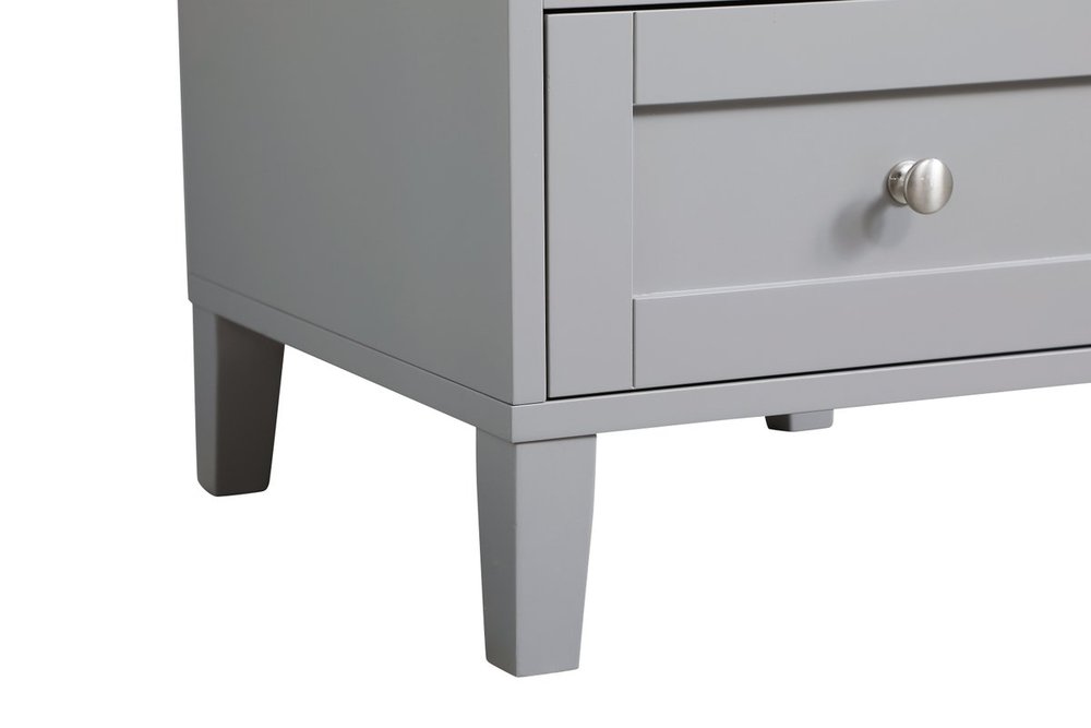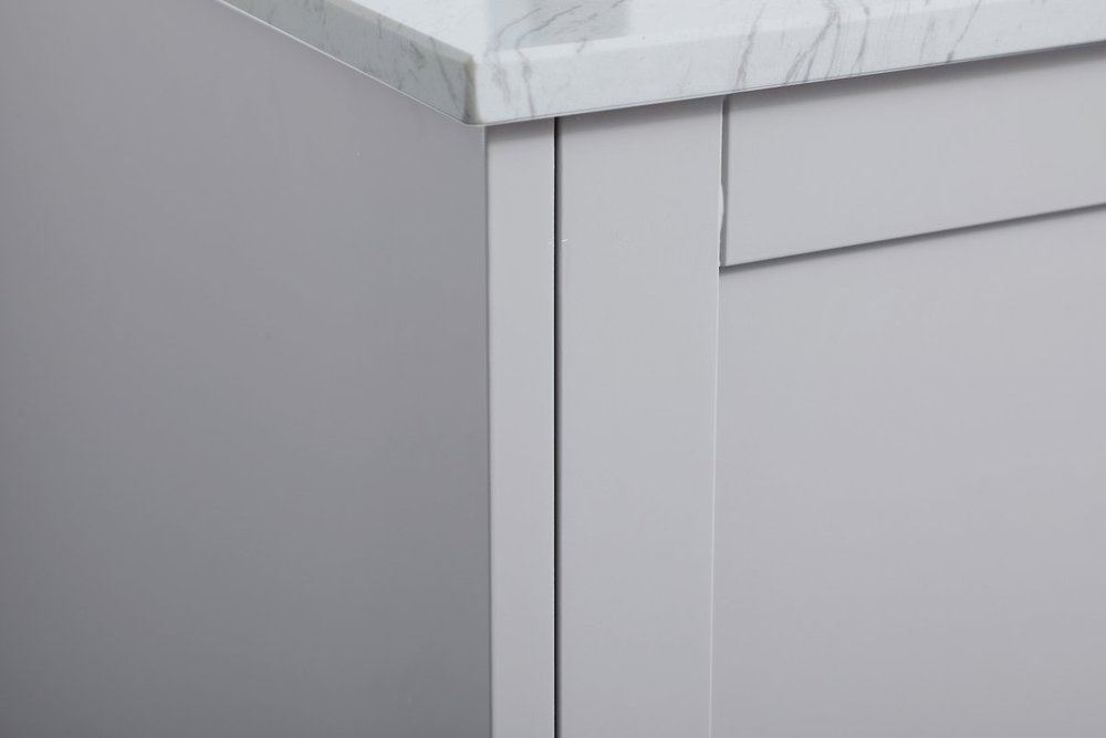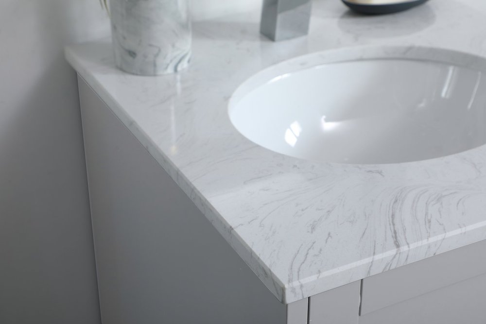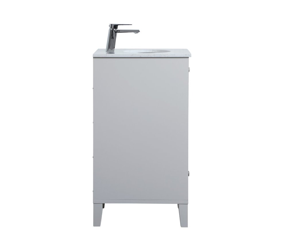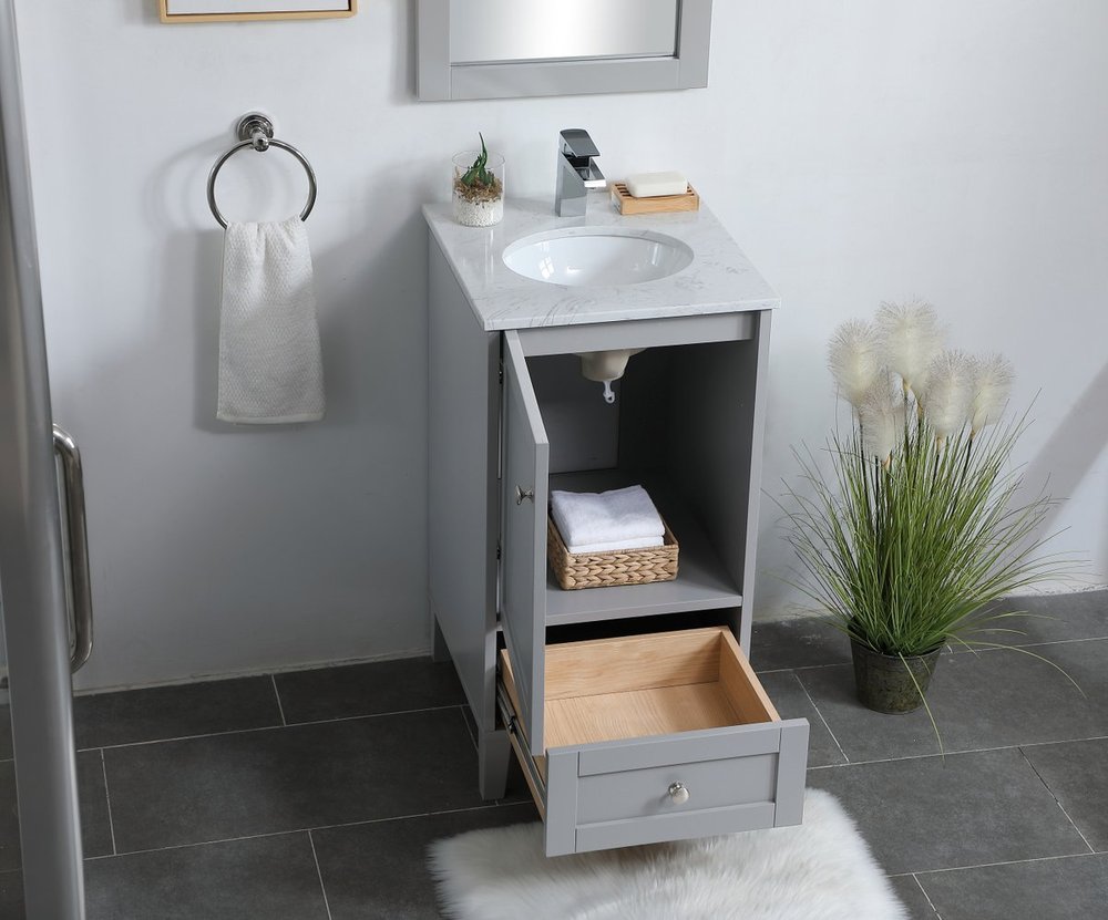 While unassuming, this 18" vanity in a grey finish sure knows how to redefine luxury. The sleek brushed nickel knobs adorn the Single cabinet door and base drawer which allows you to store your bathroom toiletries and necessities. Standing strong on oblique legs and dressed with a Calacatta engineered marble countertop, this vanity will surely create beauty and casual elegance in your bathroom or powder room.