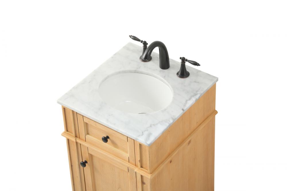 Comes with an undermount porcelain sink and a carrara white marble countertop