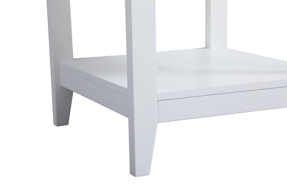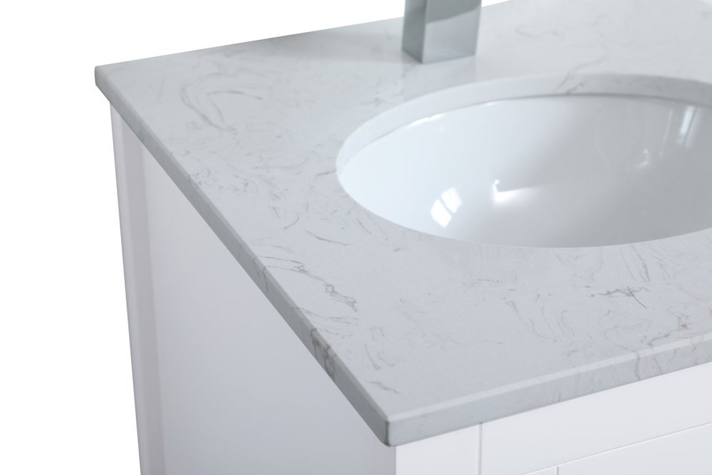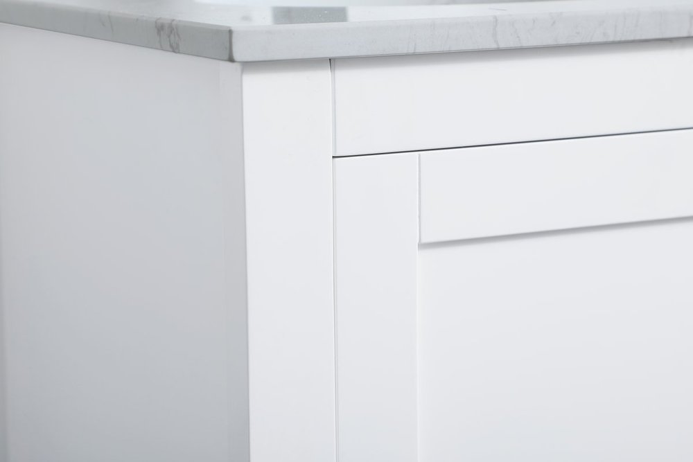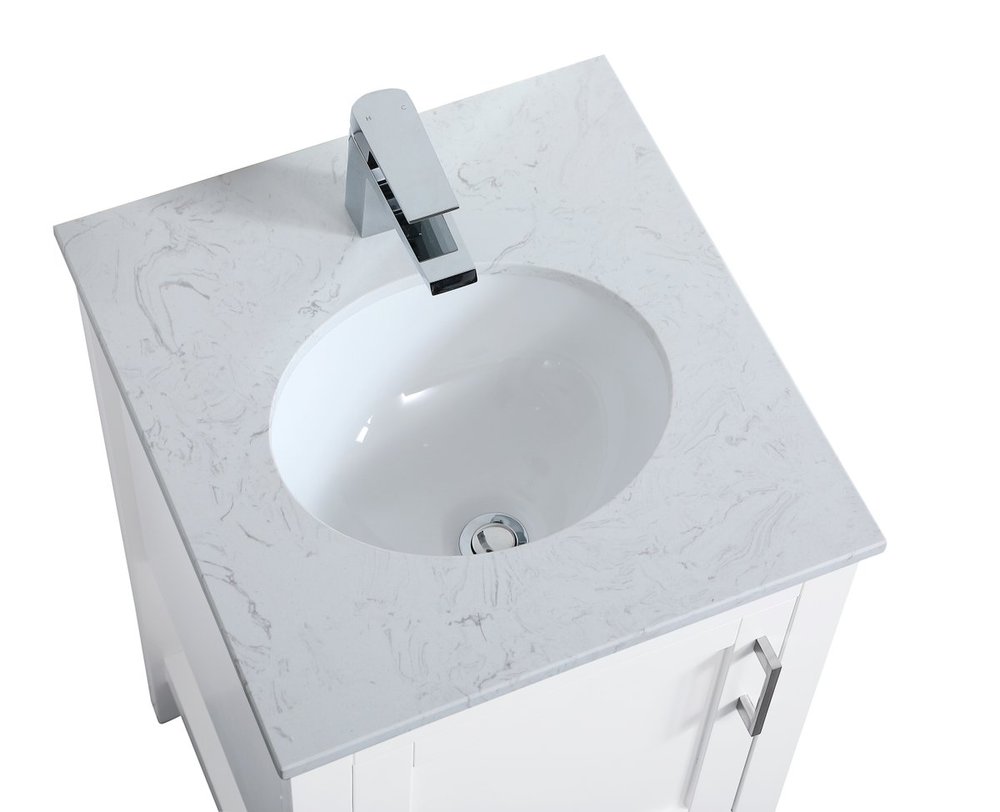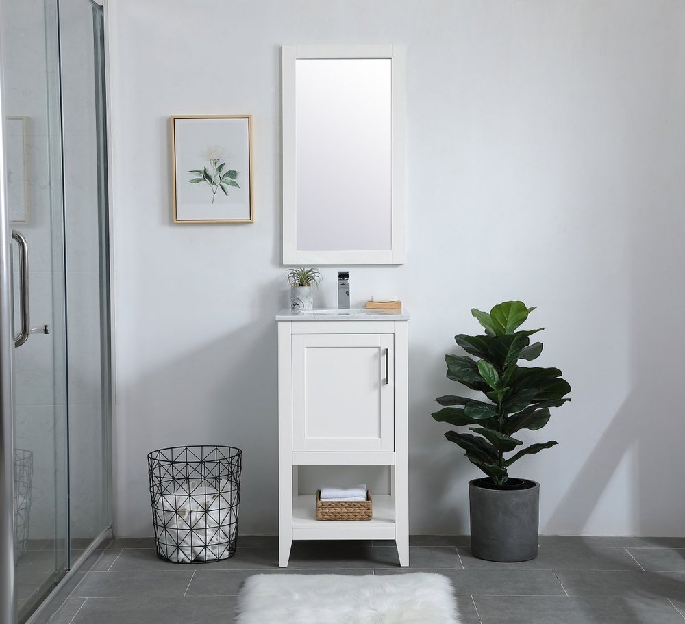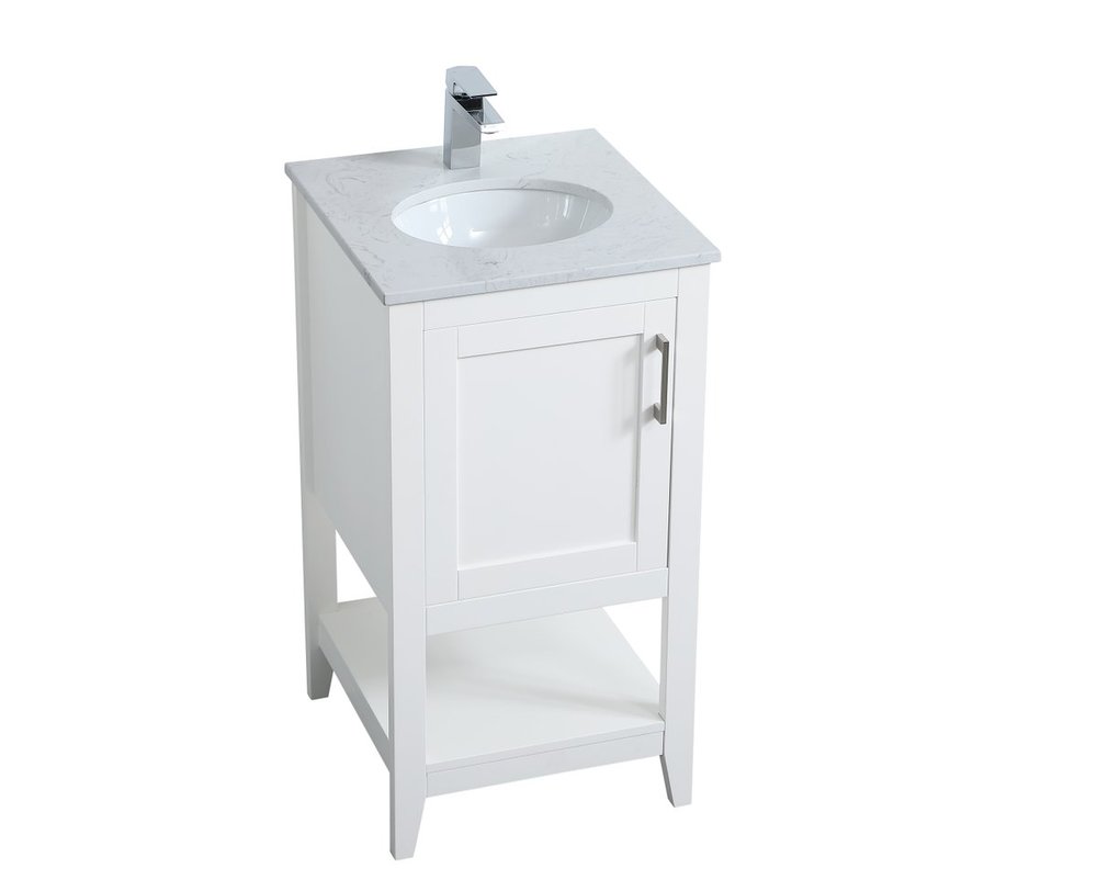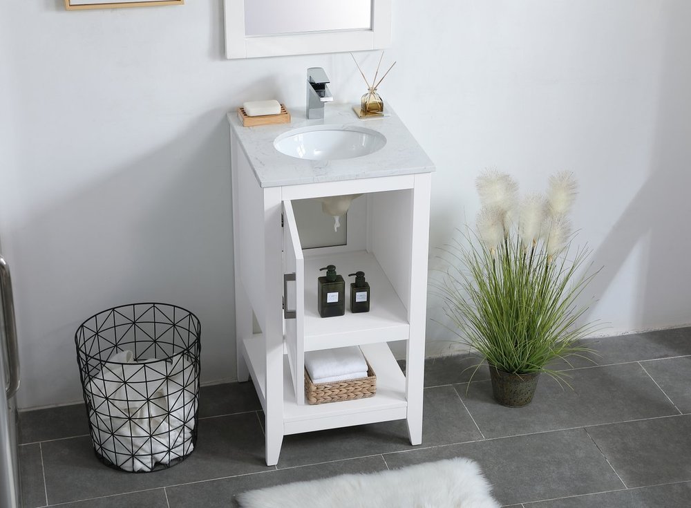 The nonchalant attitude of this 18" traditional white finish vanity will have you wanting more. The slender brushed nickel handle bar open the cabinet door to reveal an ample storage space to put away and store bathroom essentials, and the open space below allows for you to place clean towels on the rack. Topped with a Calacatta engineered marble countertop, you and your guests will enjoy this easy going vanity.