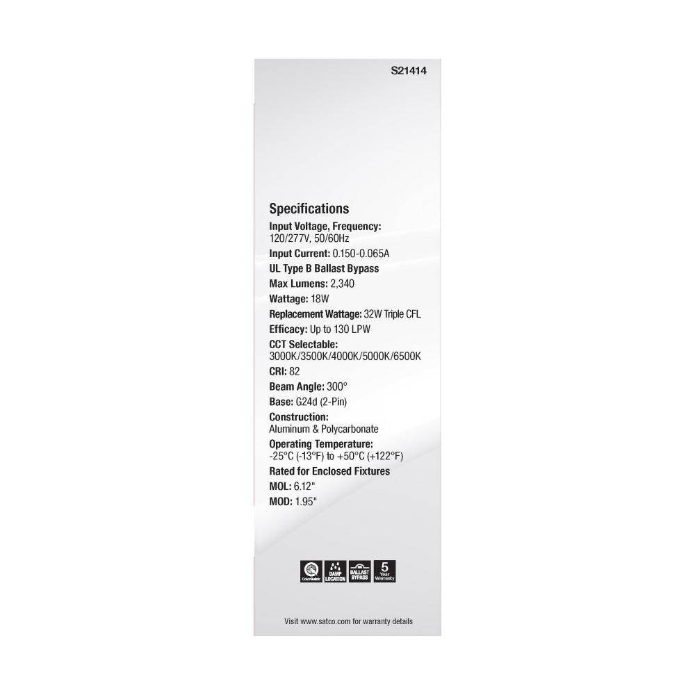 18 Watt LED PL; CCT Selectable; Lumens Selectable; Type B; Ballast Bypass; White Finish; 120/277