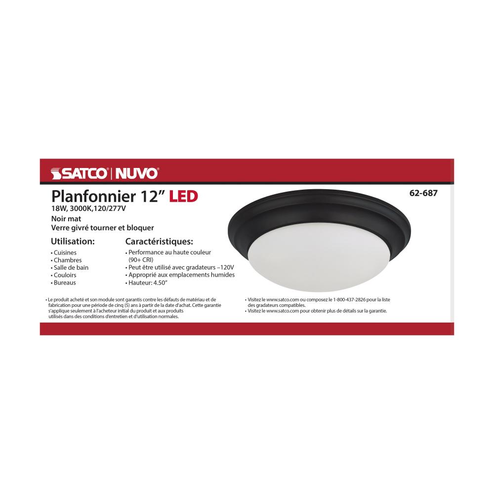 Nuvo's 62-687 18-watt, 12 inch flush mount twist and lock fixture features a matte black finish with frosted glass. Damp rated, this fixture is ideal for illuminating kitchens, hallways, bedrooms, and stairwells in residential and multi-family environm