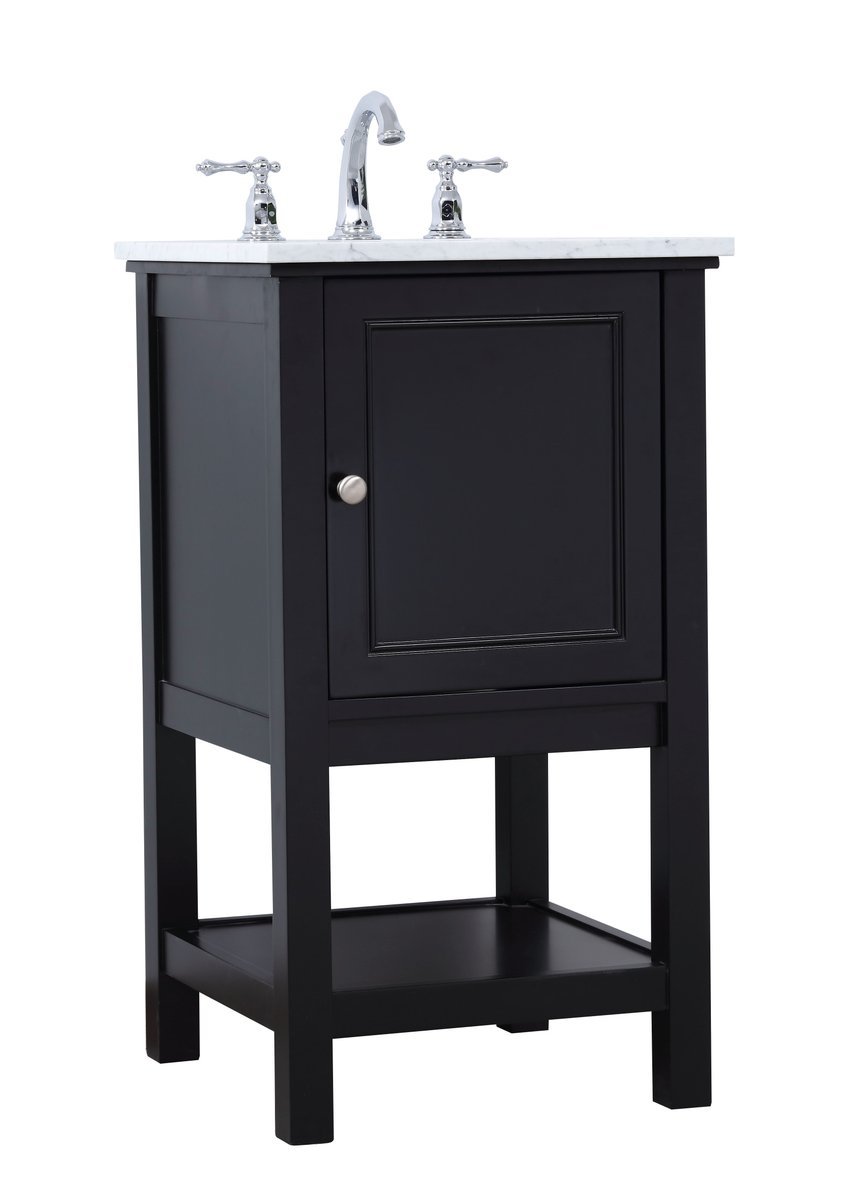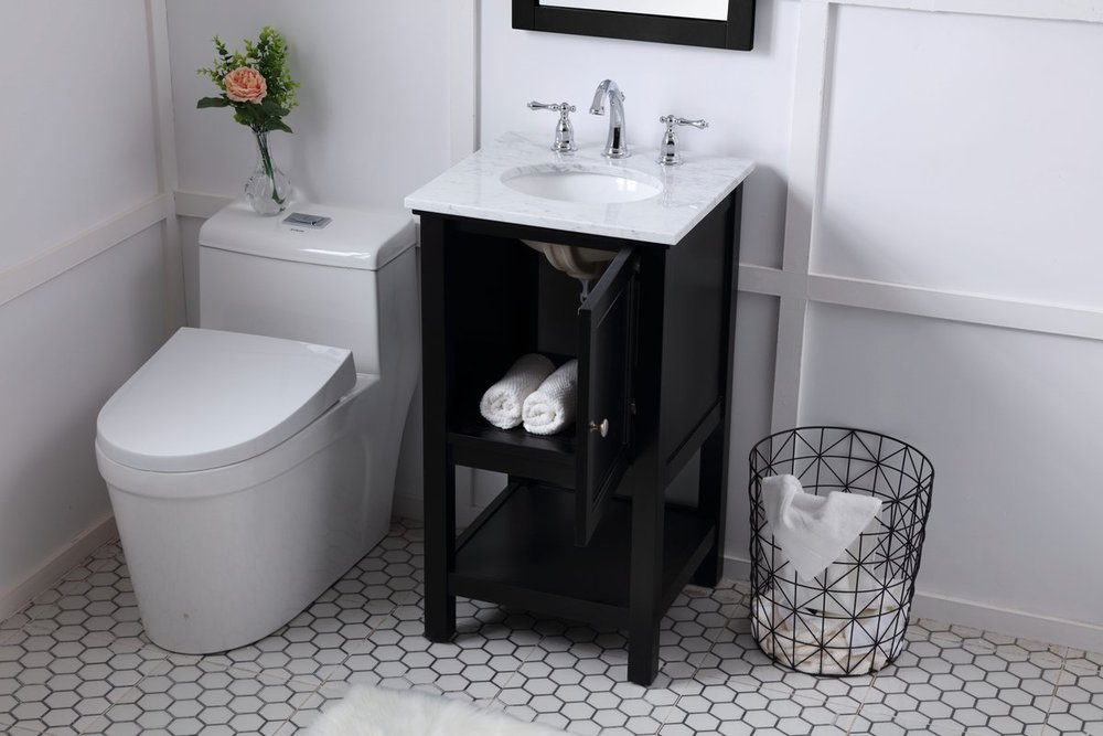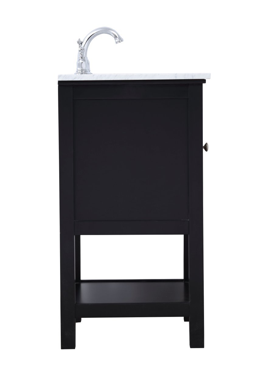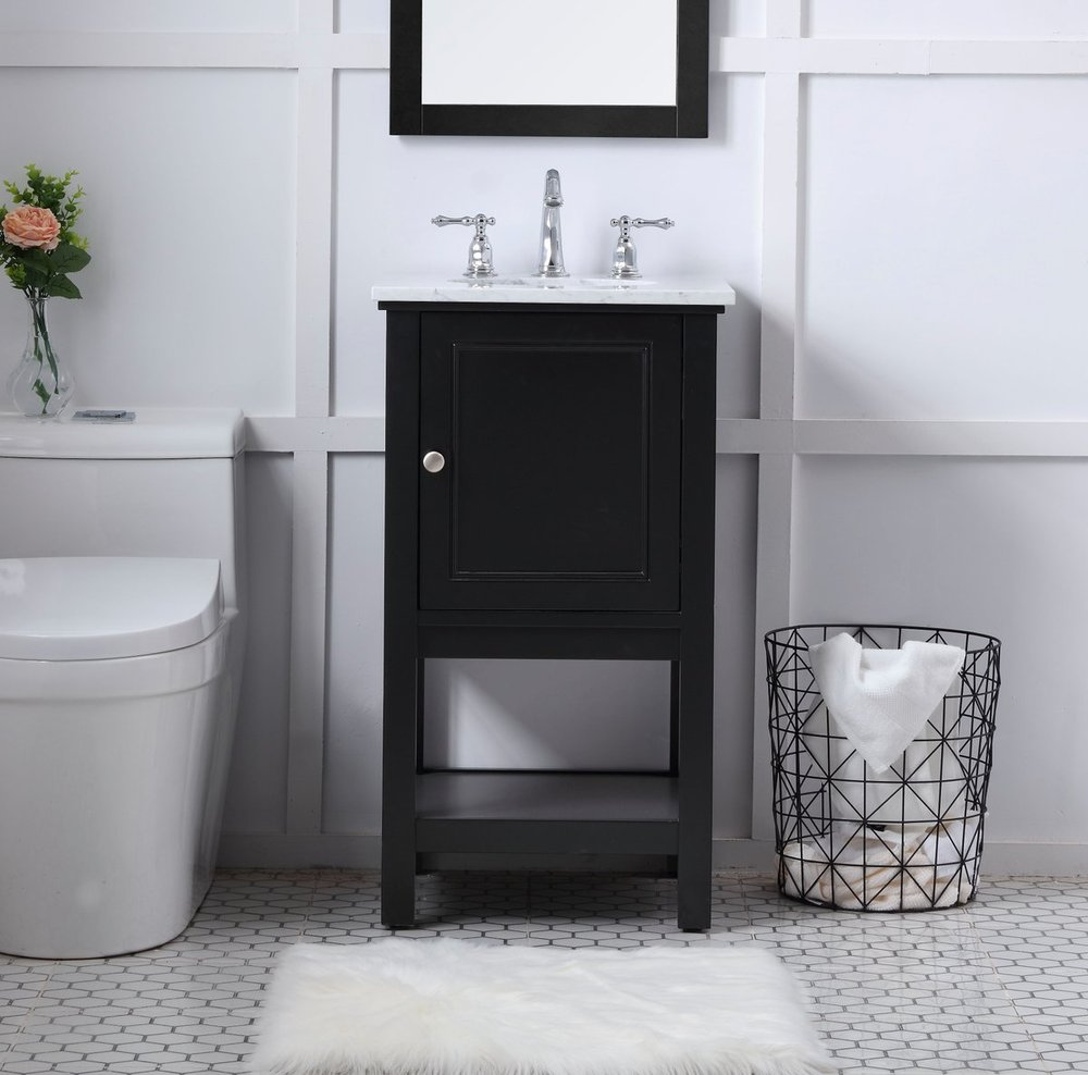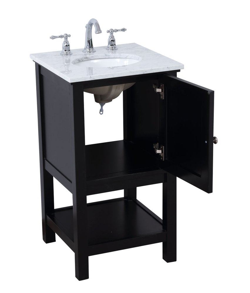 Create a refined and relaxing bath space with this contemporary design vanity, presenting its simplicity and clean straight lines in a minimalist appeal. The 18" black vanity, crafted of solid poplar wood, provides ample storage within its soft-close cabinet door and open shelf base, accentuated with chrome hardware. Rounding out the design is a luxurious Itallian Carrara white marble with a white porcelain under-mount oval sink.