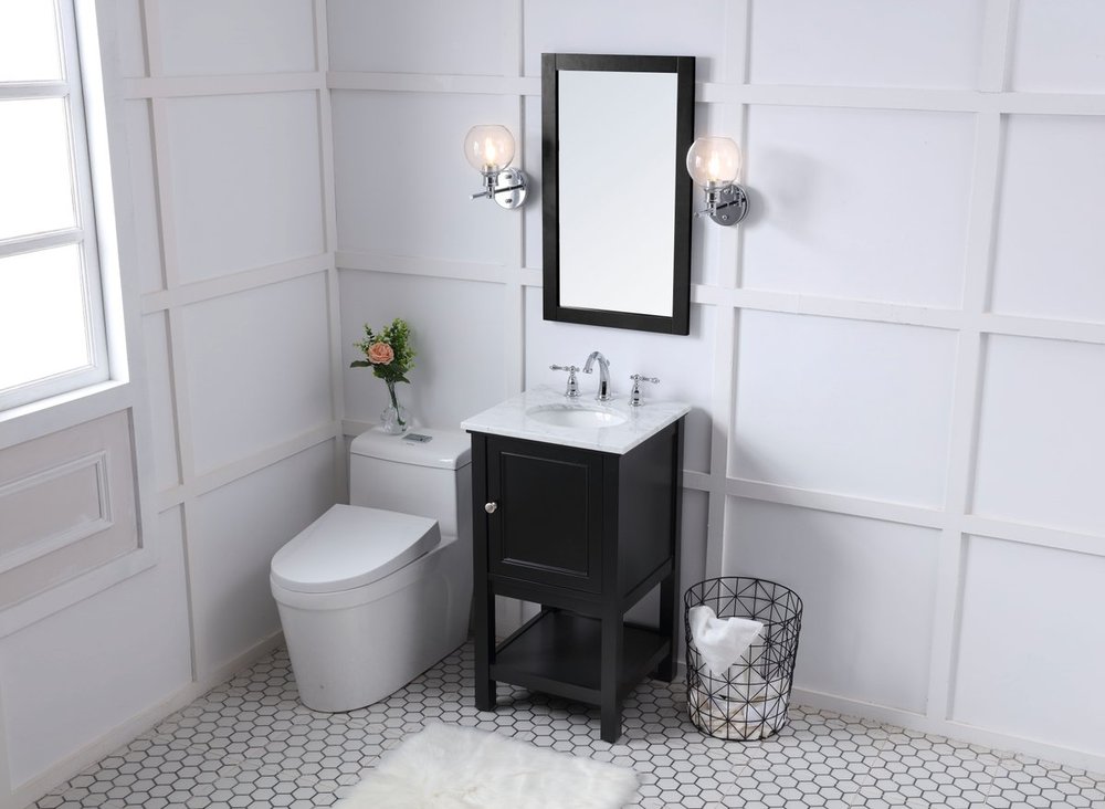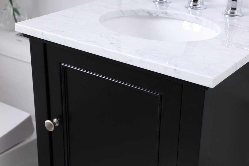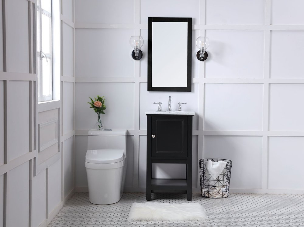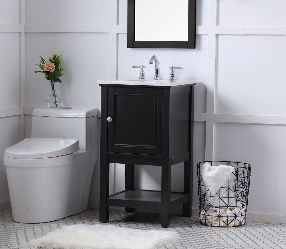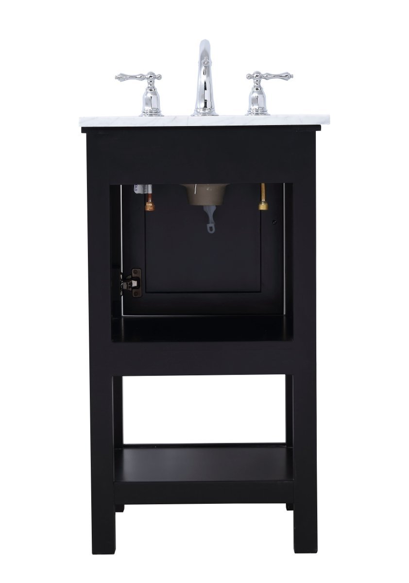 Create a refined and relaxing bath space with this contemporary design vanity, presenting its simplicity and clean straight lines in a minimalist appeal. The 18" black vanity, crafted of solid poplar wood, provides ample storage within its soft-close cabinet door and open shelf base, accentuated with chrome hardware. Rounding out the design is a luxurious Itallian Carrara white marble with a white porcelain under-mount oval sink.
