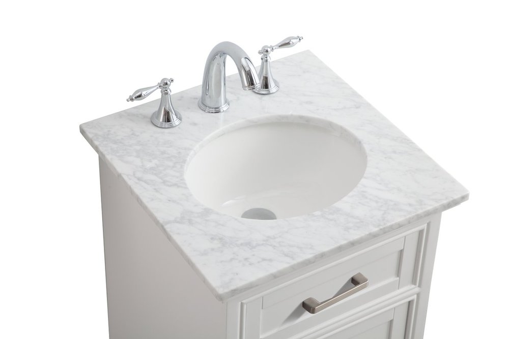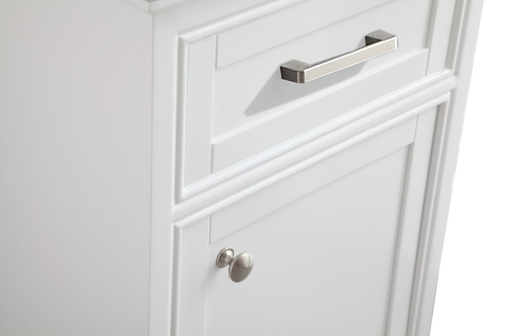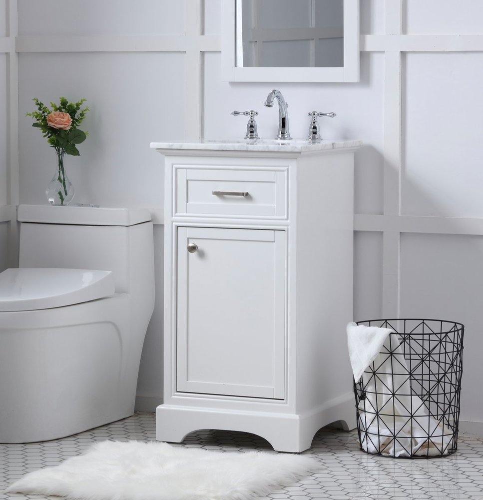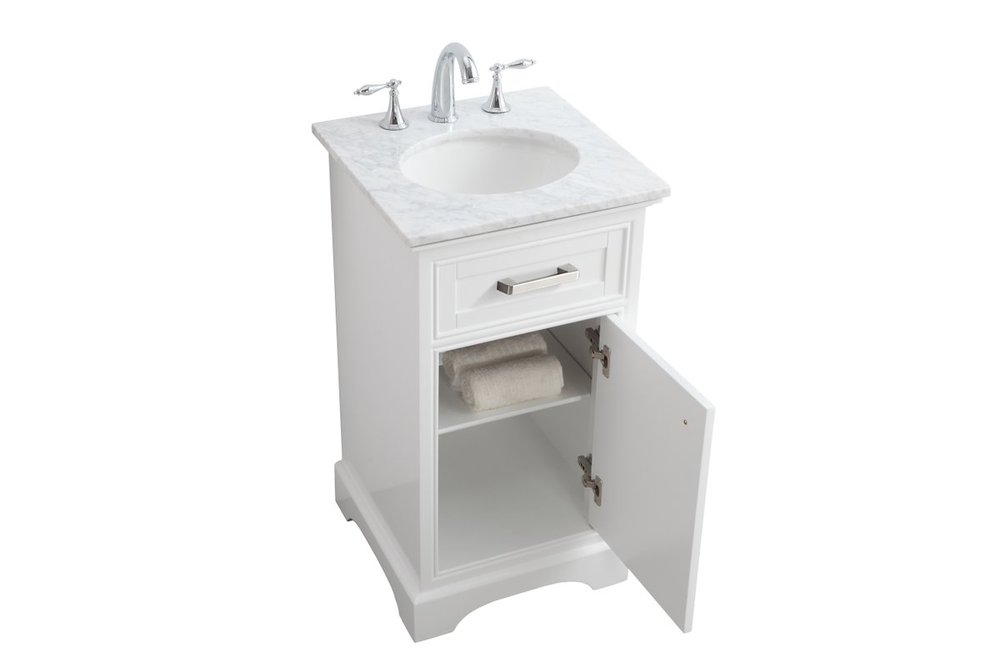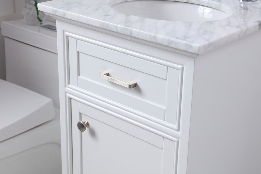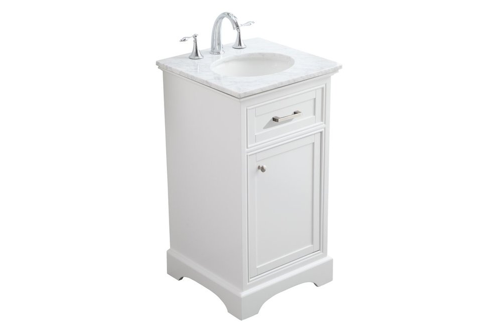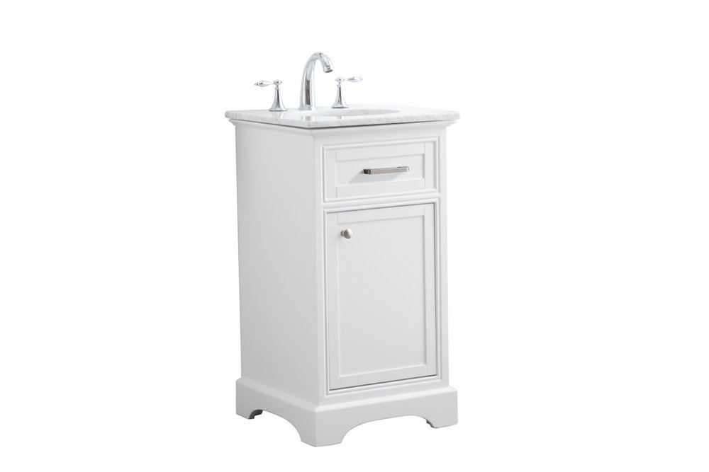 From its Italian Carrara white marble top to its contemporary style hand-painted white cabinet, it is sure to enhance either your home or office bathroom. Beneath its lustrous, natural marble top and oval, white porcelain under-mount sink, a handsome Single door cabinet with a shelf inside for all your bathroom essentials, highlighted with recessed panel doors, brushed steel bar handle and knobs, stands on a strong solid base. A wonderful balance of simplicity and practical function! Measurements: W19”xD19”xH35”