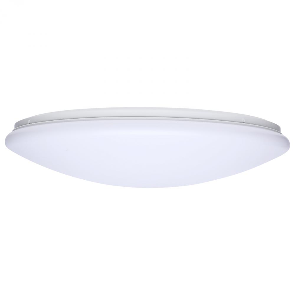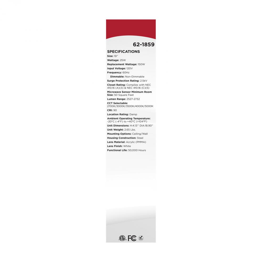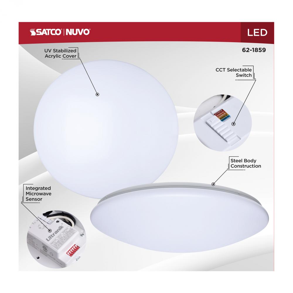 The SATCO NUVO 62-1859, 19-inch round LED Cloud fixture, offers versatile 5 CCT selectable technology and a high 90 CRI rating for exceptional, uniform illumination. Designed with a durable, non-yellowing PMMA lens, it is rated for damp locations, making i