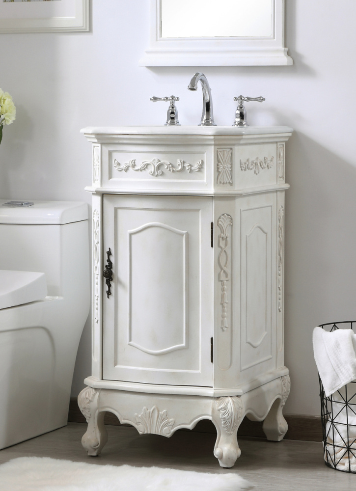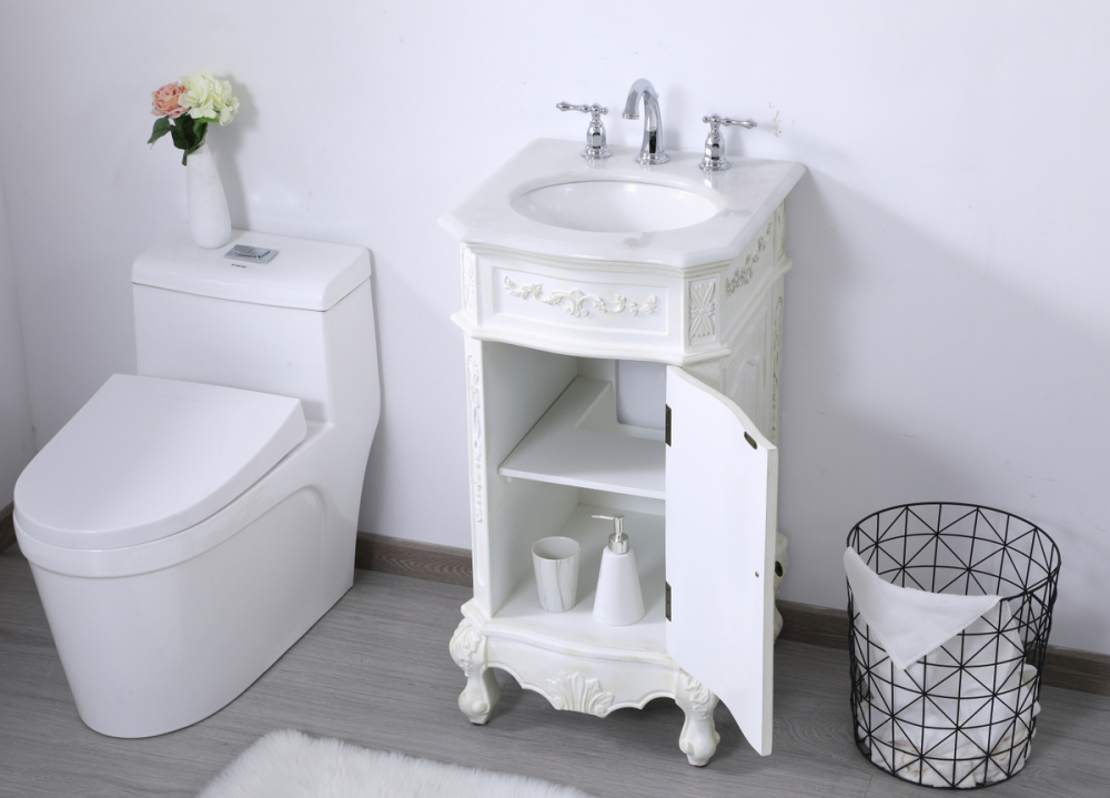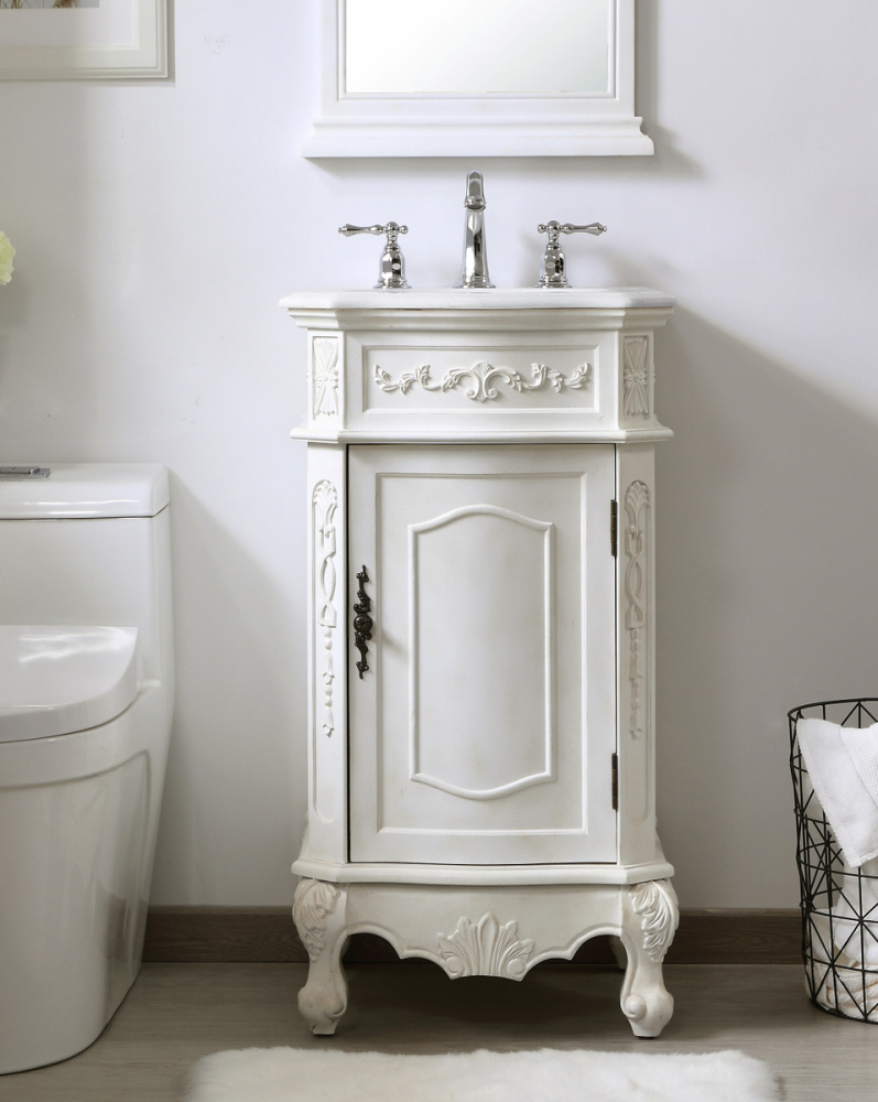 This superb balance of timeless tradition and opulent beauty in a engineered marble-topped vanity will certainly enhance the aesthetics of any home or office bathroom! Featuring an ivory white durable engineered marble countertop complimenting the hand painted cabinet with a delicate carved floral design, stands on stylishly carved solid wood French scroll feet. Don't let the design fool you, the engineered marble countertop and porcelain undermount sink allows for space to get ready, while the antique bronze hardware allows you to discover storage spaces with ease. You and your guests will marvel at this vanity that will both store away your bathroom essentials and enhance the aesthetics of your room.