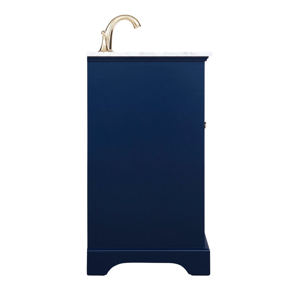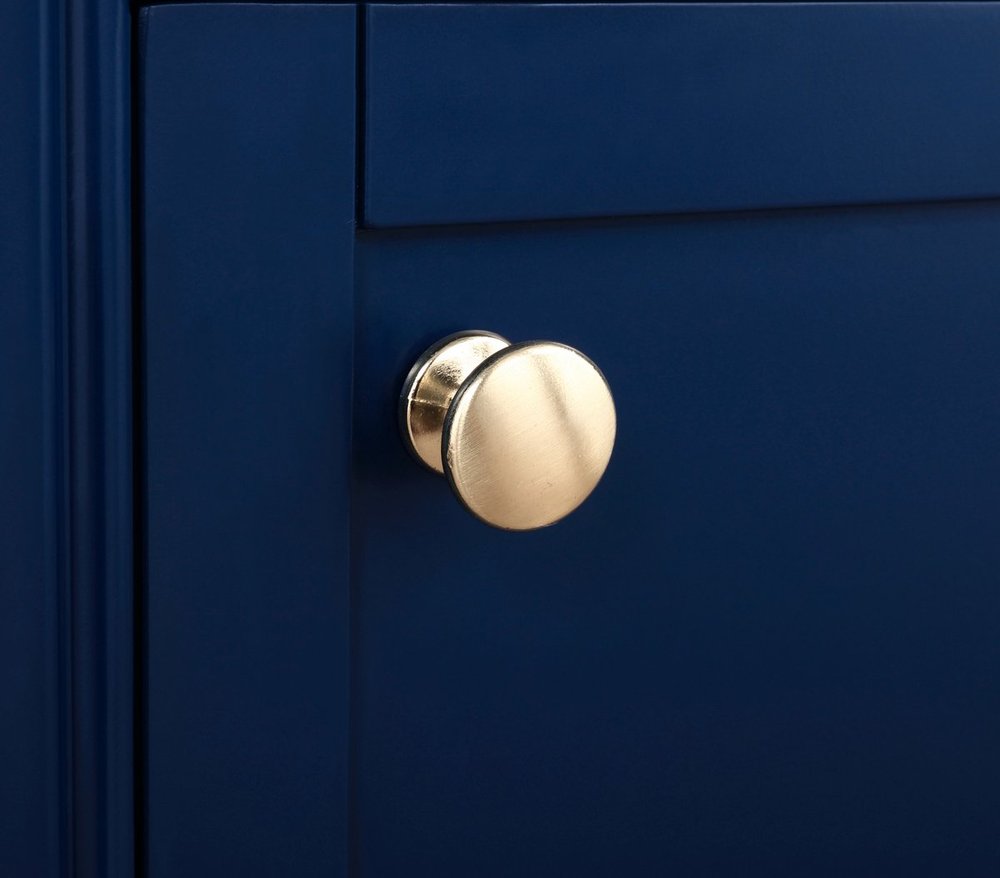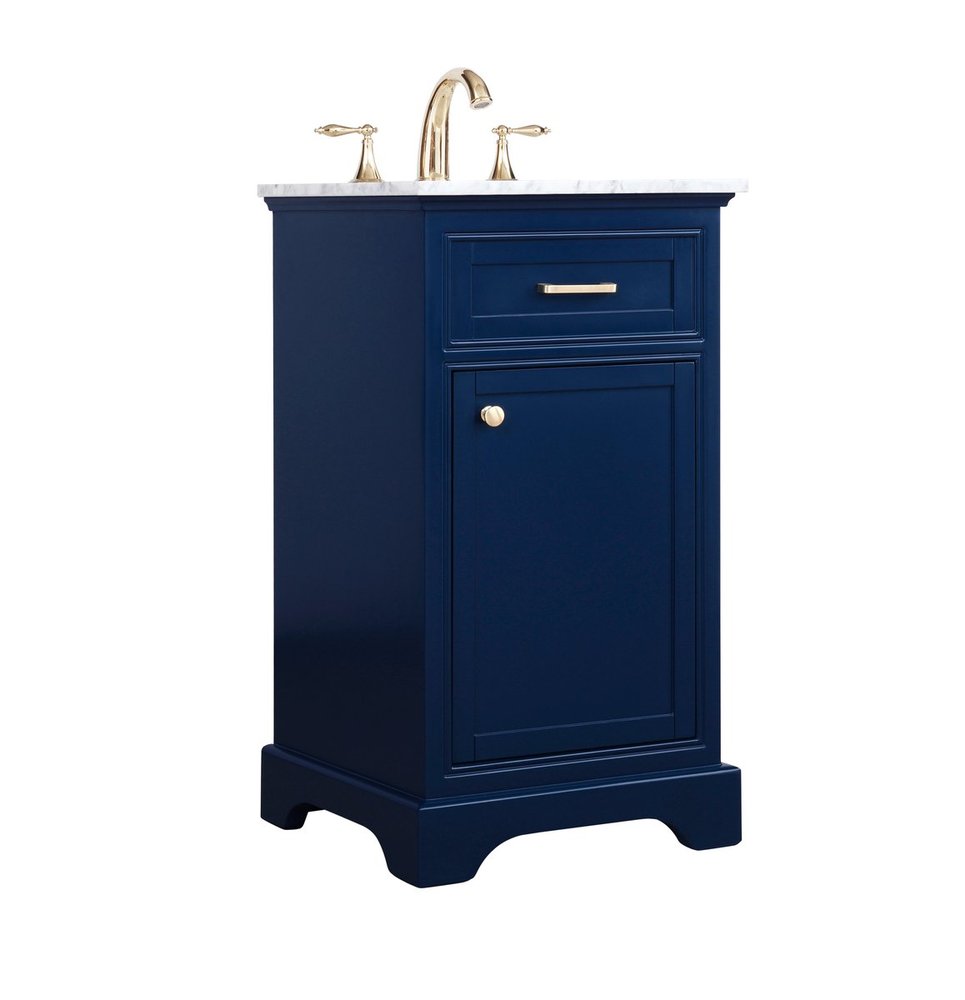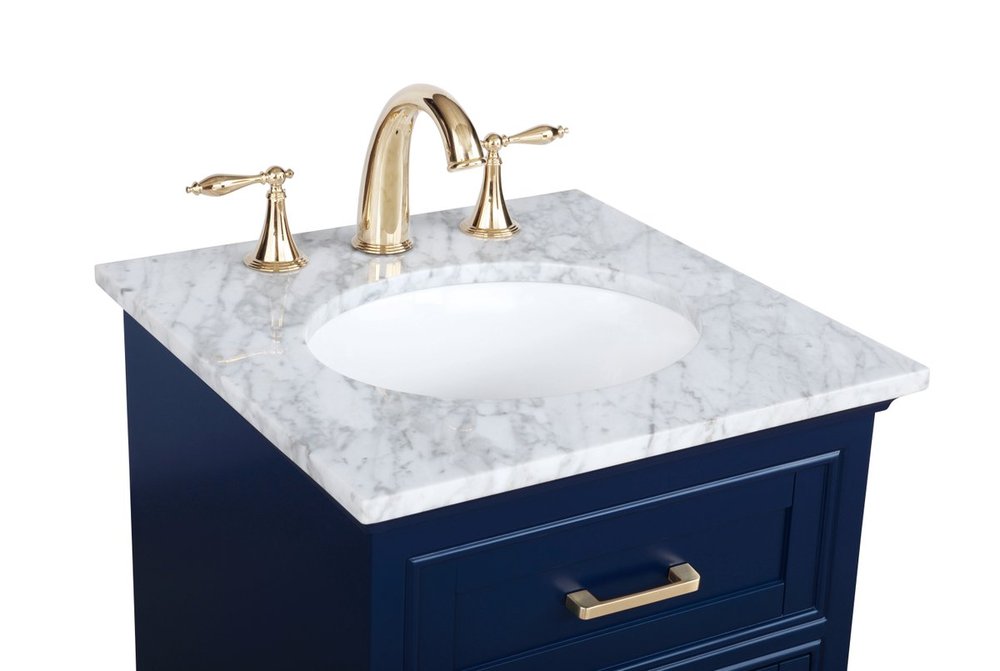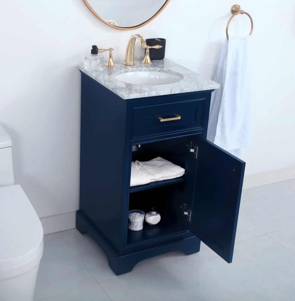 From its Italian Carrara white marble top to its contemporary style hand-painted blue cabinet, this member of our “Americana” vanity collection is sure to enhance either your home or office bathroom. Beneath its lustrous, natural marble top and oval, white porcelain under-mount sink, a handsome Single door cabinet with a shelf inside for all your bathroom essentials, highlighted with recessed panel doors, brushed gold bar handle and knobs, stands on a strong solid base. A wonderful balance of simplicity and practical function! Measurements: W19”xD19”xH35”