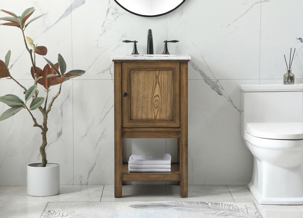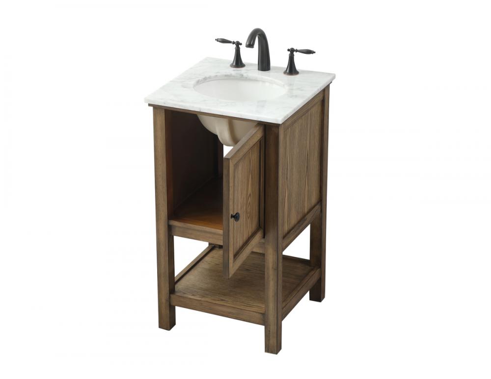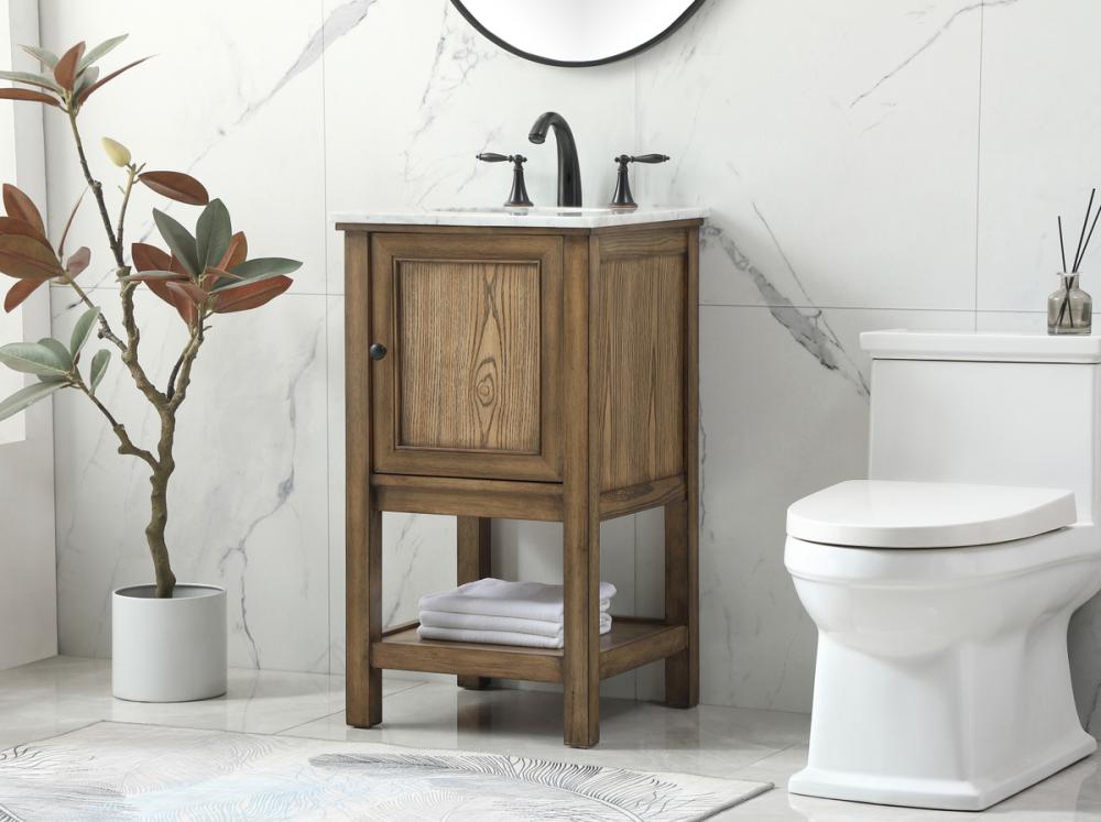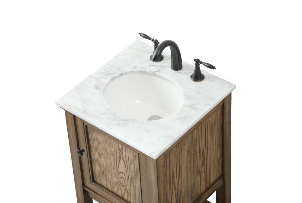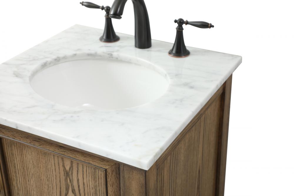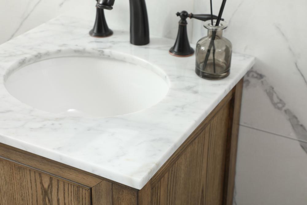 Comes with an undermount porcelain sink and a carrara white marble countertop