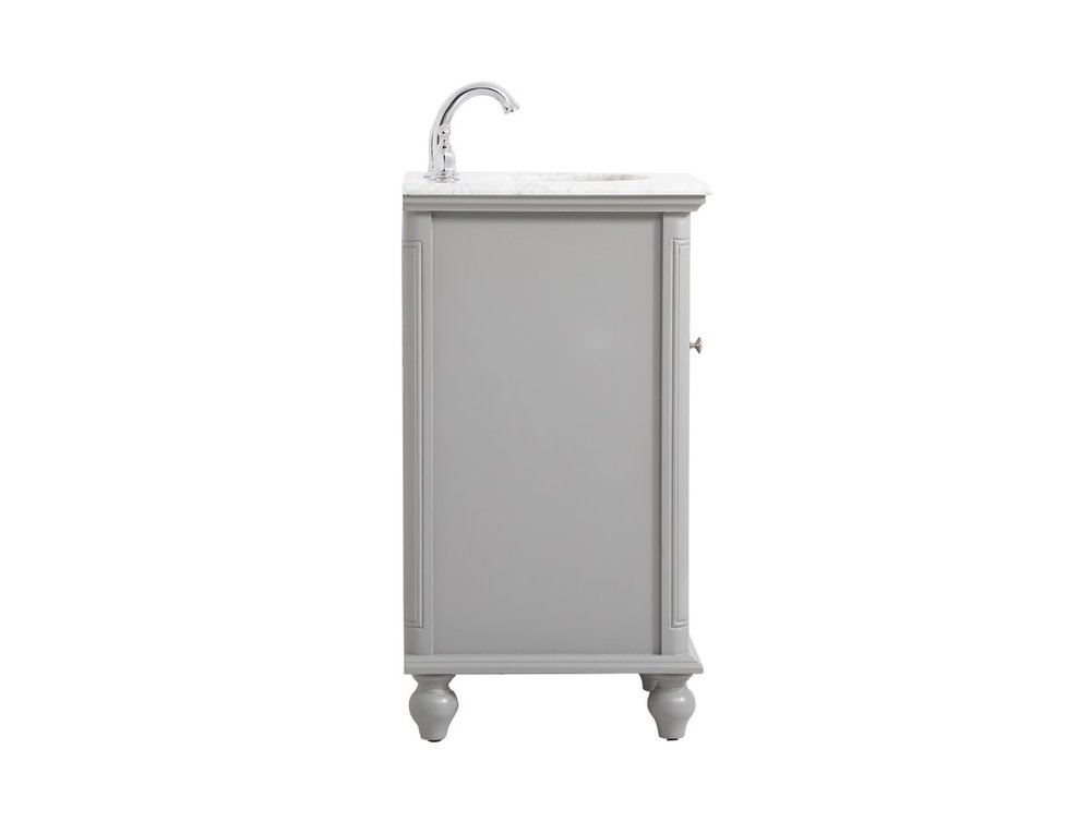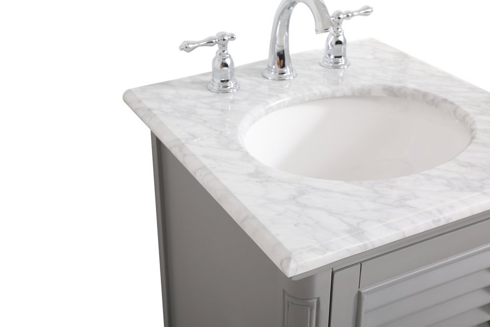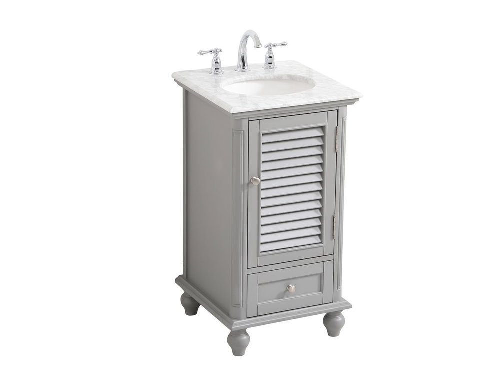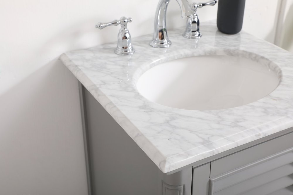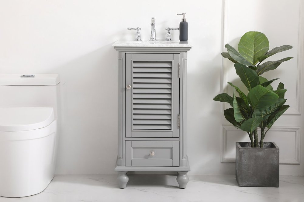 A small space doesn't mean you have to settle for less. The Rhodes collection compact vanity will add lovely sophistication and complement any small bathroom or powder room, while utilizing its charm and function to provide you with ample storage spaces. Metal round knobs gently adorn the shuttered cabinet door and drawer at the base, allowing for you to store away your bathroom essentials. The Carrara white marble countertop, porcelain undermount sink, dignified subtle engravings on the side edges, and rounded legs all come together to create contemporary beauty. Work with your space, and design a beautiful room, no matter the size.