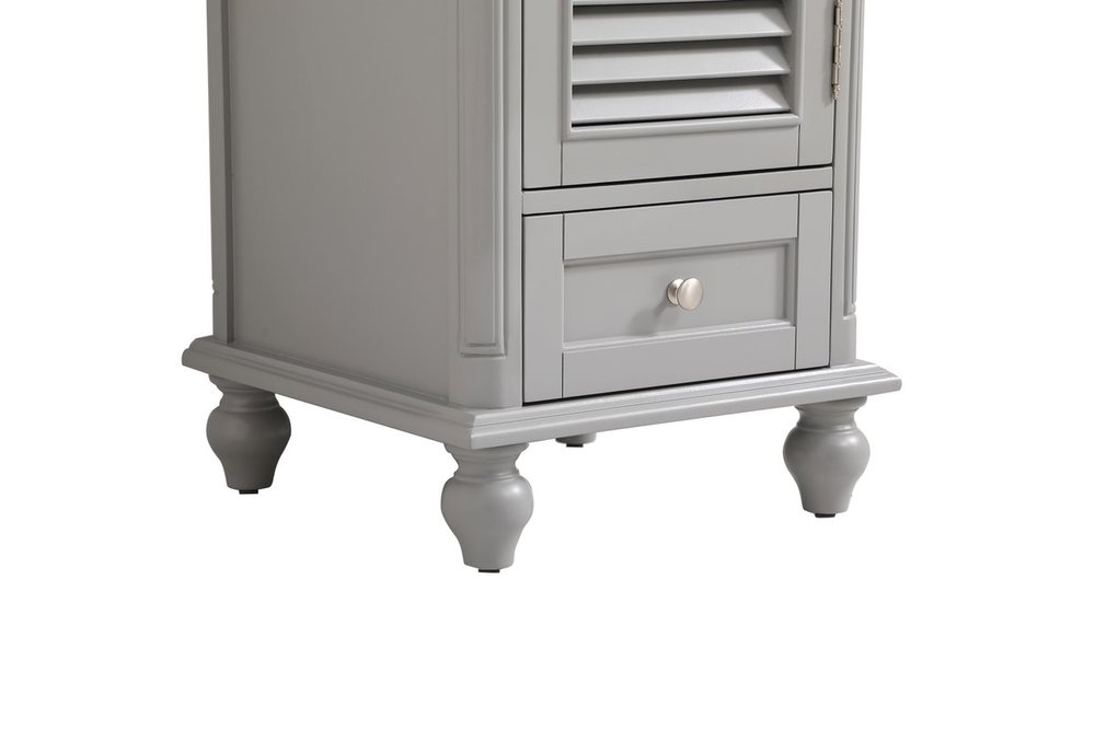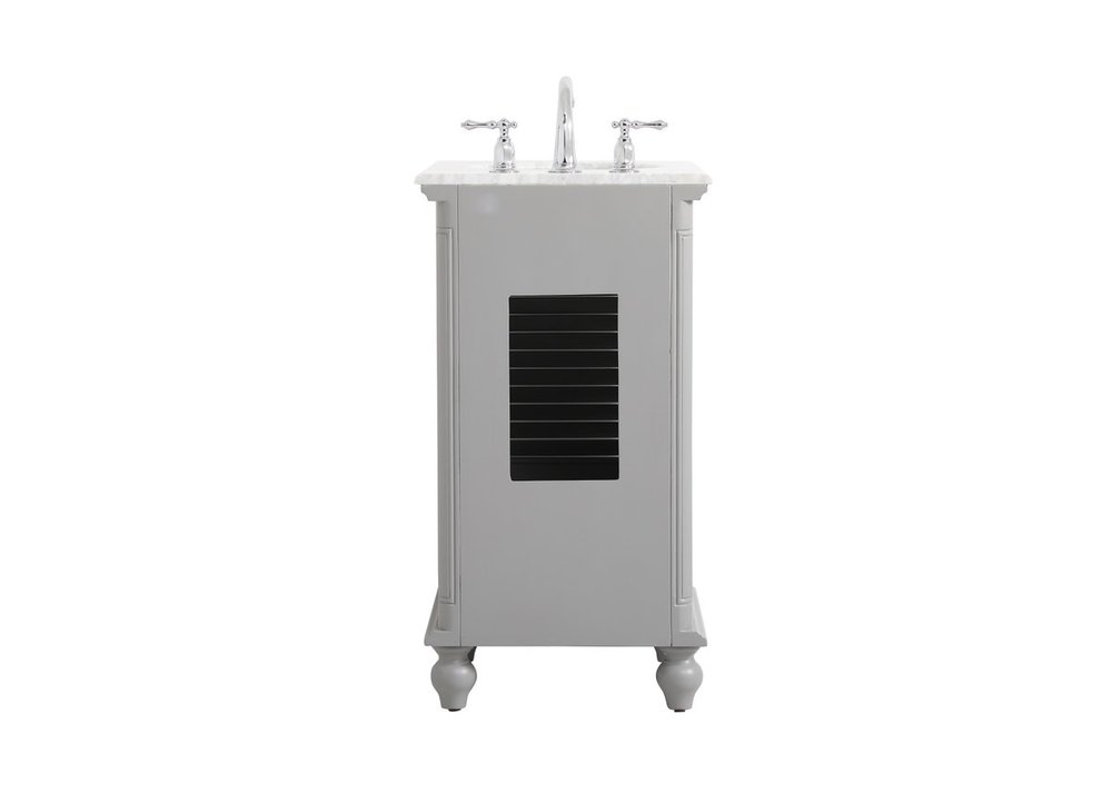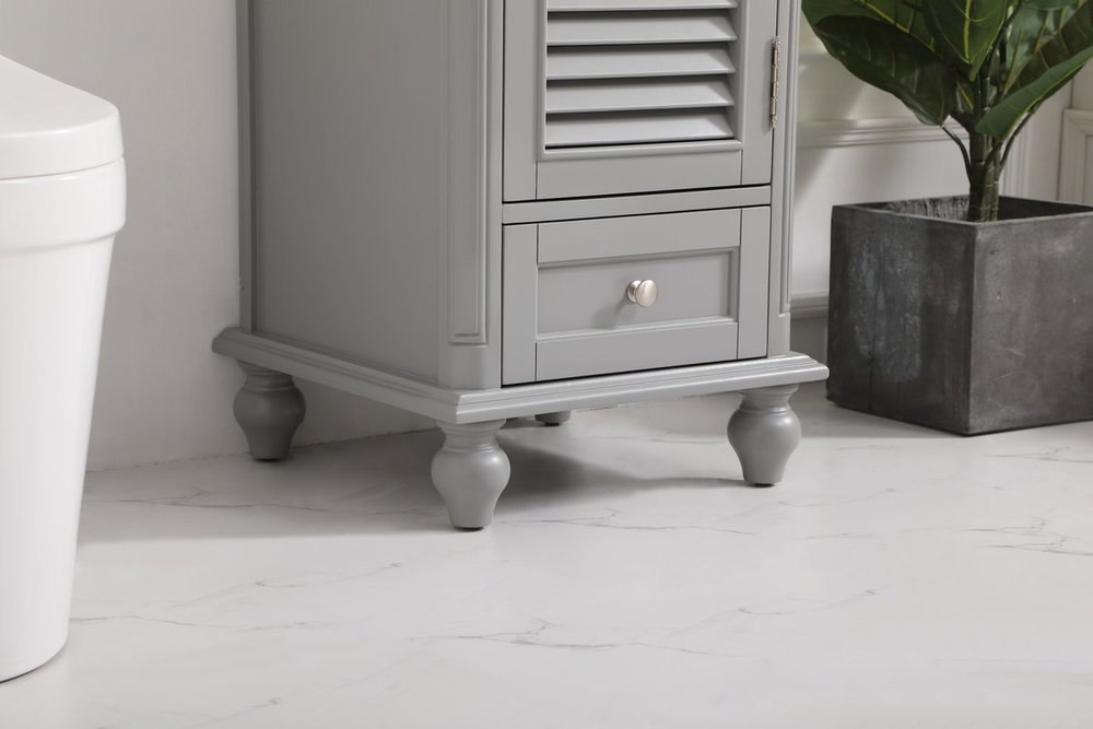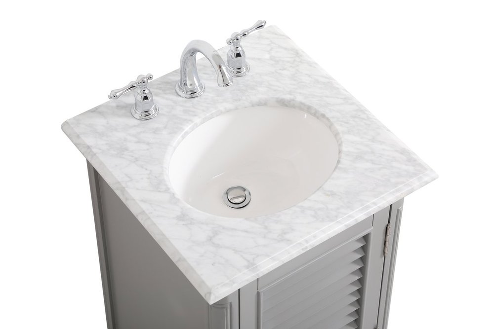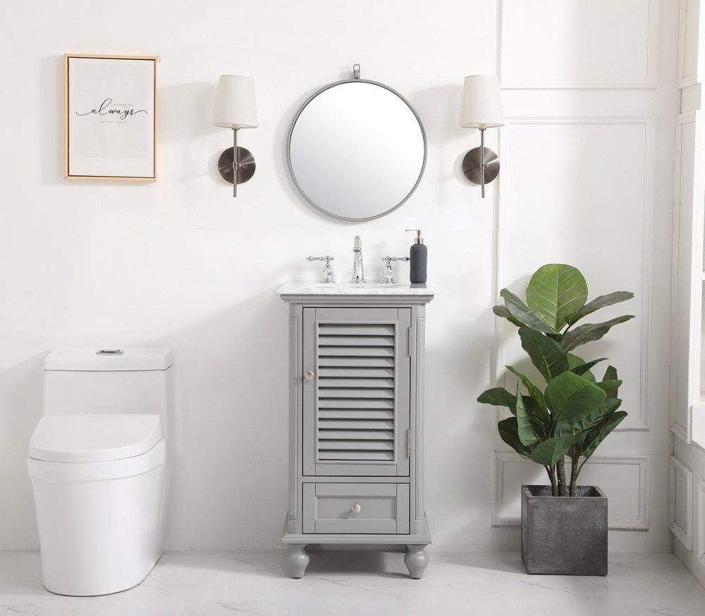 A small space doesn't mean you have to settle for less. The Rhodes collection compact vanity will add lovely sophistication and complement any small bathroom or powder room, while utilizing its charm and function to provide you with ample storage spaces. Metal round knobs gently adorn the shuttered cabinet door and drawer at the base, allowing for you to store away your bathroom essentials. The Carrara white marble countertop, porcelain undermount sink, dignified subtle engravings on the side edges, and rounded legs all come together to create contemporary beauty. Work with your space, and design a beautiful room, no matter the size.