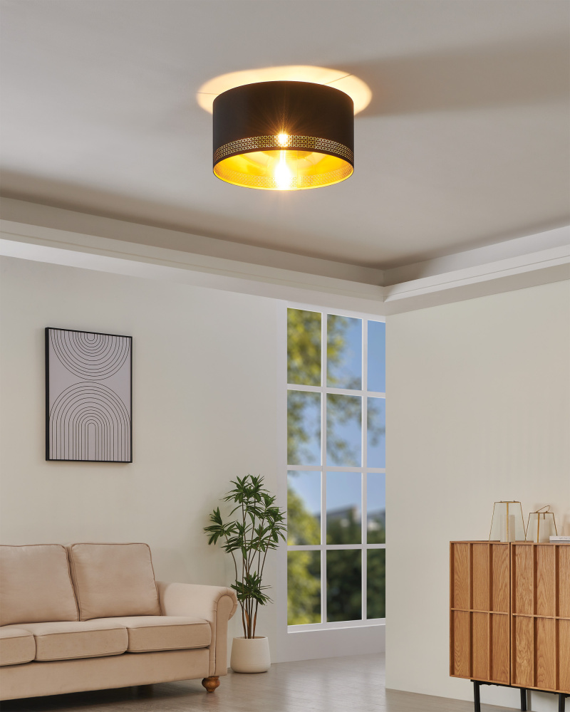 1 LT Drum Ceiling Light w/ Black & Gold Interior Fabric Shade