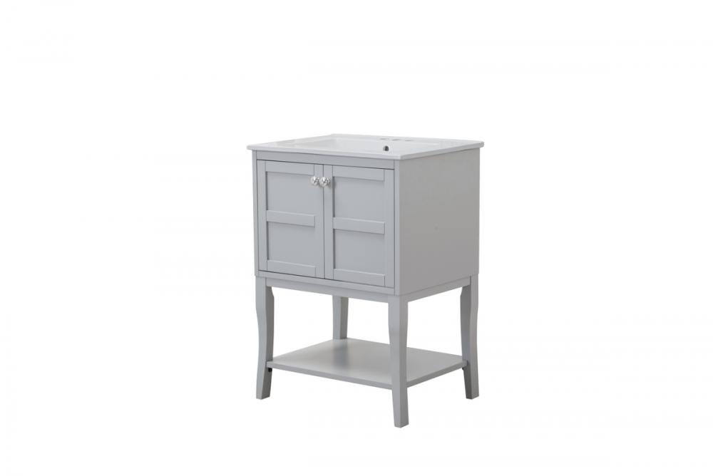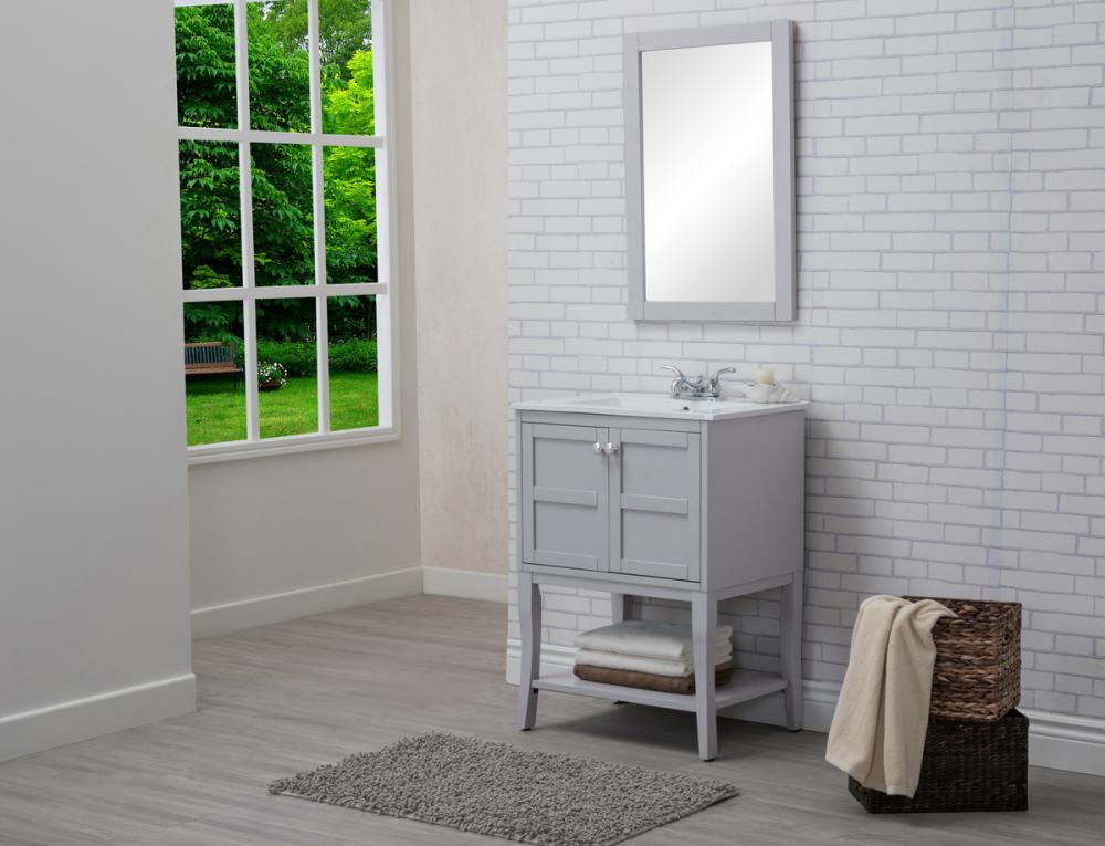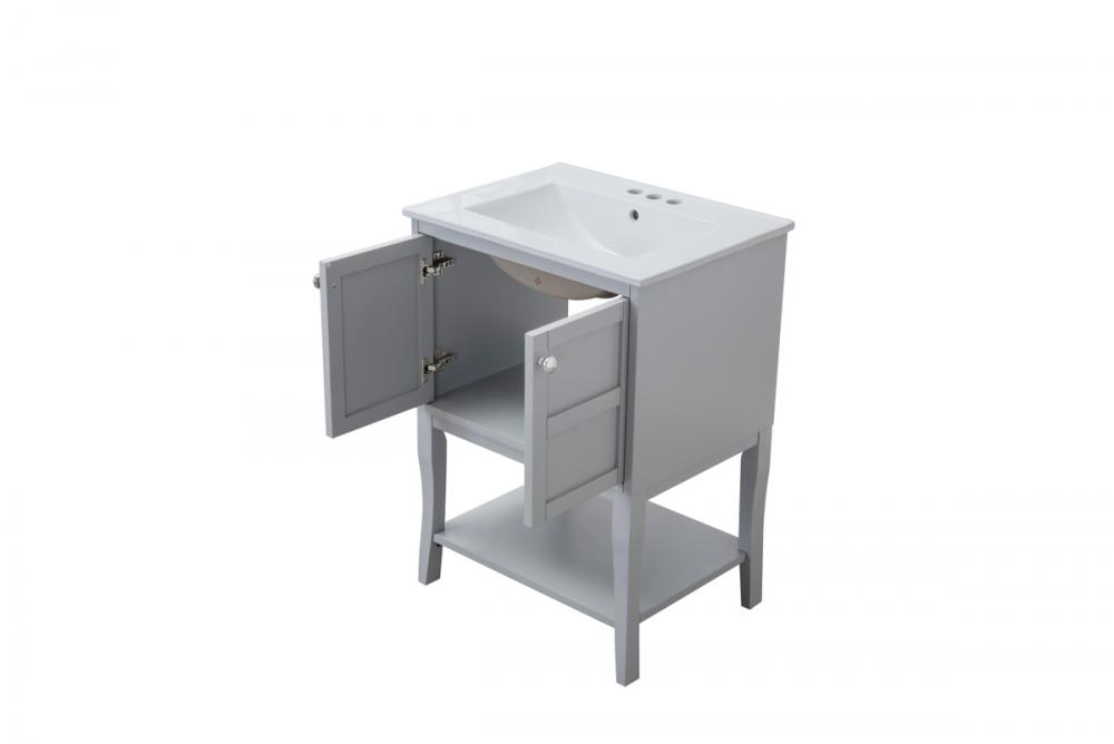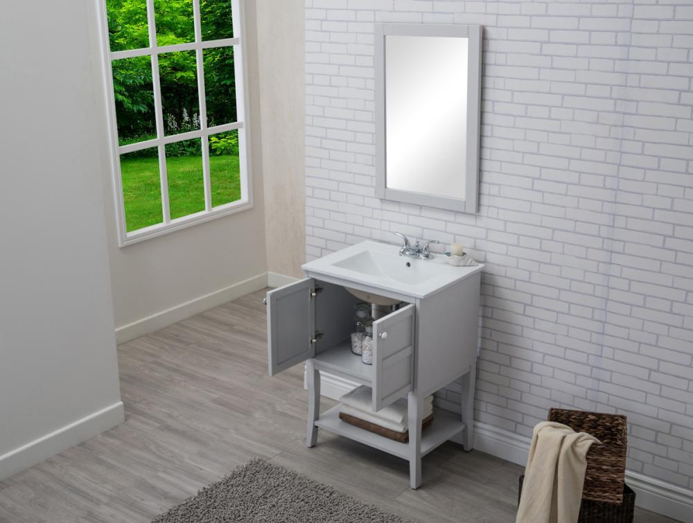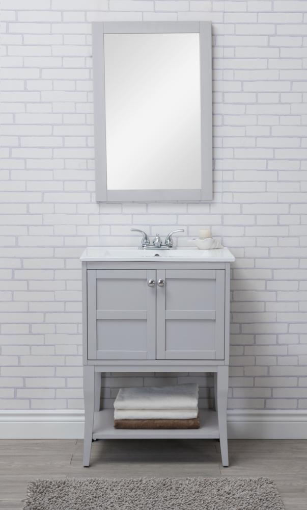 Designed with simple beauty and clean lines in mind , the Mason vanity will surely bring a unique flair to the modern day guest or office bathroom. Its transitional design features 2 framed doors with soft close function and an open shelf for your additional bathroom essential, topped with a modern white resin counter top with an integrated sink, which ensure non stain, scratch resistance and maintenance free use. the cabinet is painted in soft grey, accented with round stainless steel door knobs, and build by solid wood frame, with graciously curved legs. FEATURES: *Mason collection *resin top with integrated sink *Measurements: W24xD18xH34” *Cabinet finish: soft grey *4” spread ready to install faucet hole *2 doors and 1 shelf *Door knob finish: chrome *Build with solid wood and engineered wood. PRODUCTS DETAIL: *Top material: resin *Sink: resin *Base material:wood *Faucet: not included *Door included: 2 *Shelf: 1 *installation: required.