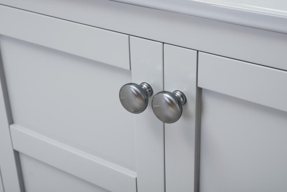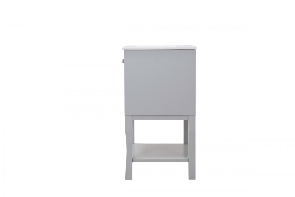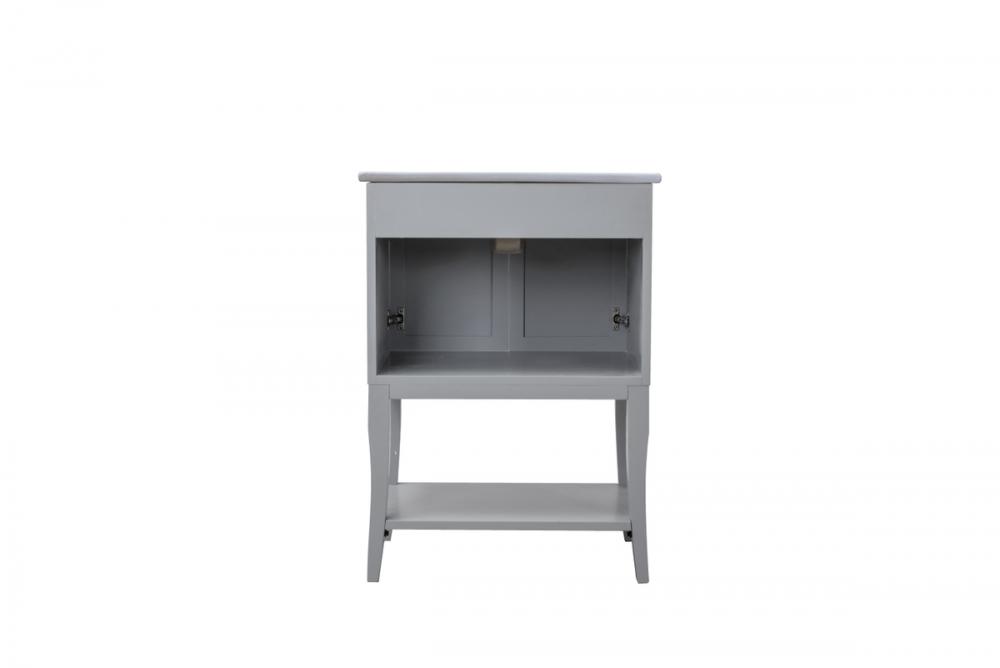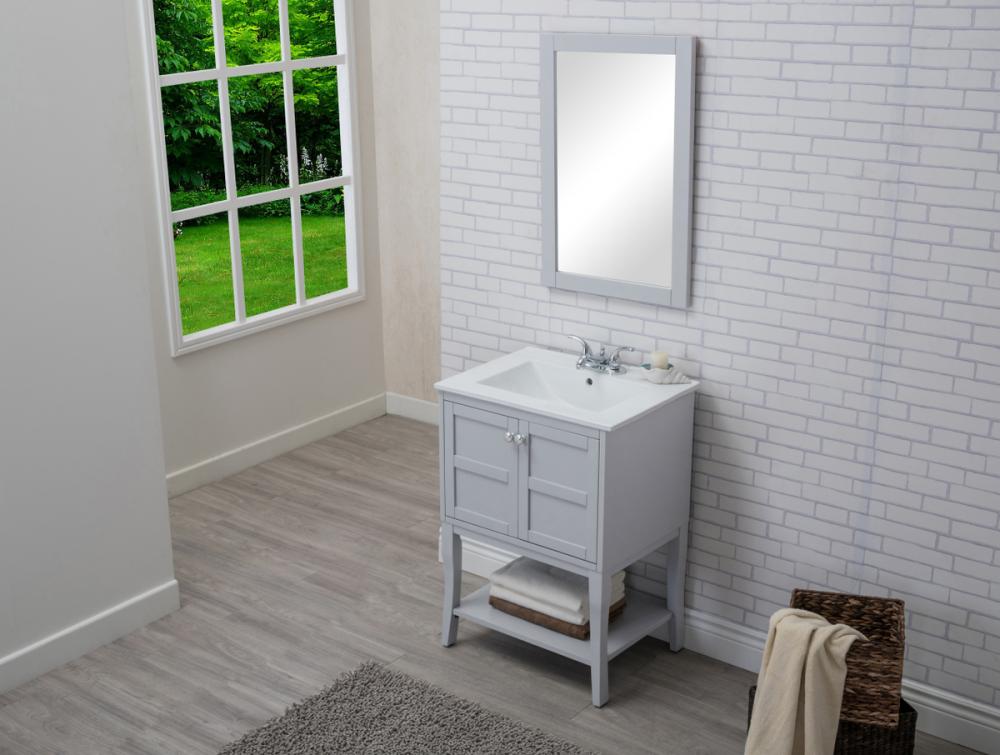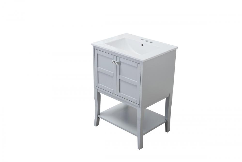 Designed with simple beauty and clean lines in mind , the Mason vanity will surely bring a unique flair to the modern day guest or office bathroom. Its transitional design features 2 framed doors with soft close function and an open shelf for your additional bathroom essential, topped with a modern white resin counter top with an integrated sink, which ensure non stain, scratch resistance and maintenance free use. the cabinet is painted in soft grey, accented with round stainless steel door knobs, and build by solid wood frame, with graciously curved legs. FEATURES: *Mason collection *resin top with integrated sink *Measurements: W24xD18xH34” *Cabinet finish: soft grey *4” spread ready to install faucet hole *2 doors and 1 shelf *Door knob finish: chrome *Build with solid wood and engineered wood. PRODUCTS DETAIL: *Top material: resin *Sink: resin *Base material:wood *Faucet: not included *Door included: 2 *Shelf: 1 *installation: required.