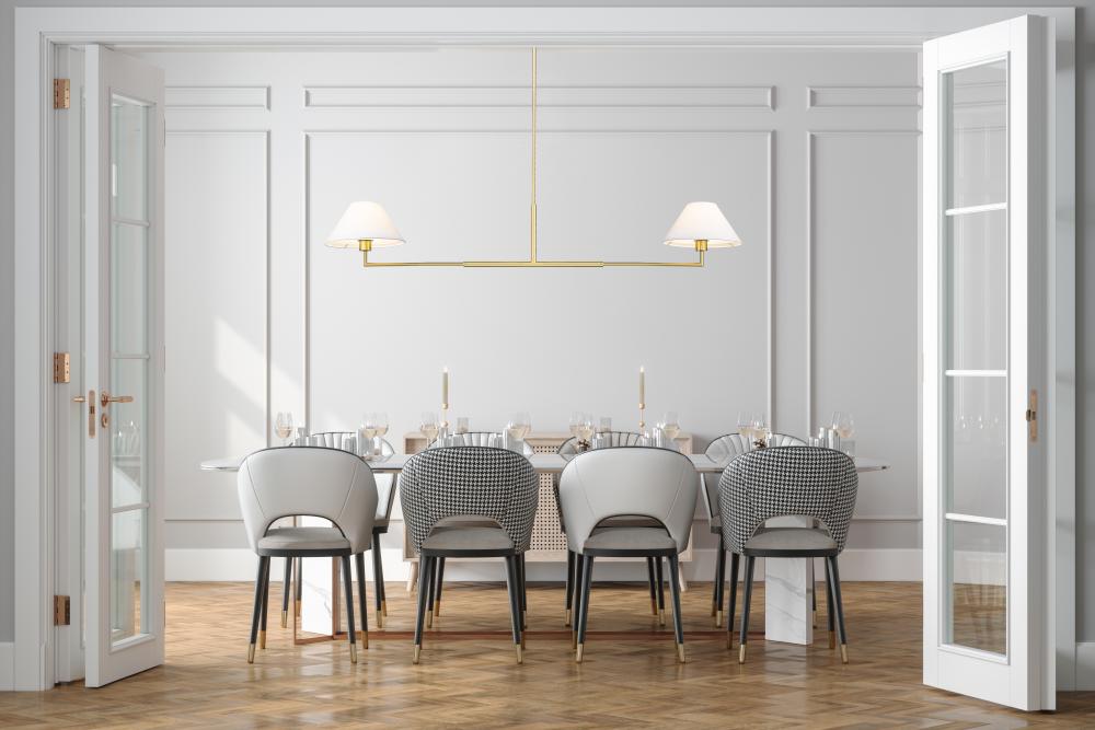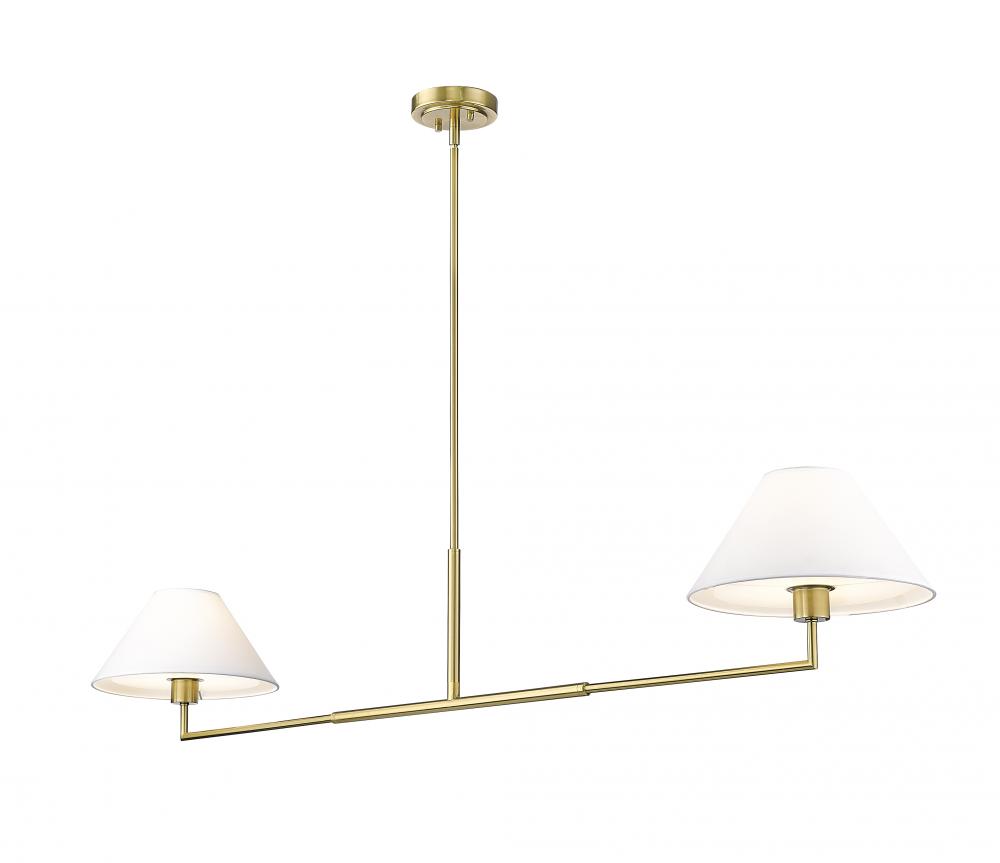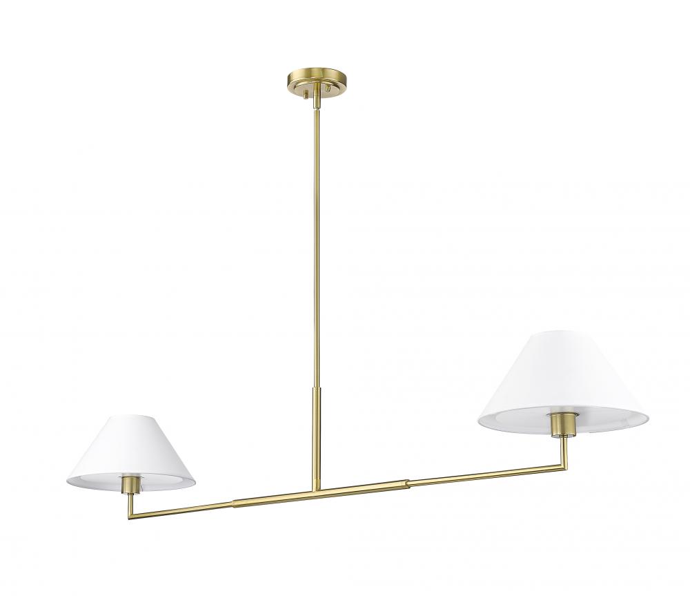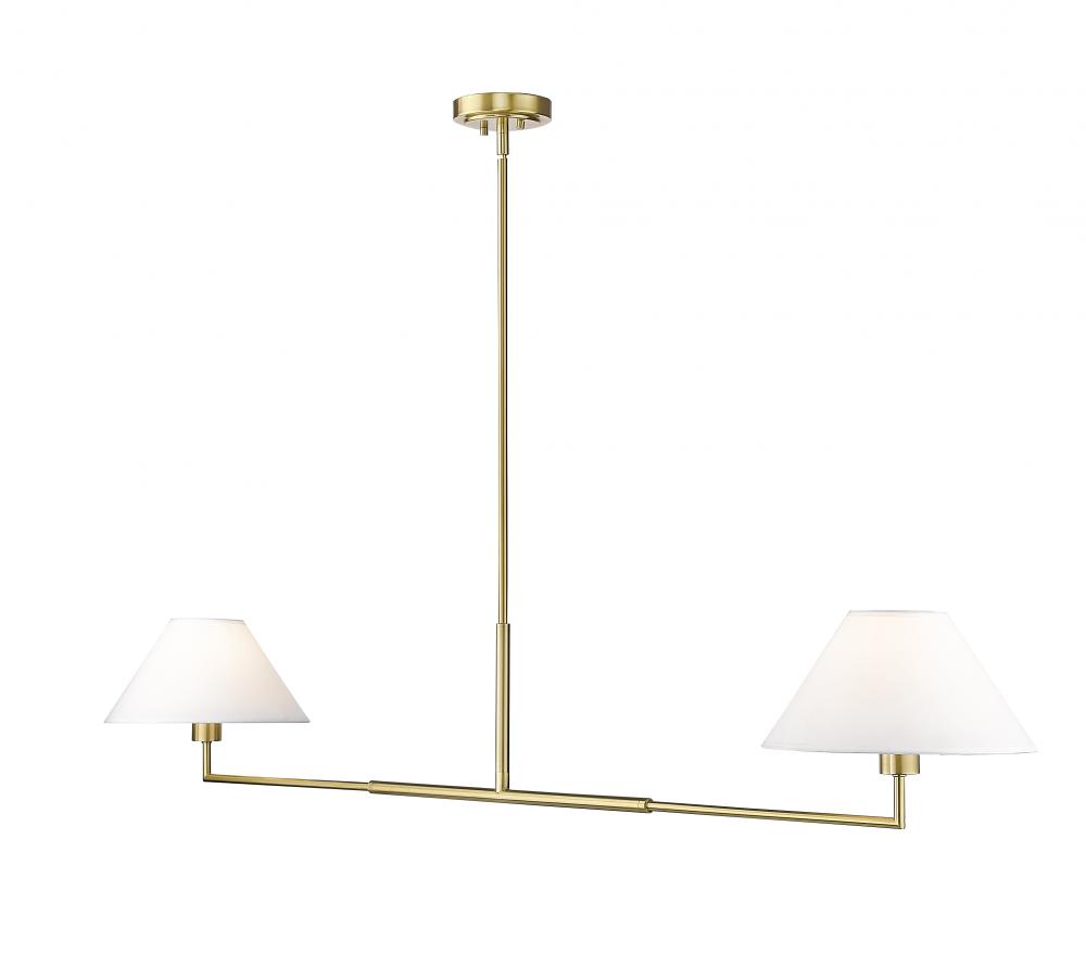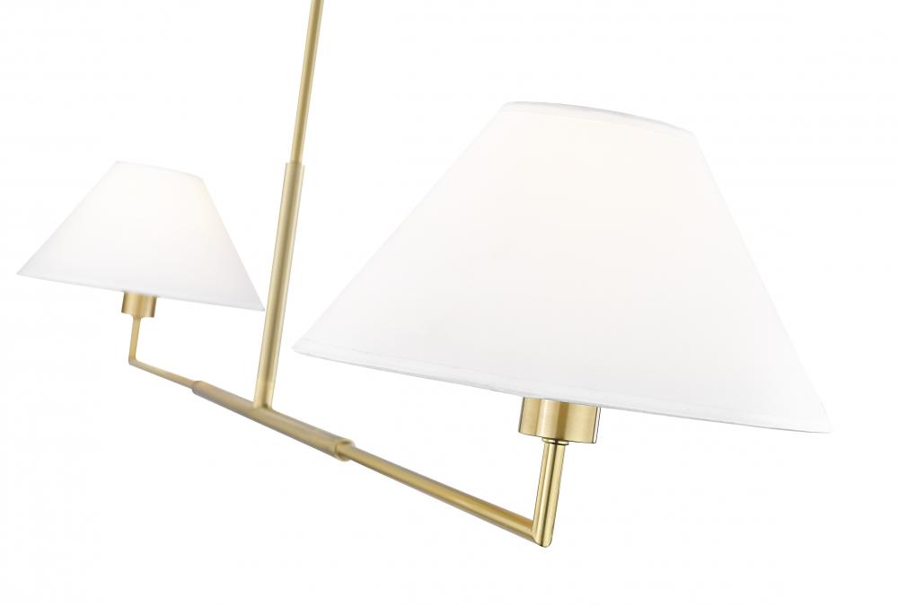 Highlighting modern simplicity and elegance, this chic two-light linear chandelier is stunning over a kitchen island or spanning a living room seating area. Its clean lines are accentuated with a warm luxe gold finish over steel construction, while a pair of white linen empire shades are beautiful and timeless in any room. Casting inviting illumination for tasks and ambiance, this chandelier is a stylish fit in myriad spaces.