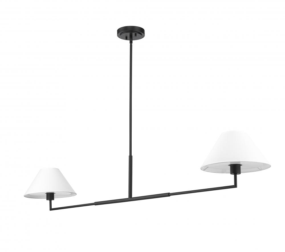 Highlighting modern simplicity and elegance, this chic two-light linear chandelier is stunning over a kitchen island or spanning a living room seating area. Its clean lines are accentuated with a crisp matte black finish over steel construction, while a pair of white linen empire shades are beautiful and timeless in any room. Casting inviting illumination for tasks and ambiance, this chandelier is a stylish fit in myriad spaces.
