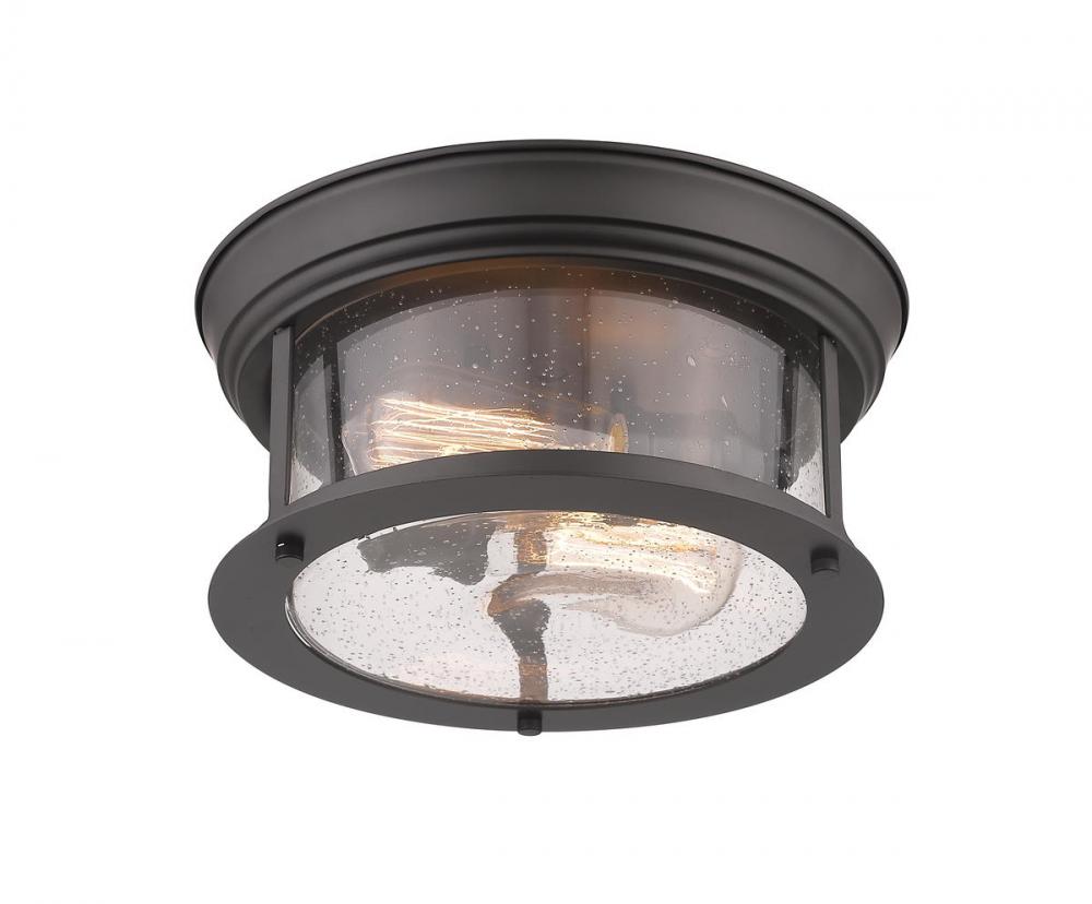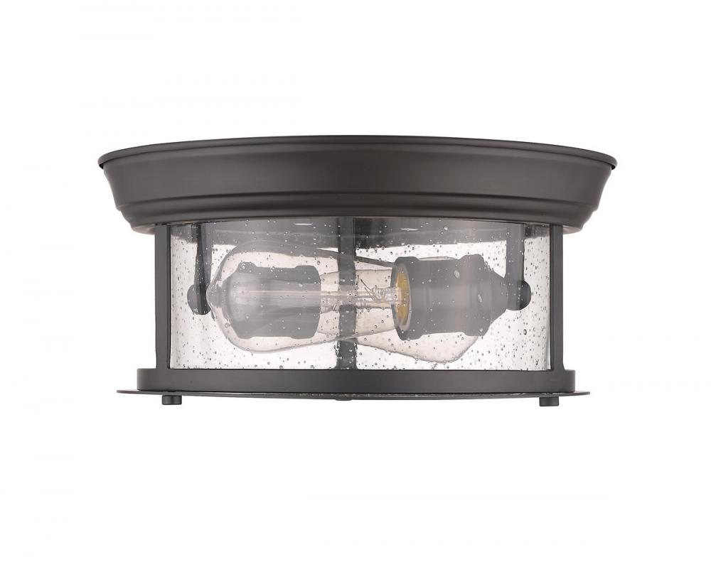 Cool industrial ambiance offers a stylish look to transitional spaces in need of functional, fashionable fixtures. With beautiful Bronze finish metal providing a circular cage-like frame and a wide cylindrical clear seedy glass shade completing its visual package, this two-light flush mount ceiling light wraps up a custom kitchen or living area design.