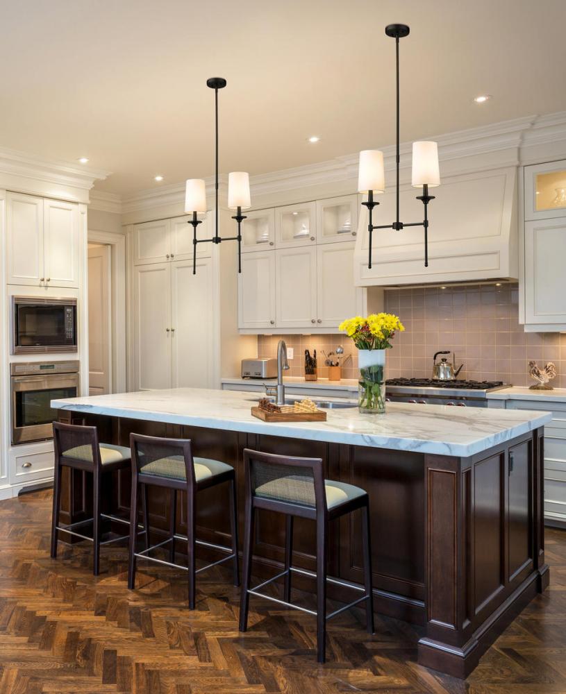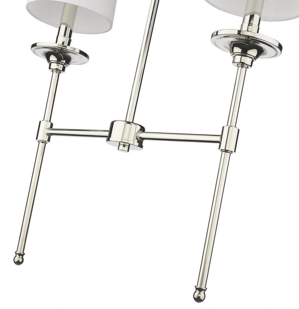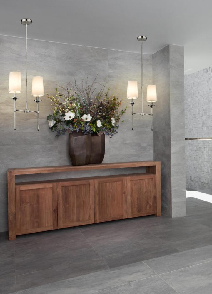 Blending long, slim lines of matte black finished metal with elegant, off-white shades, this two-light chandelier exudes tasteful and timeless style. This sleek fixture from the Emily collection enhances traditional dining d?cor with a classic character and a warm, inviting glow.