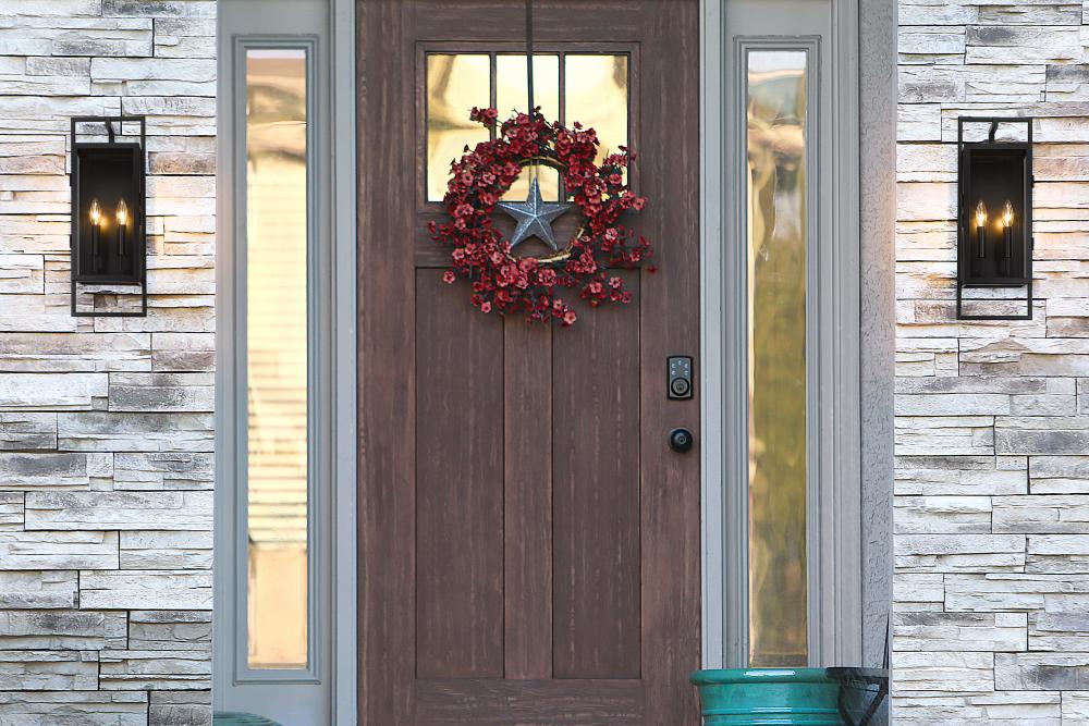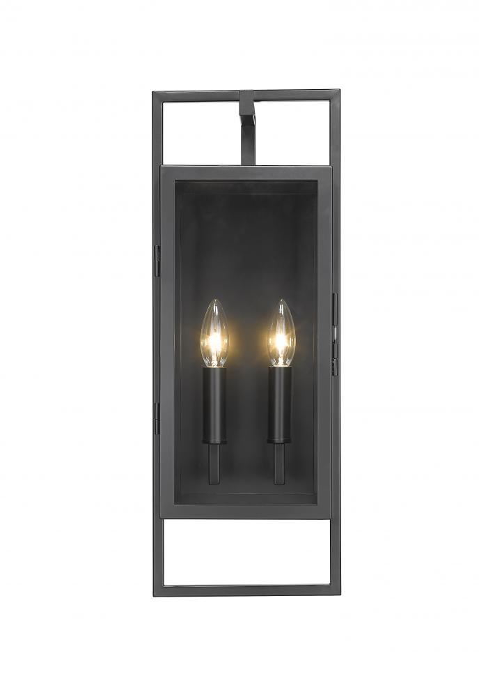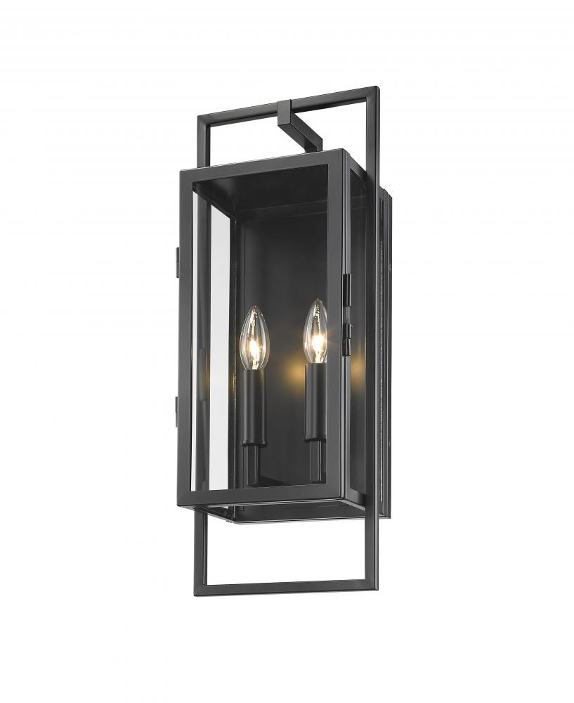 An inspiring modern motif borrows from clean linear design to create the Lucian two-light outdoor wall sconce. Dress up a patio or structural wall with the geometric aesthetic of a classic fixture crafted of black finish steel. A layered profile with clear glass fronting offers a fresh glimpse of charming candelabra-style bulbs.