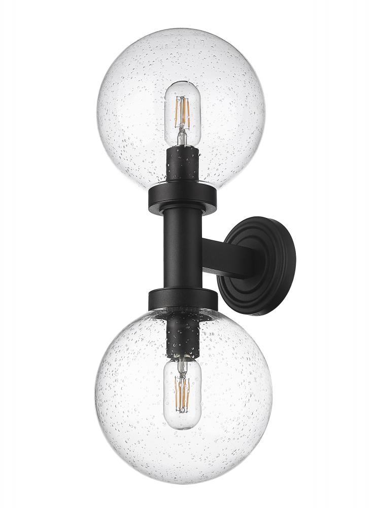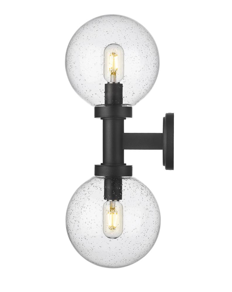 Lighting plays into a d?cor scheme focused on sheer style. From the Laurent collection comes a two-light outdoor wall sconce with a linear and circular blend of silhouetting. A simple yet tasteful black finish aluminum frame and wall plate hosts dual globe shades fashioned of delicate clear seedy glass.