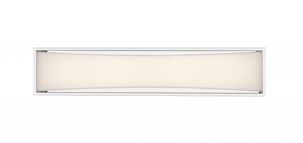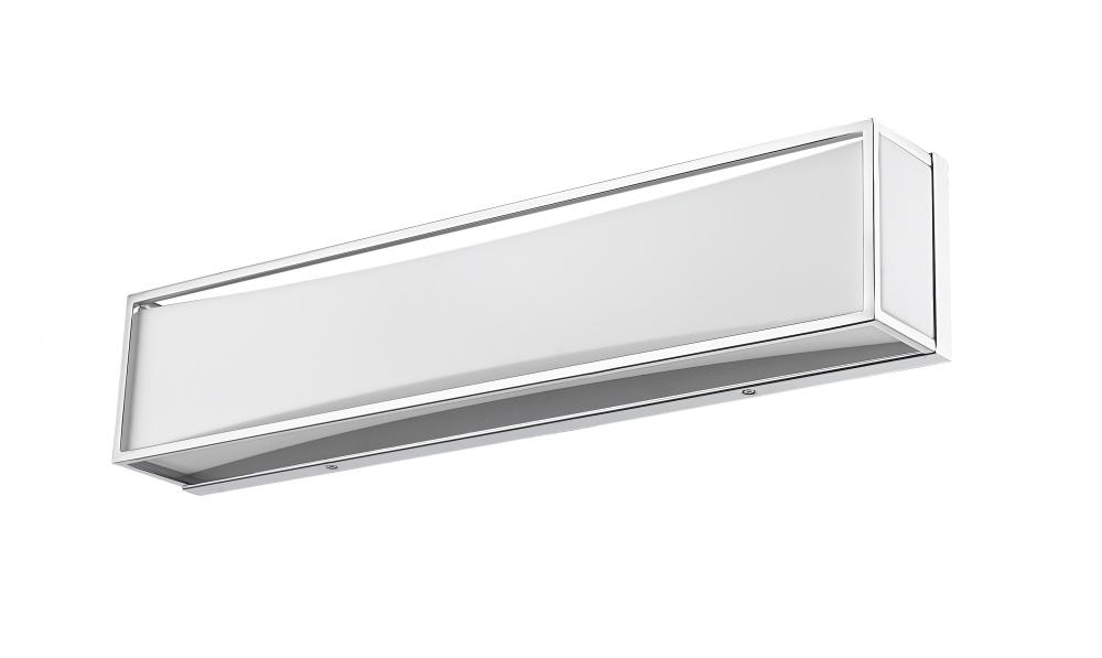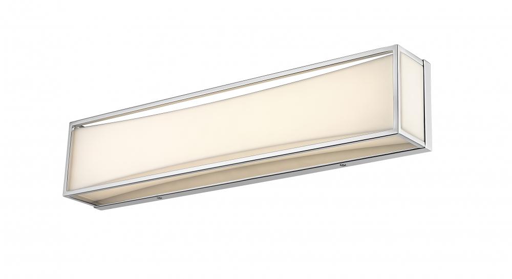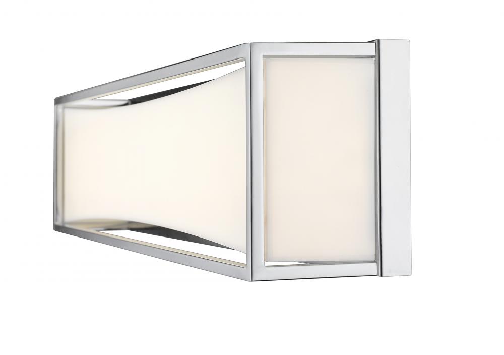 Sleek, gleaming lines of chrome finish metal give this two-light vanity light a clean, modern look. Perfect for a powder room, it boasts a delicate, frosted white shade that diffuses the light into a soft, graceful glow.