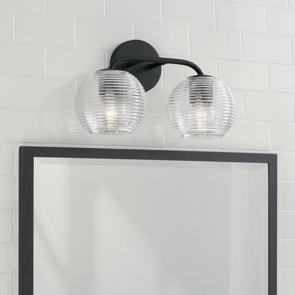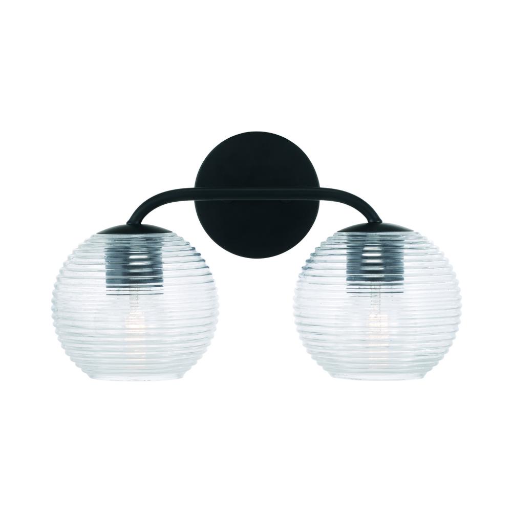 15.5"W x 9.5"H 2-Light Vanity in Matte Black with Clear Ribbed Glass
