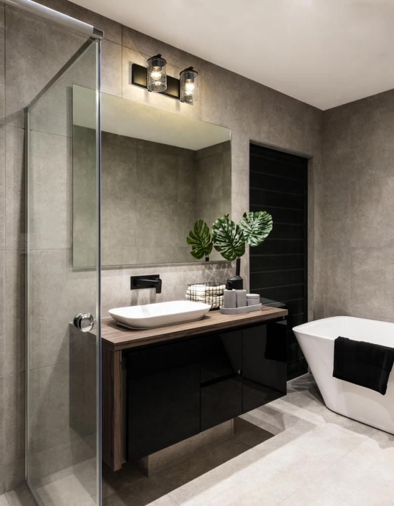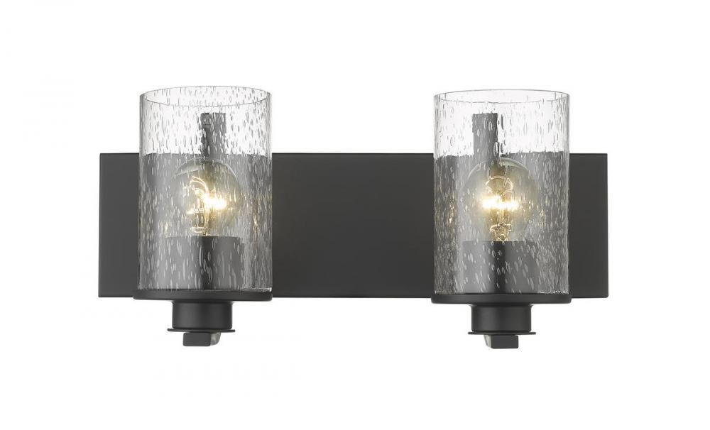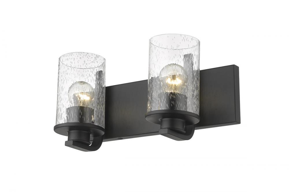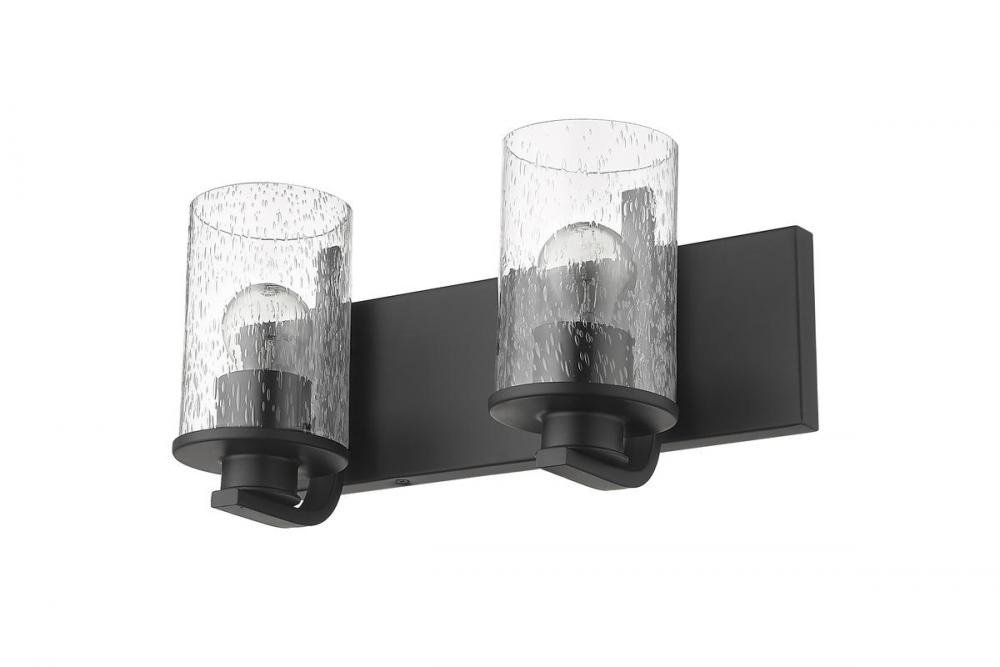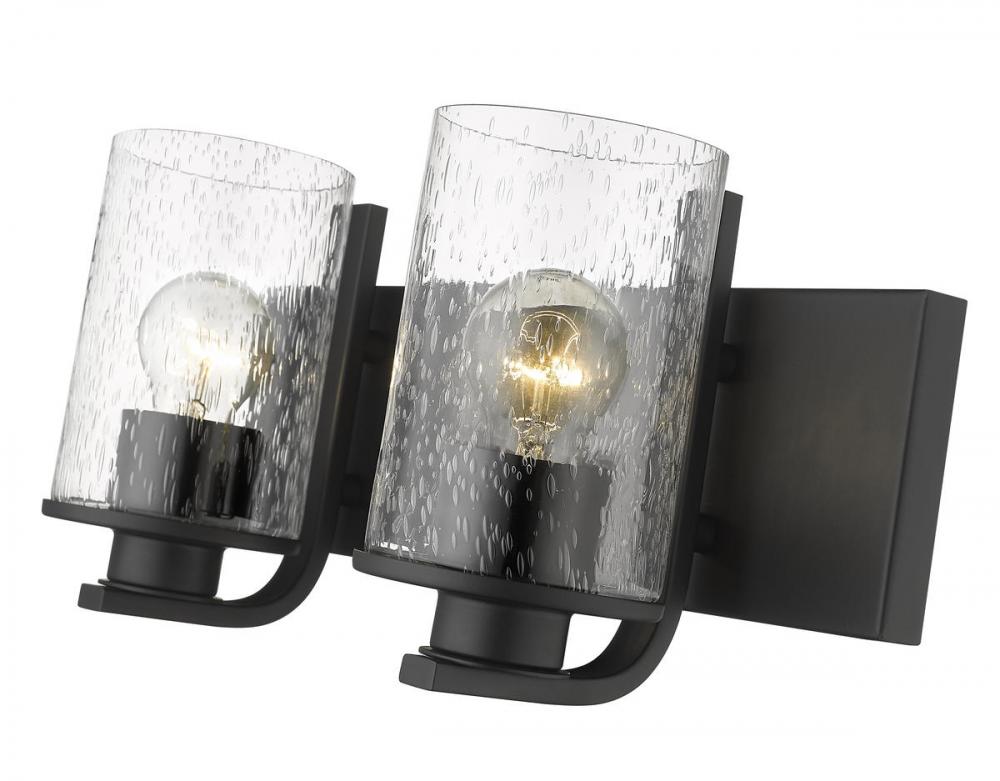 The romantic effect of clear seedy glass adds a custom design element to this contemporary two-light vanity, a great choice for illuminating modern bath and dressing spaces. Glass shades embellish and contrast with the minimalist yet stylish look of steel frames and mounts made of bold matte black finish steel. This two-light vanity light from the Beckett collection dresses up a compact bath space with sophistication.
